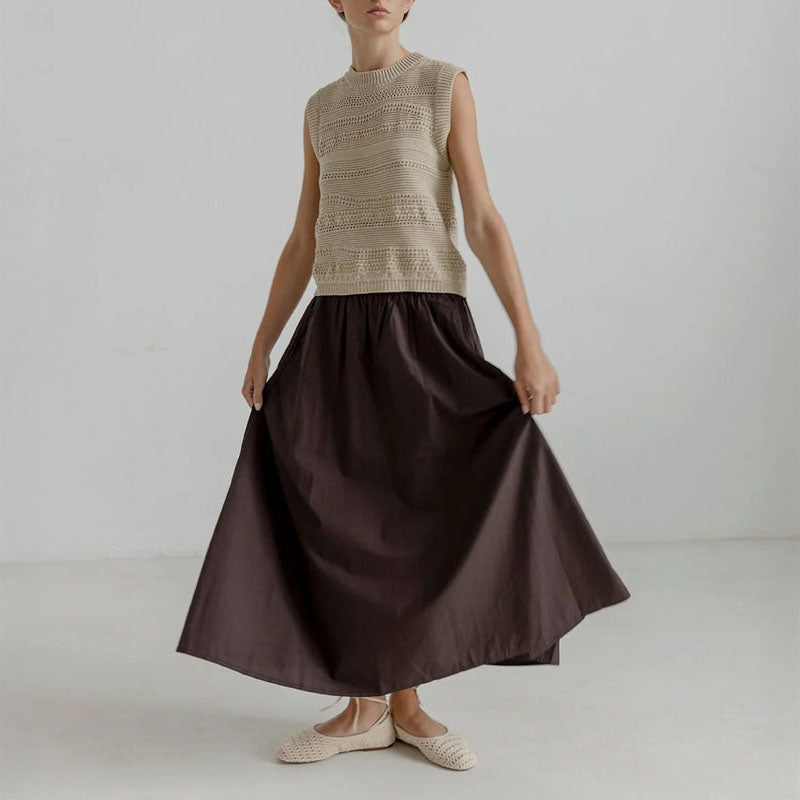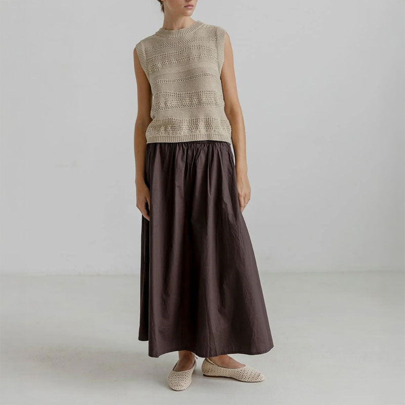 Aggie is a soft cotton waistcoat crafted from a blend of Ecotec cotton and acrylic. Made in Italy, it features textured knitted patterns, a crewneck, and ribbed trim for a refined finish. Style it with jeans and sandals for a cool, chic look, perfect for warm summer days.