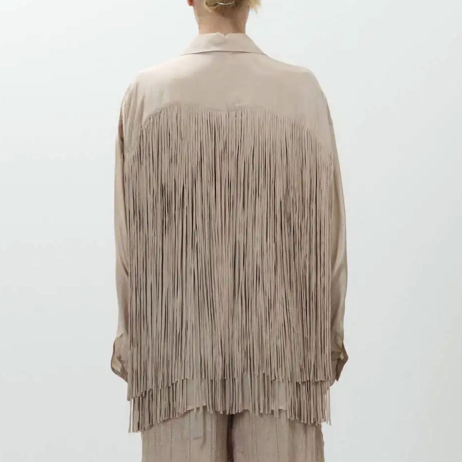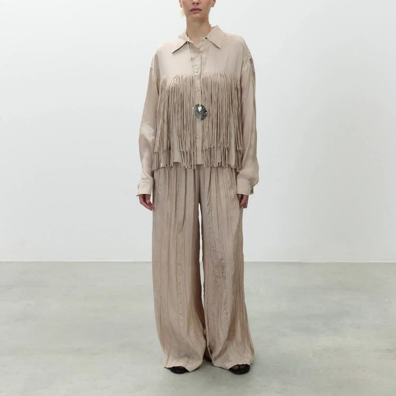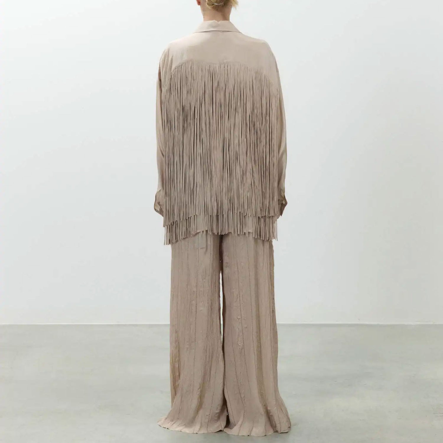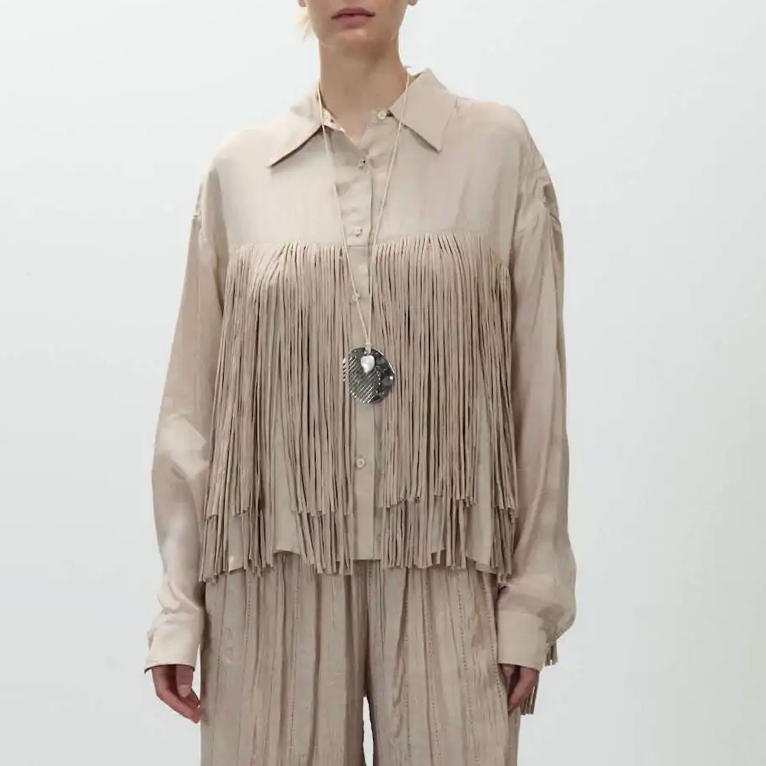 The ALYSI Viscose Trim Shirt in Powder brings understated elegance to your everyday wardrobe. Crafted from 100% viscose, it features delicate fringe detailing that adds a subtle touch of texture and movement. Designed with a classic point collar, long sleeves, and a button fastening, this shirt offers a polished yet relaxed silhouette, perfect for both workdays and weekend styling.