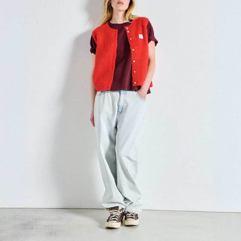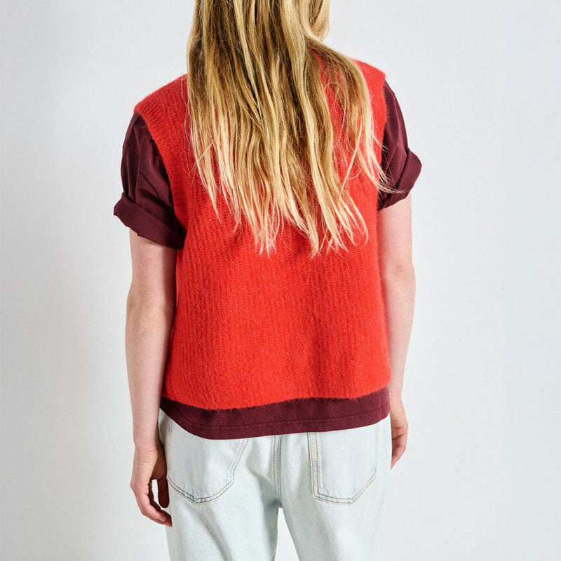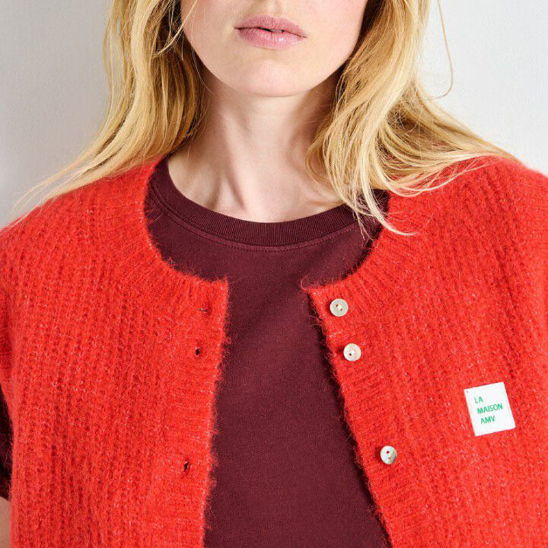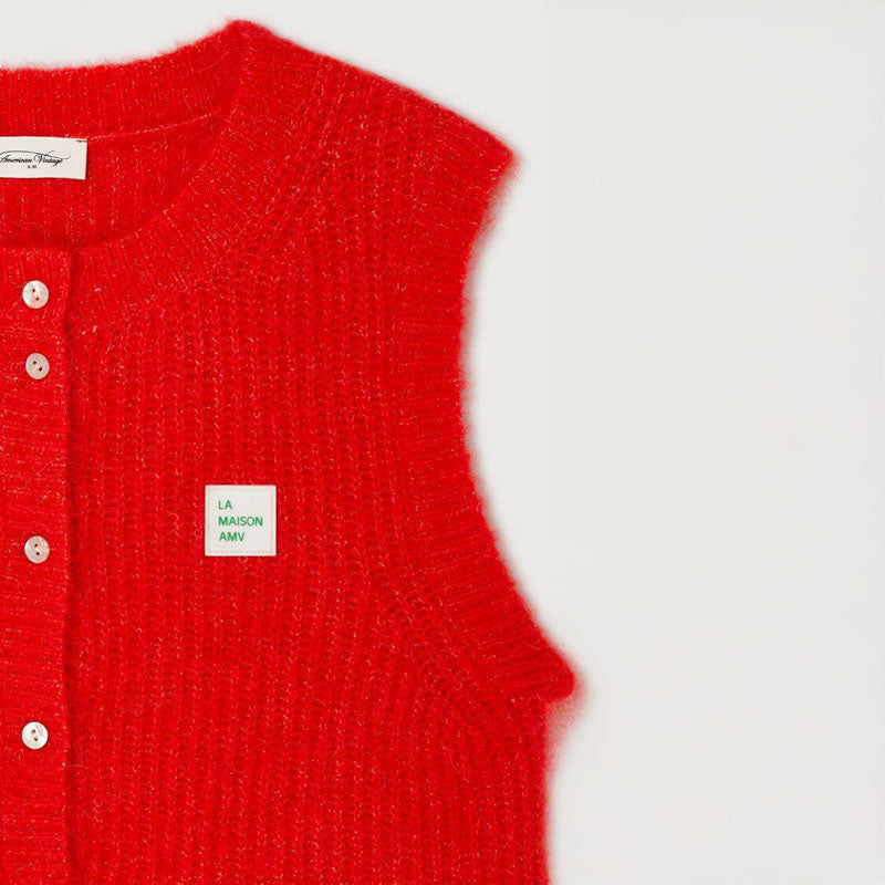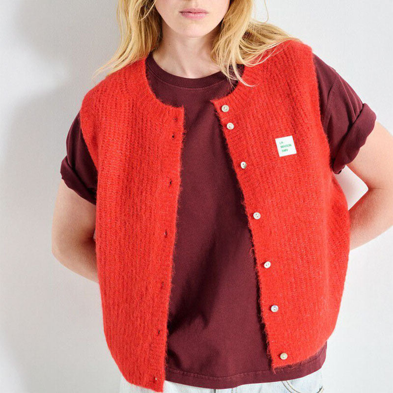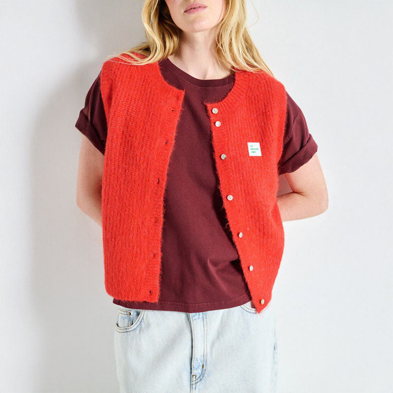 We’ve been counting down the days for this one. This sleeveless, round-neck, buttoned cardigan from American Vintage is a staff favourite —for good reason. With its rich red hues and effortlessly versatile silhouette, it’s the perfect layering piece to take you from season to season in style