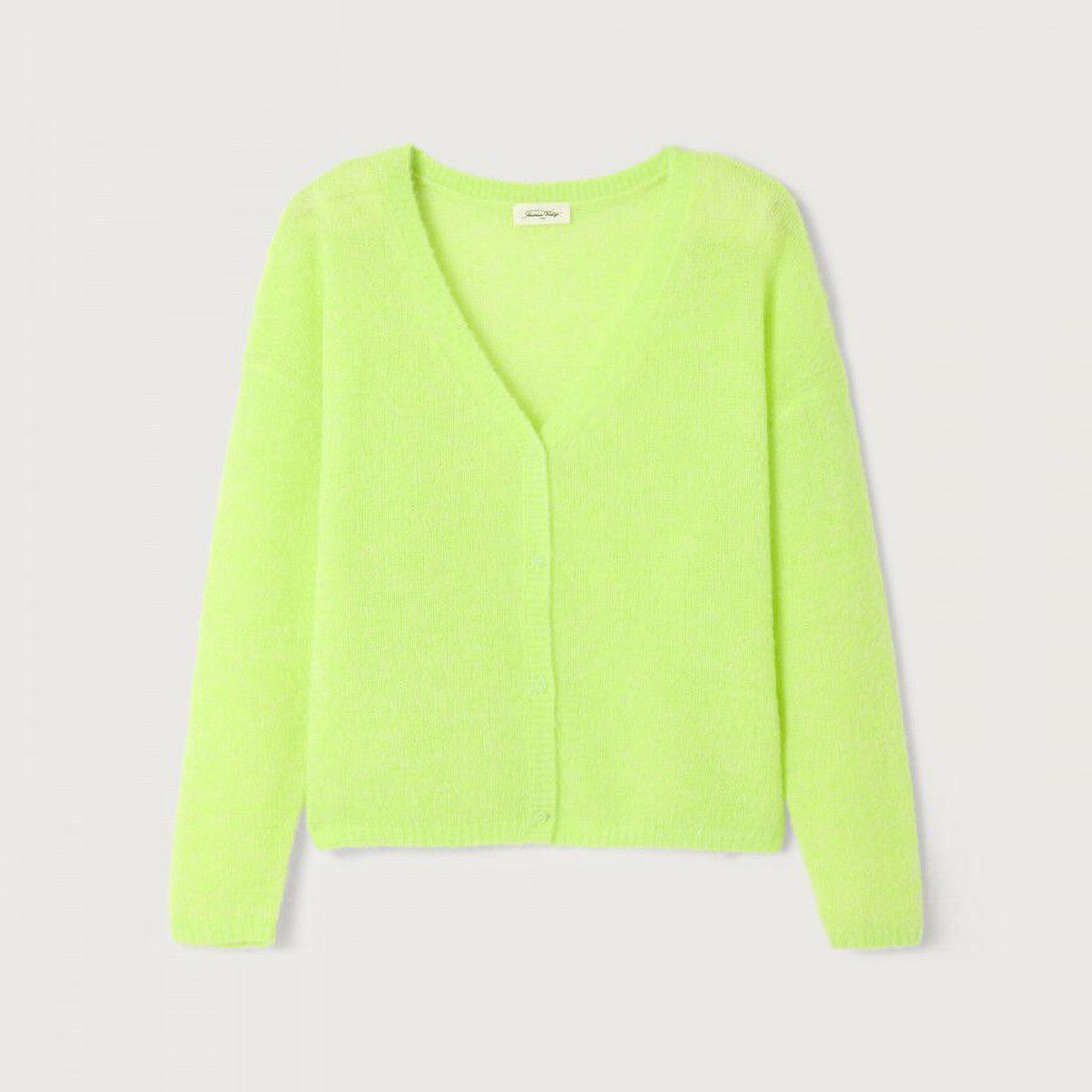 The American Vintage Nuggy Cardigan stands out this season in a vibrant Citronnade/Fluro. Crafted from a soft, cosy wool blend, this cropped cardigan has a relaxed fit with a V-neckline, long sleeves, ribbed trims, and a central button closure. Dropped shoulders add a contemporary, laid-back feel.