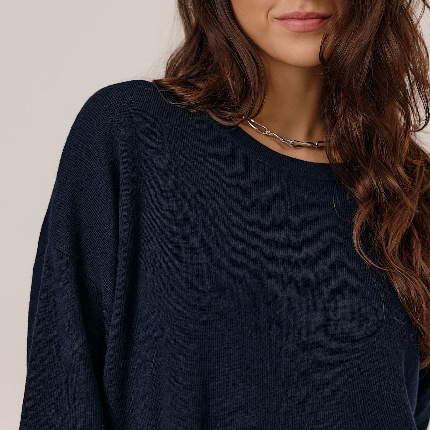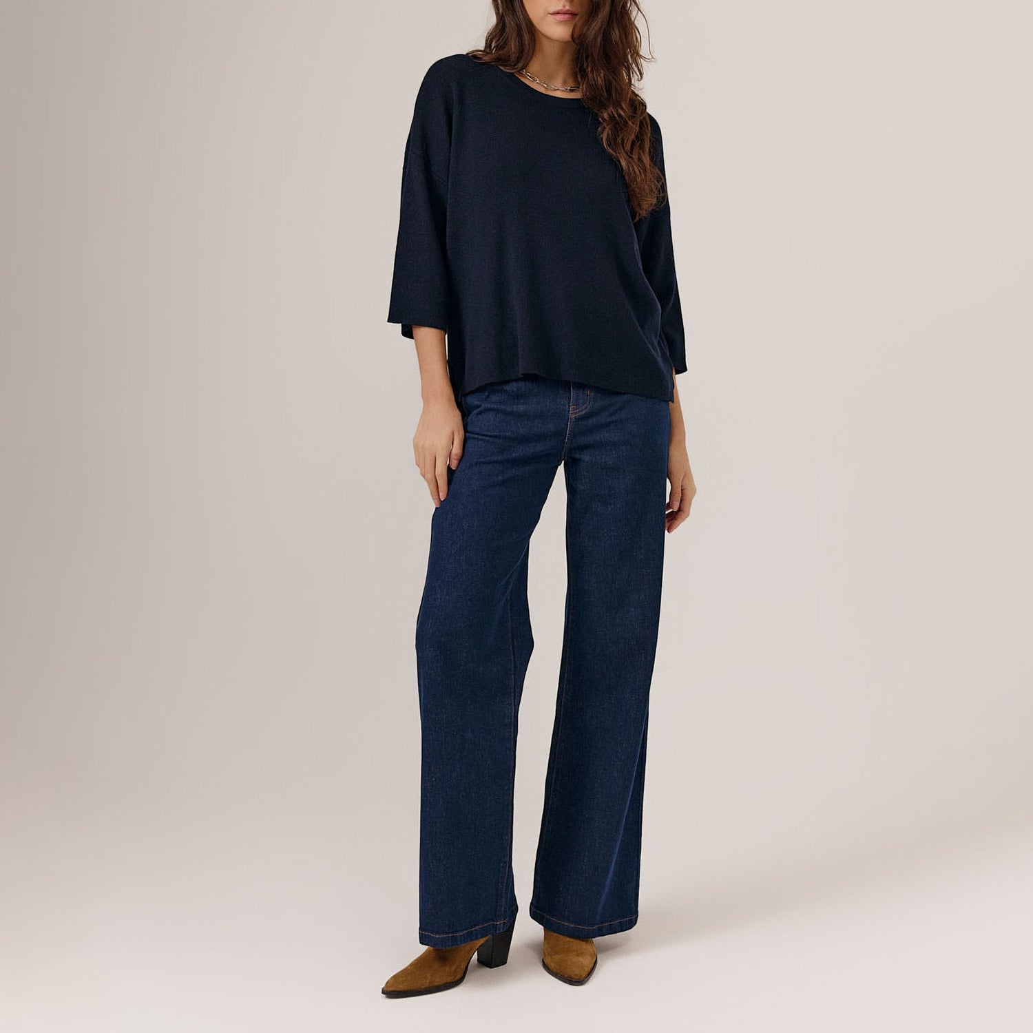 A simple and timeless crew neck sweater with three-quarter sleeves, crafted from soft-touch fabric. Features a relaxed, loose fit with a straight hem for effortless everyday style.
