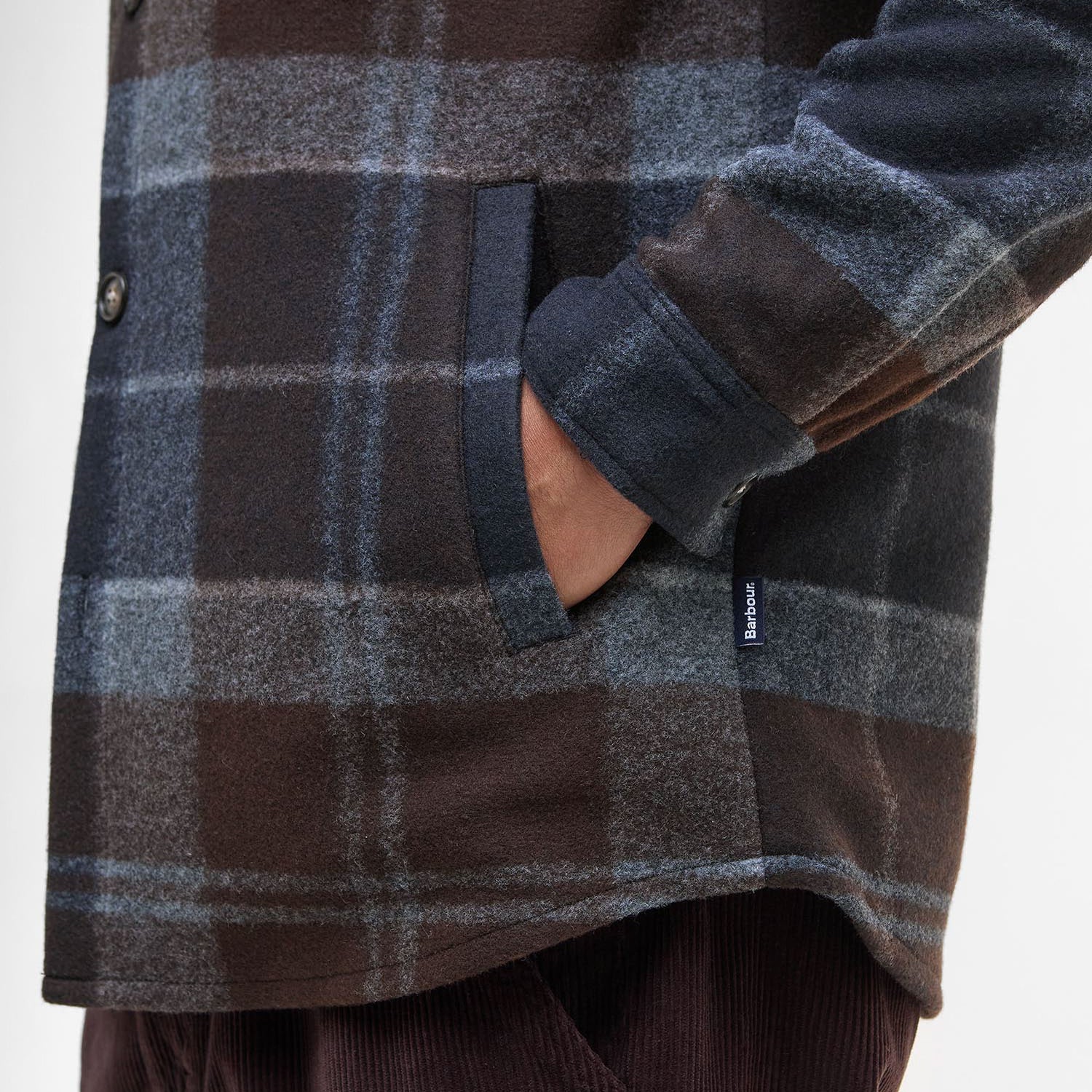 Barbour woven flag label to wearers left side seam.