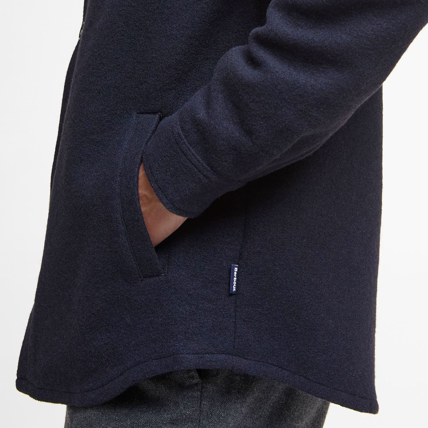 Barbour woven flag label to wearers left side seam.