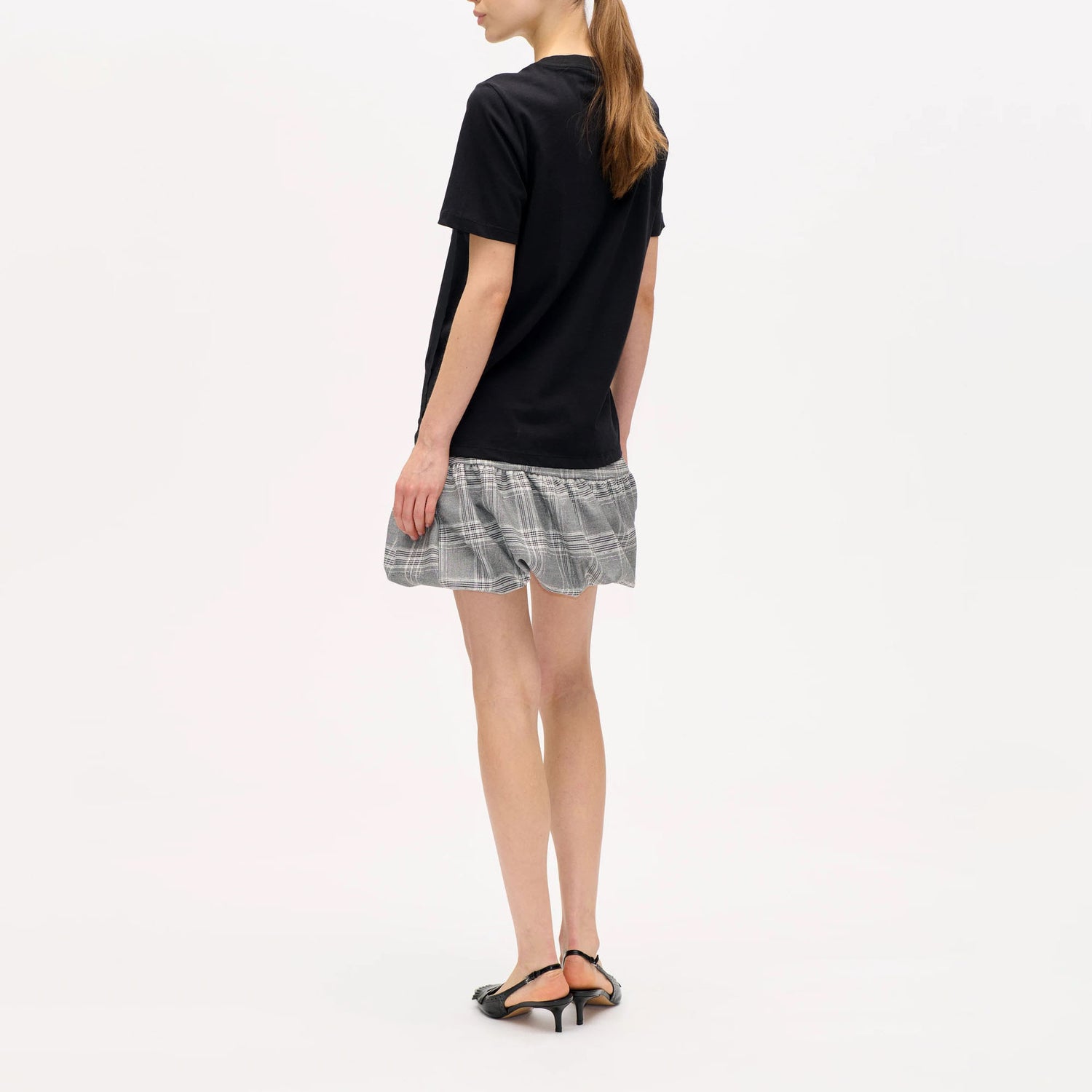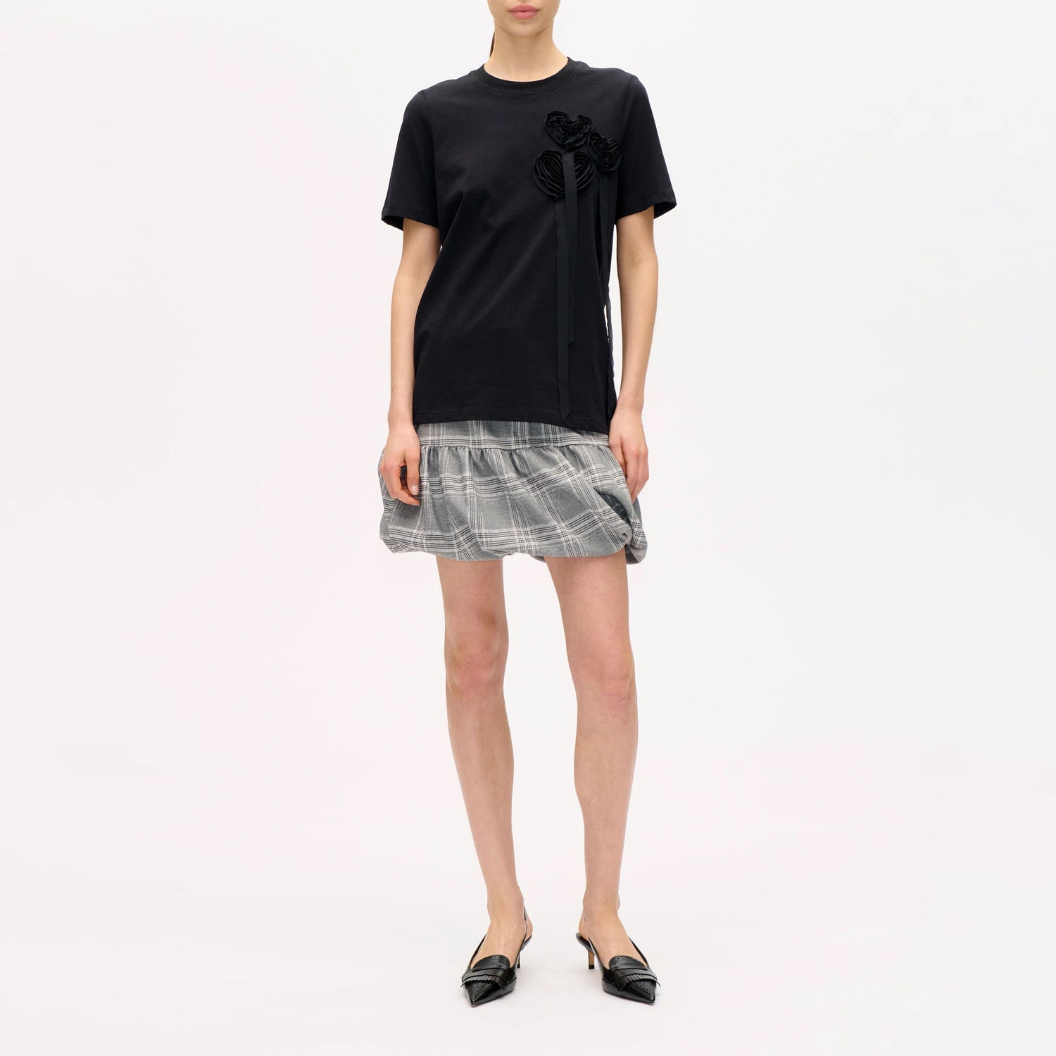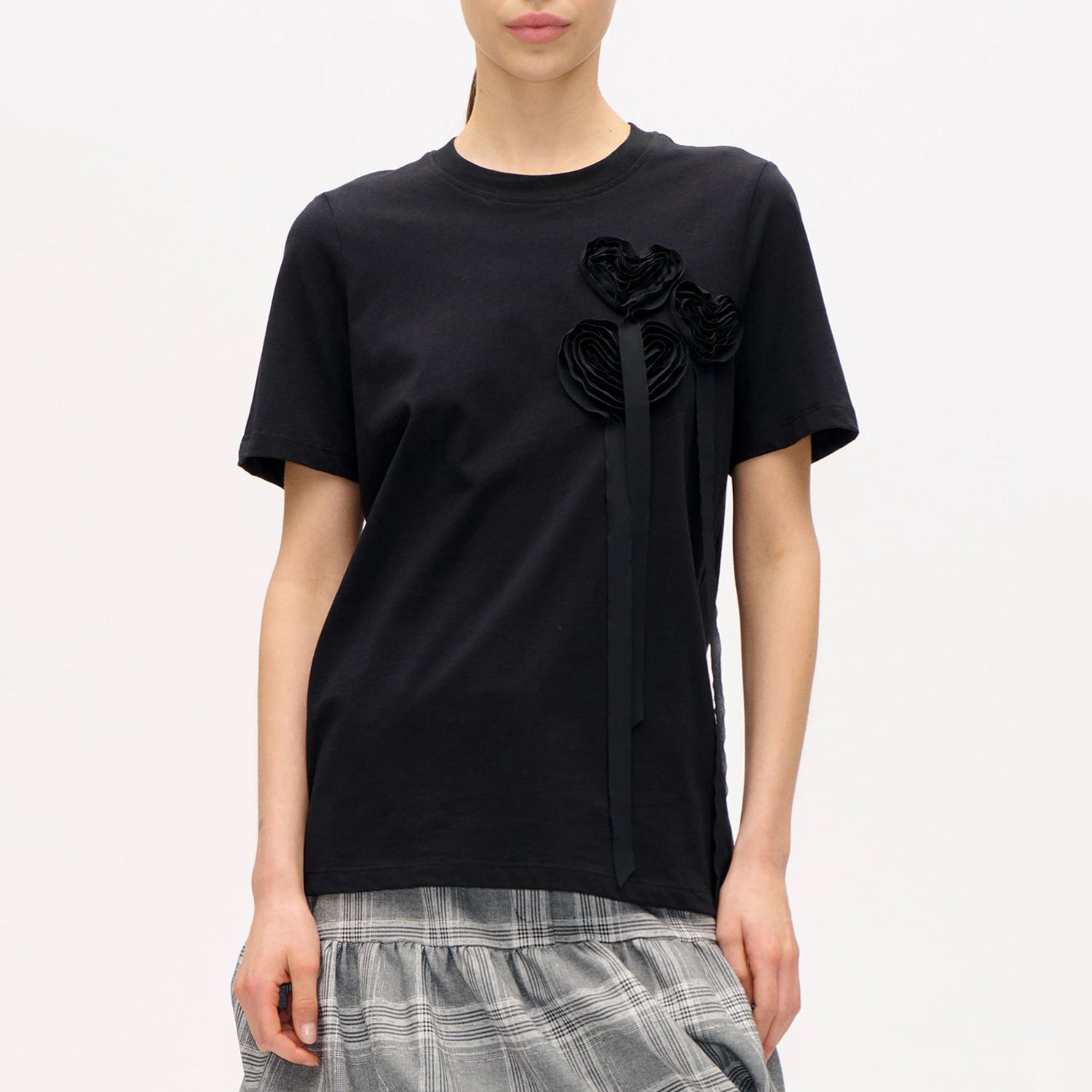 The Jawi T-shirt features elegant heart-shaped rosettes on the chest, complemented by flowing fabric details that bring a charming flair to this otherwise simple tee.