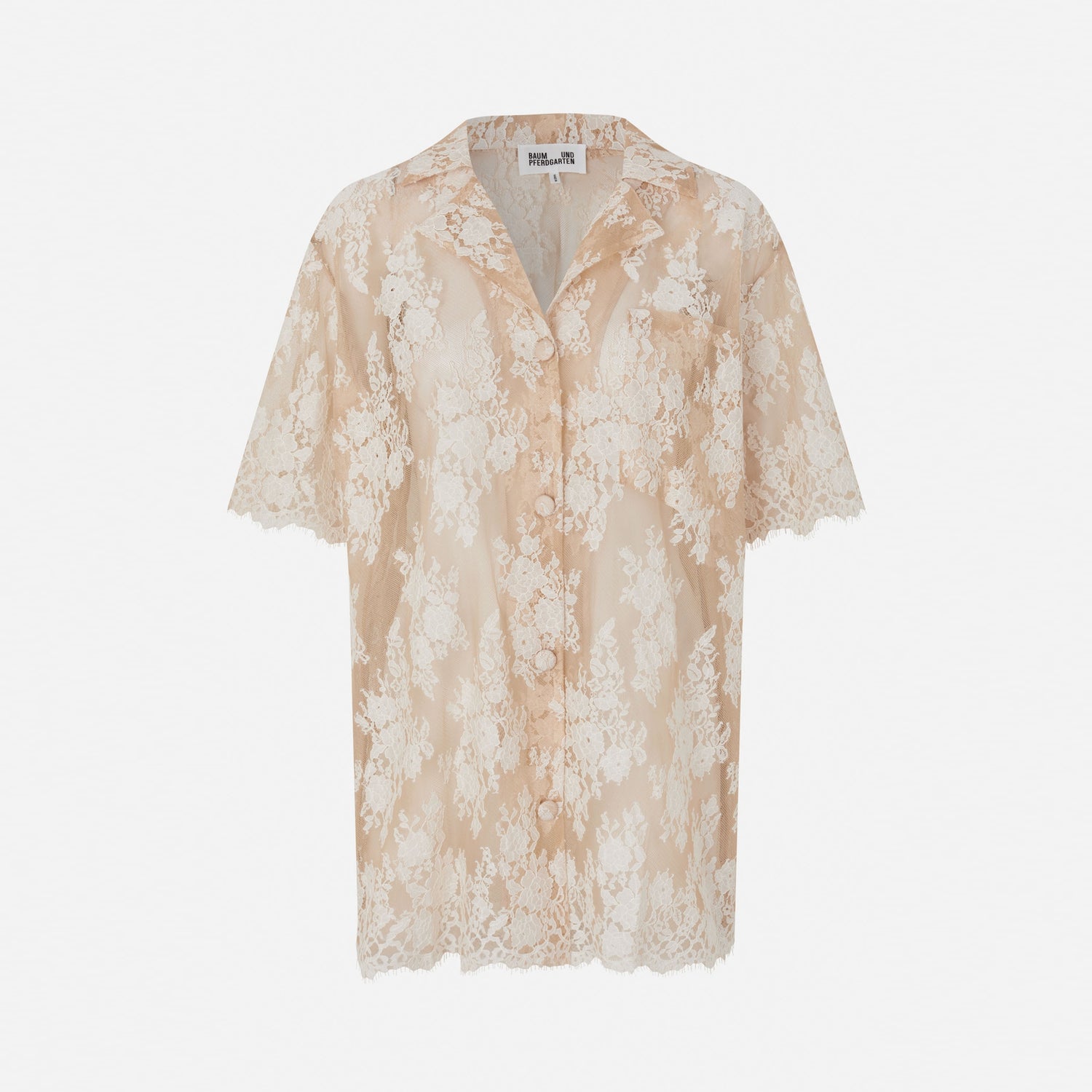 The Mannica Blouse is a sheer two-toned lace piece, designed with a boxy fit. The blouse has short sleeves, dropped shoulders, a classic collar, a chest pocket and button closure. Wear it with denim or dress it up with a skirt for that gool girl scandi look!