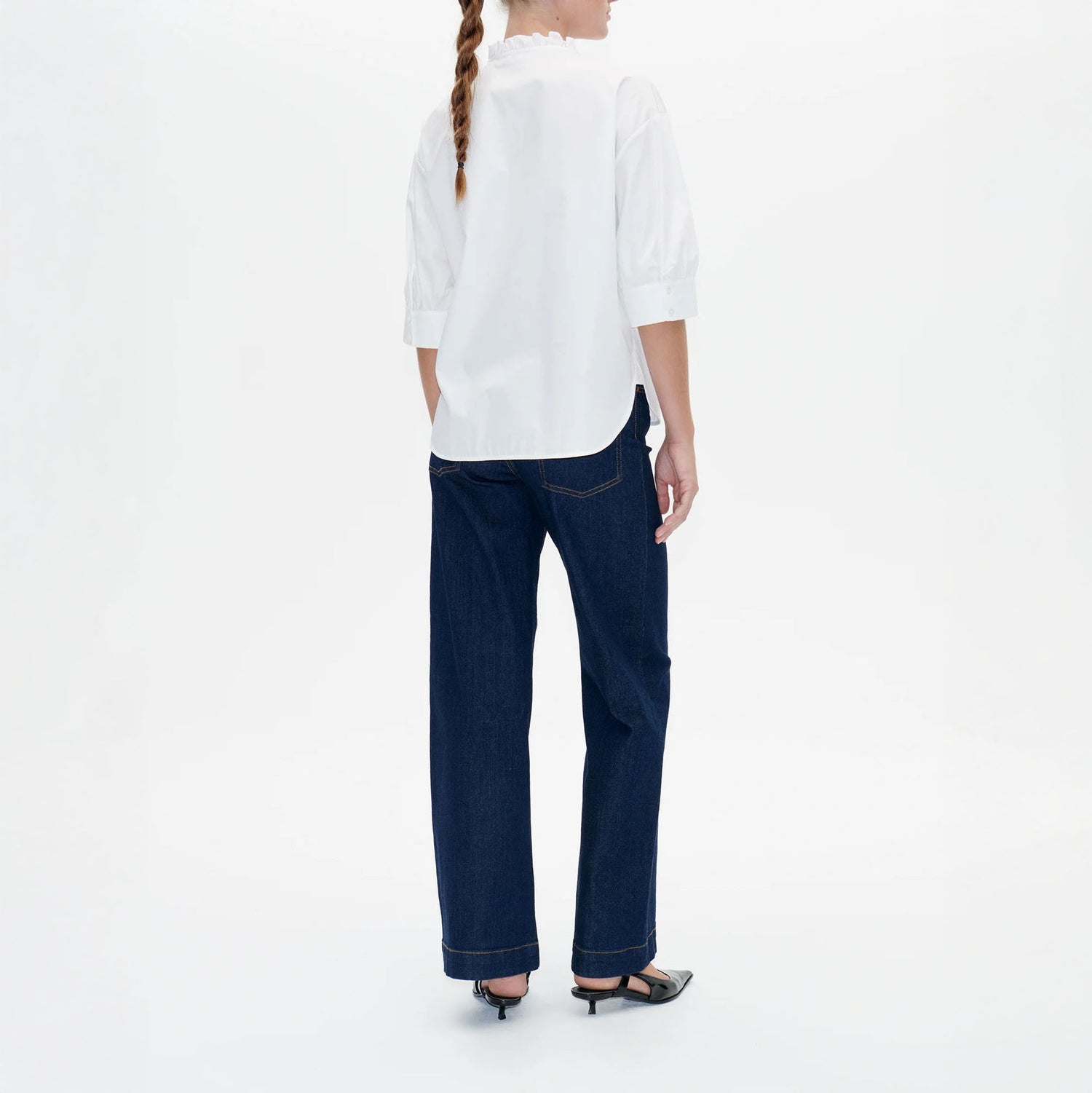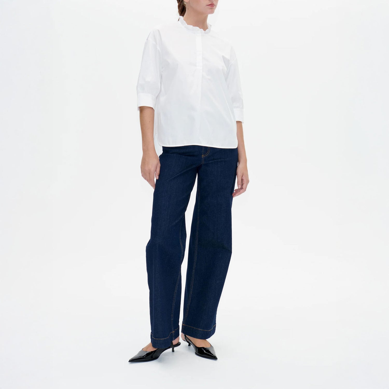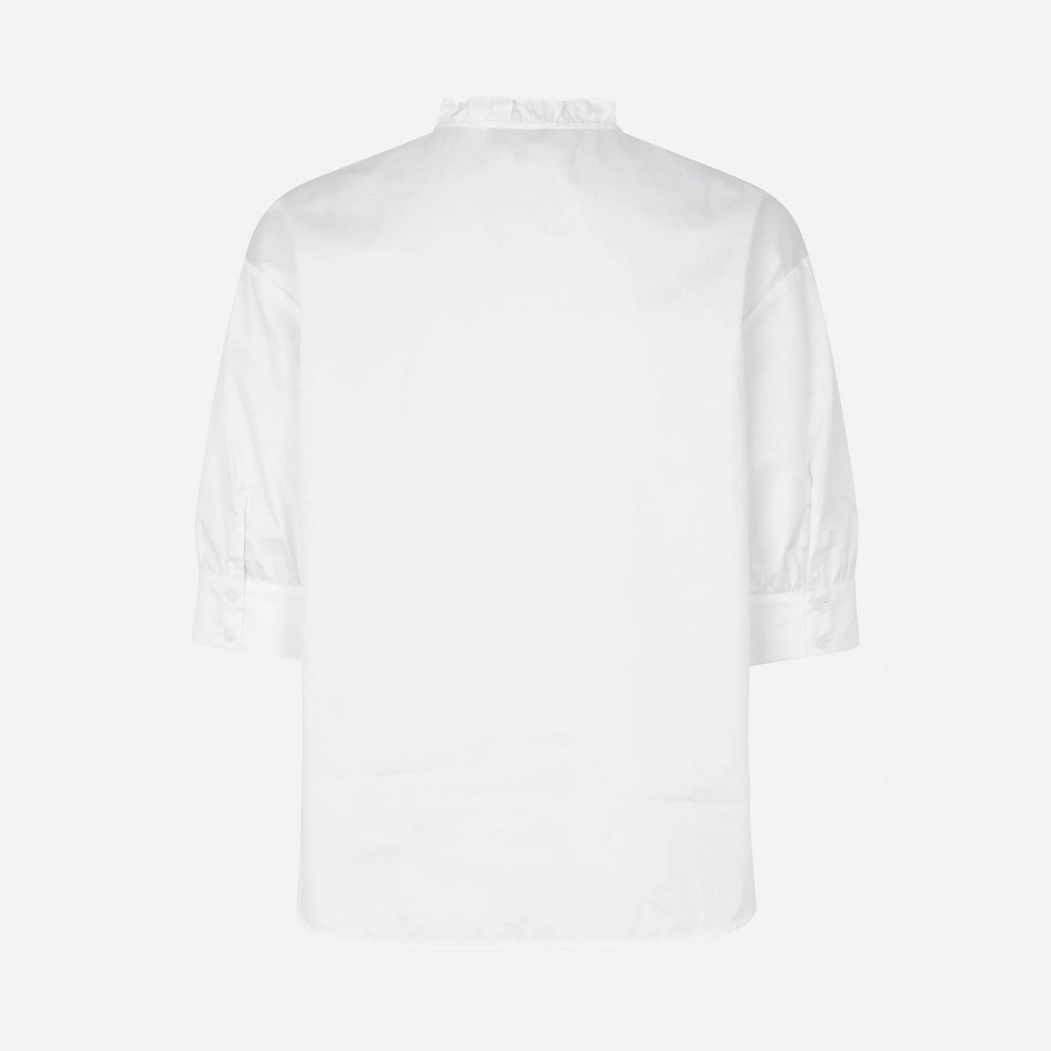 The Merelle Blouse is a beautifully considered wardrobe staple, crafted from organic cotton with subtle, elevated detailing. Featuring a gently ruffled high neckline and soft, dropped shoulders, it offers a relaxed silhouette with just the right touch of femininity.