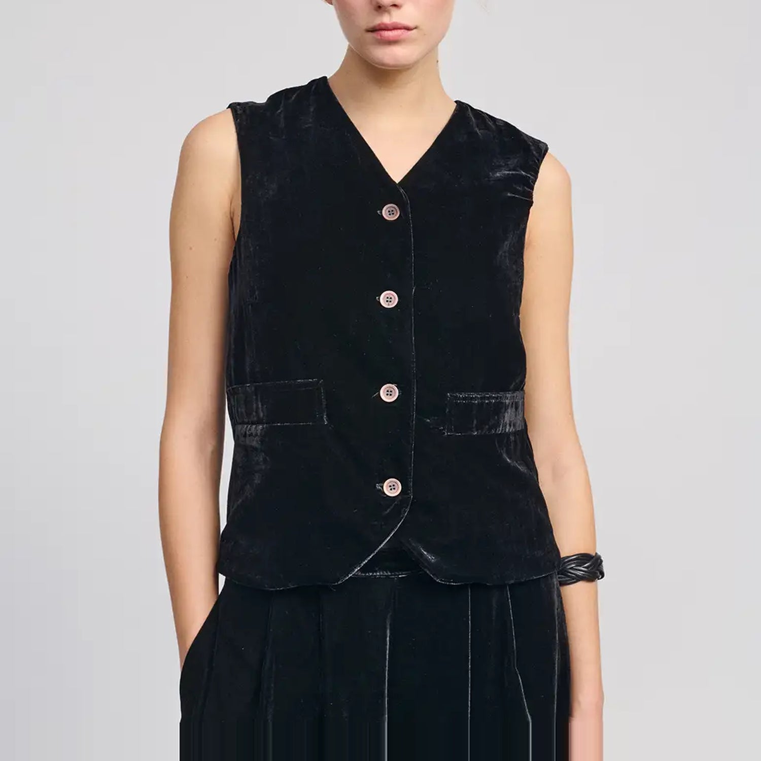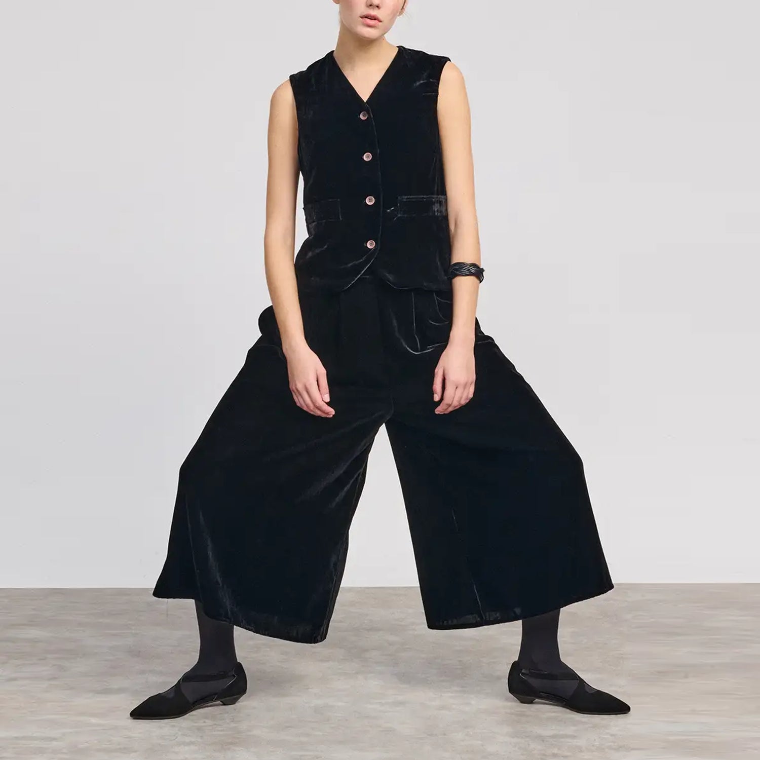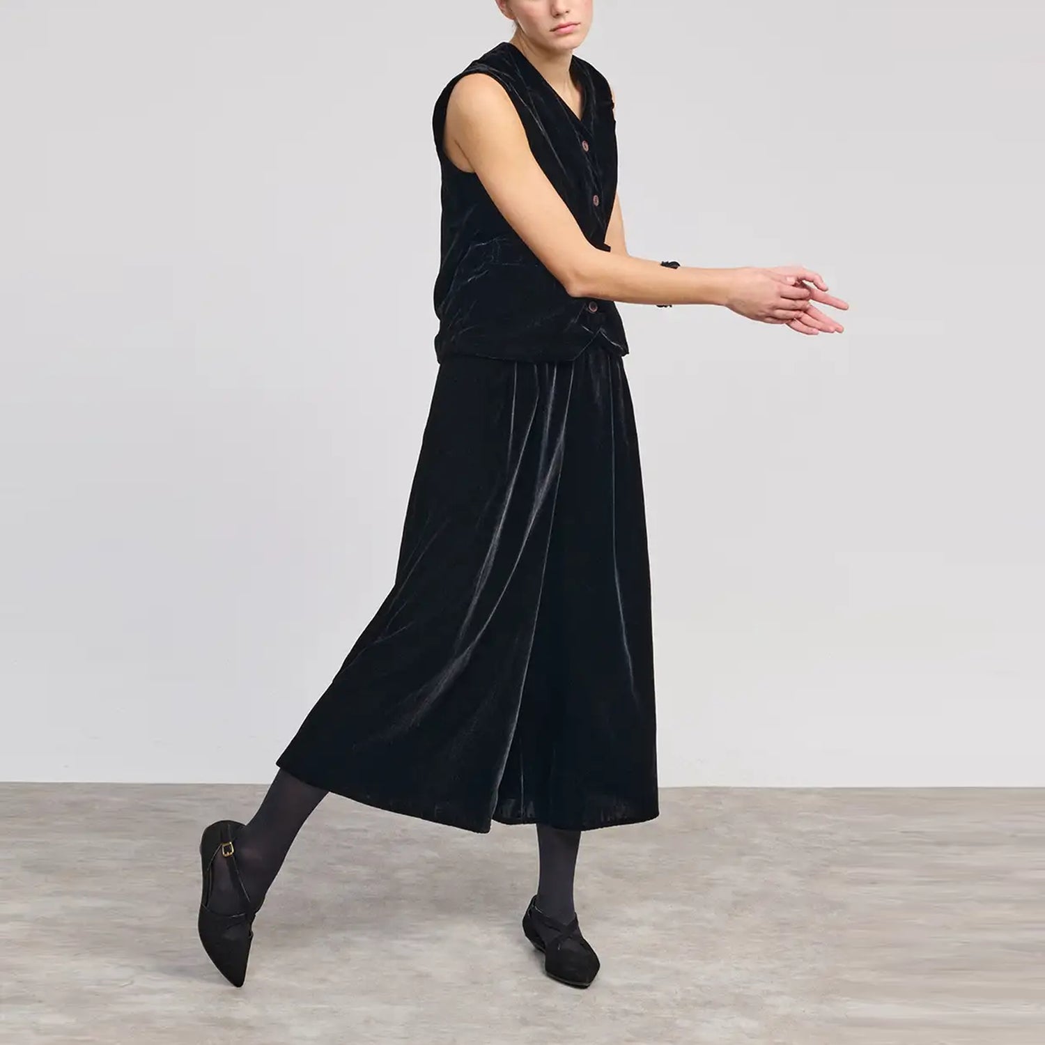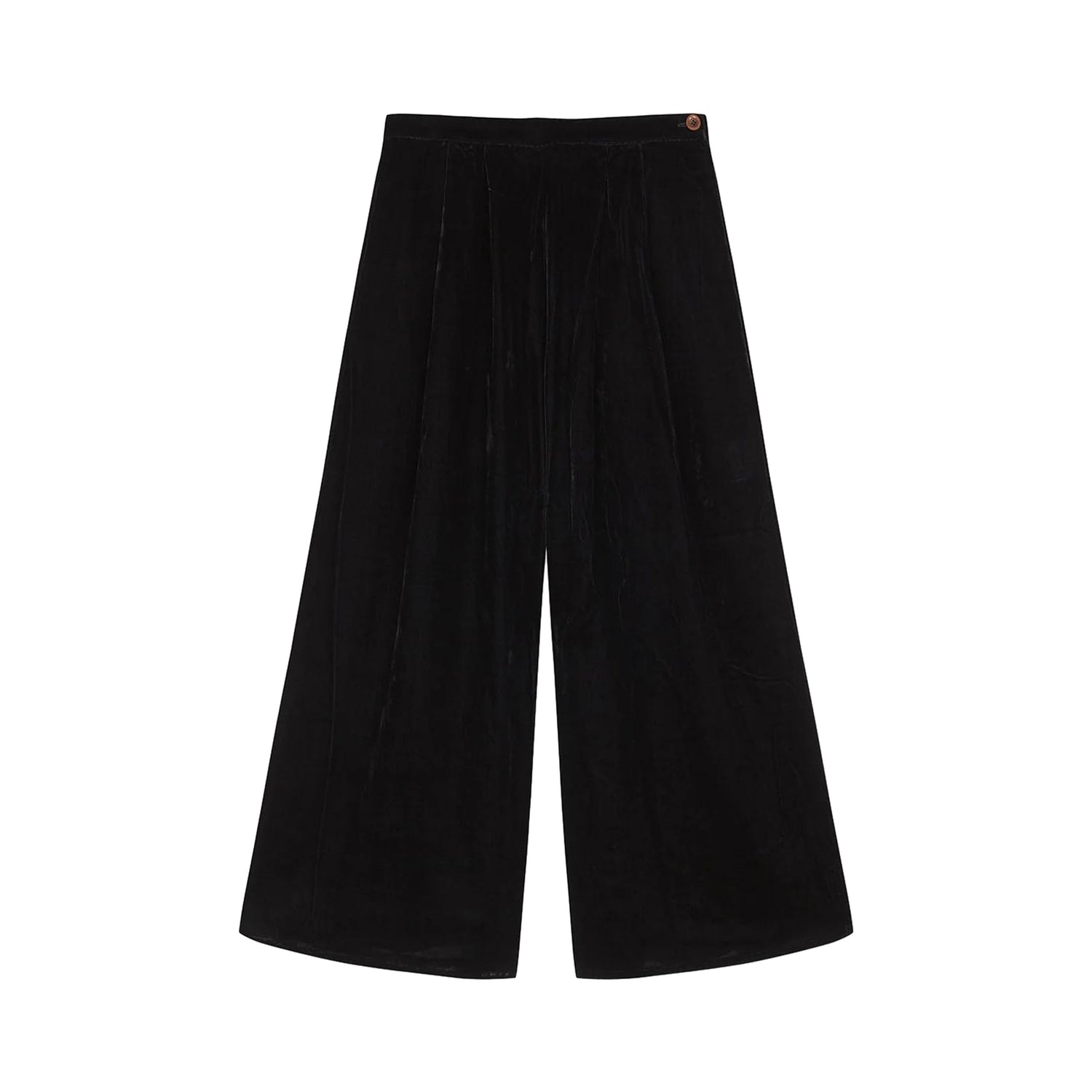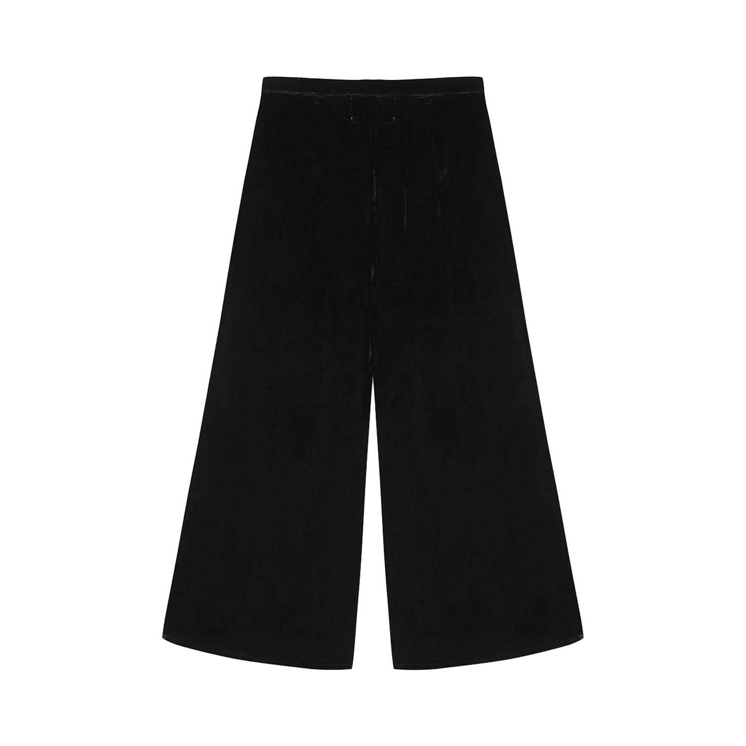 Effortlessly elegant, these wide-leg velvet trousers are crafted in Spain from a soft blend of 75% rayon and 25% nylon. Designed with a loose, midi-length cut, they feature an invisible side zip with button closure and subtle dart detailing at the back for a flattering fit.