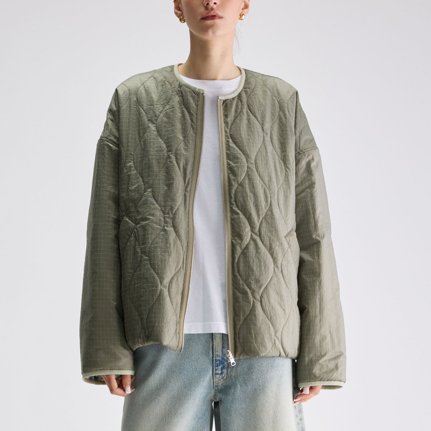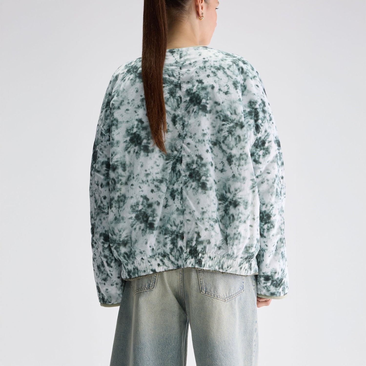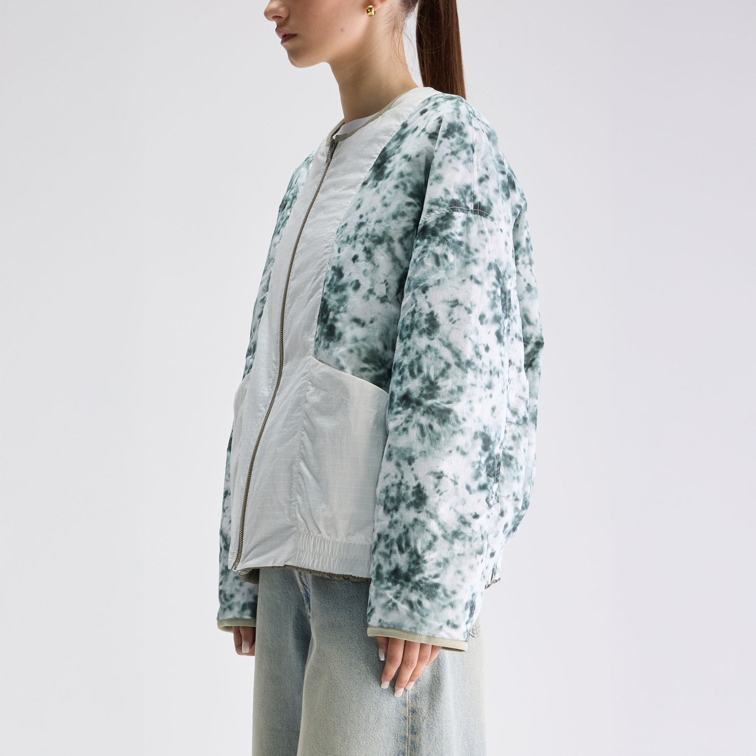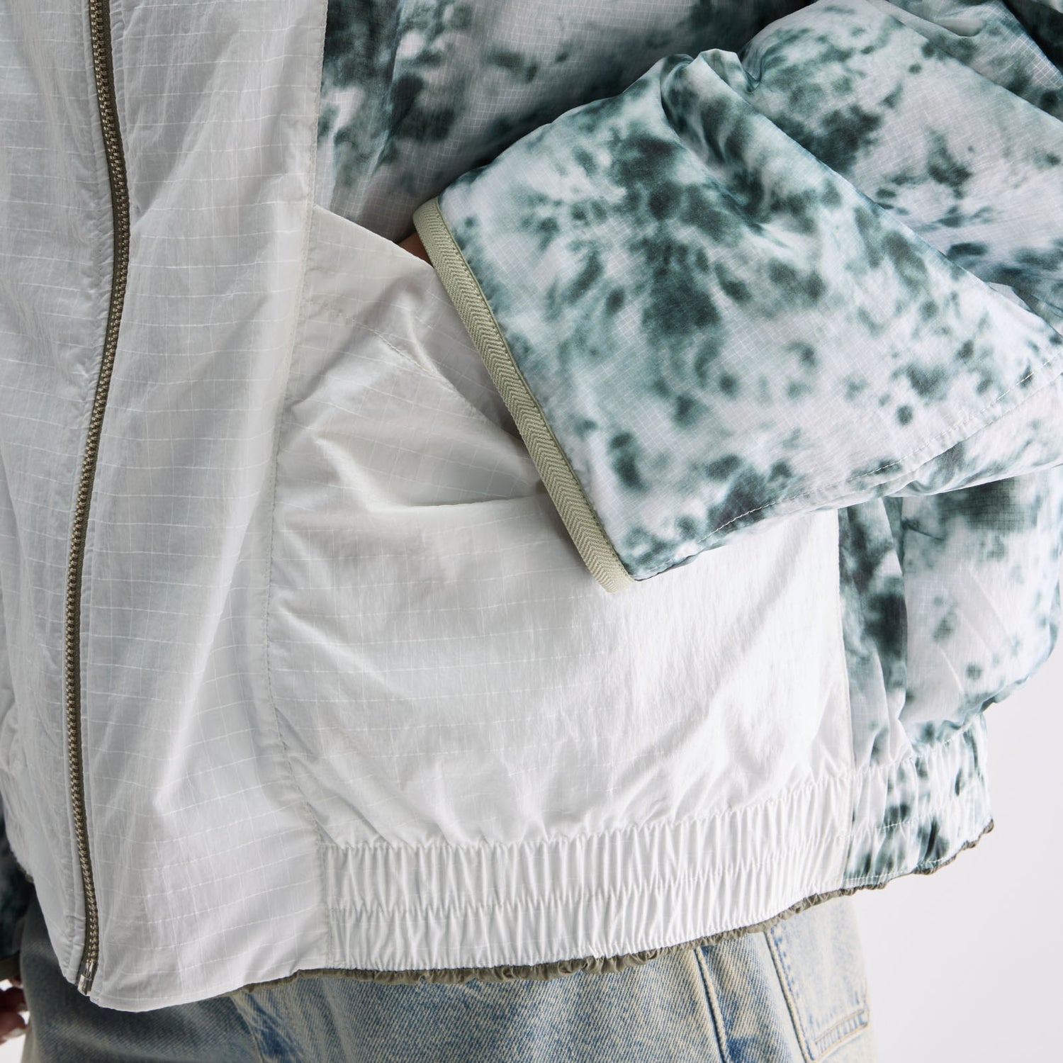Reversible relaxed jacket with quilted khaki texture on one side and tie-dye panels on the other, finished with an elasticated hem
