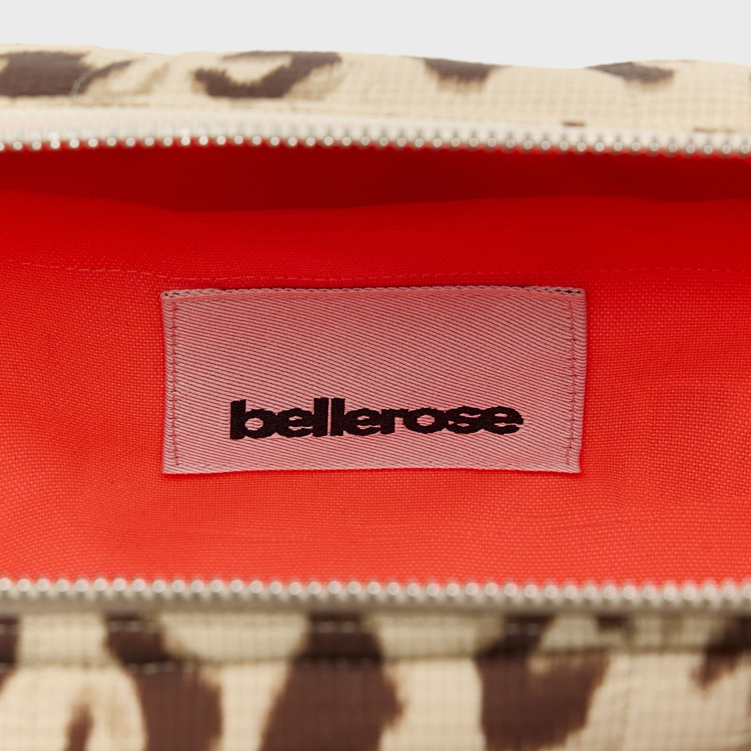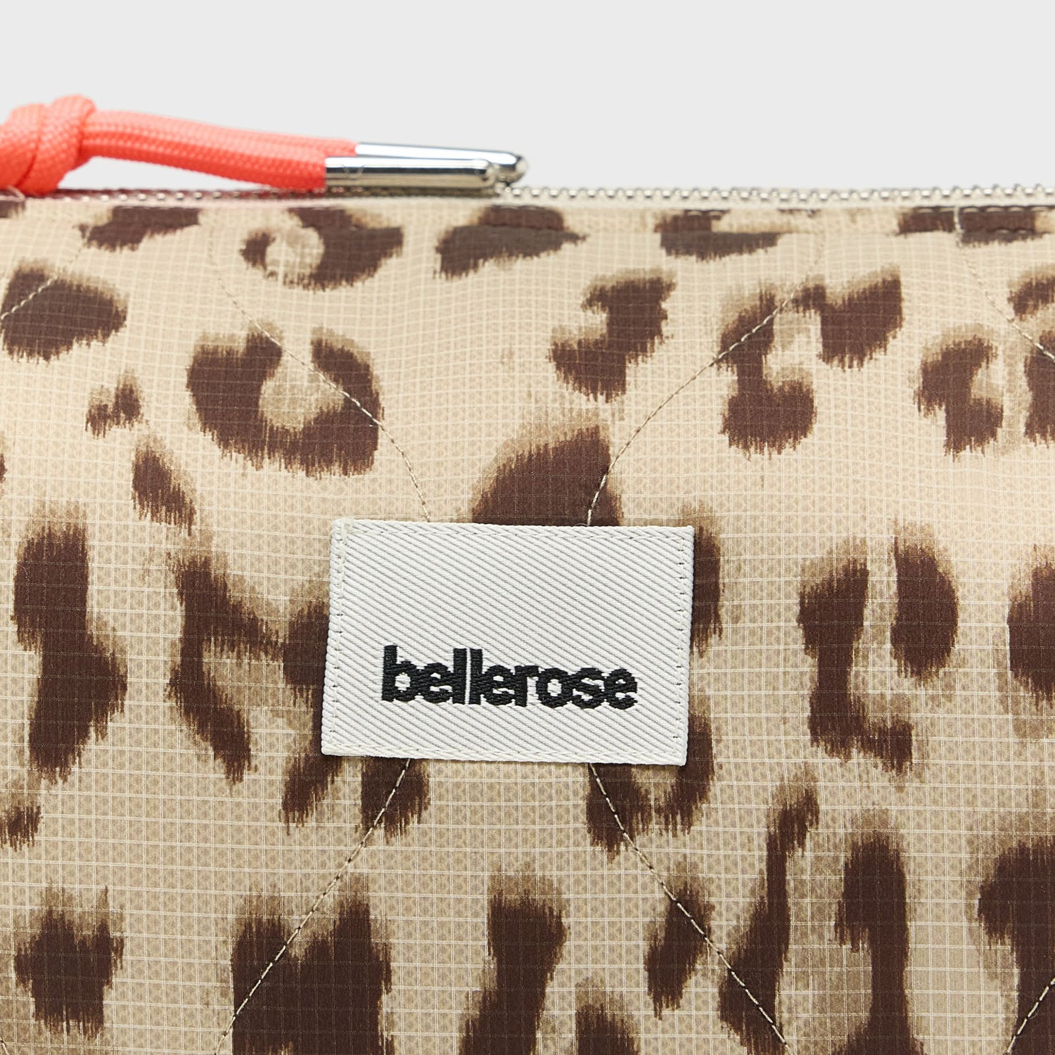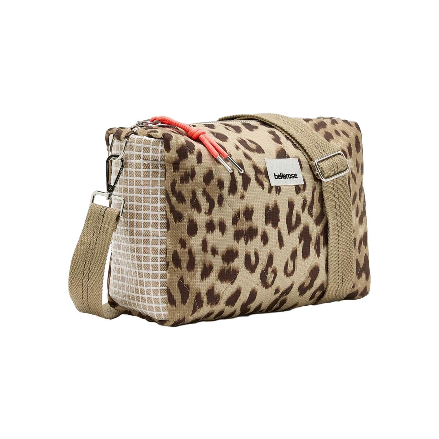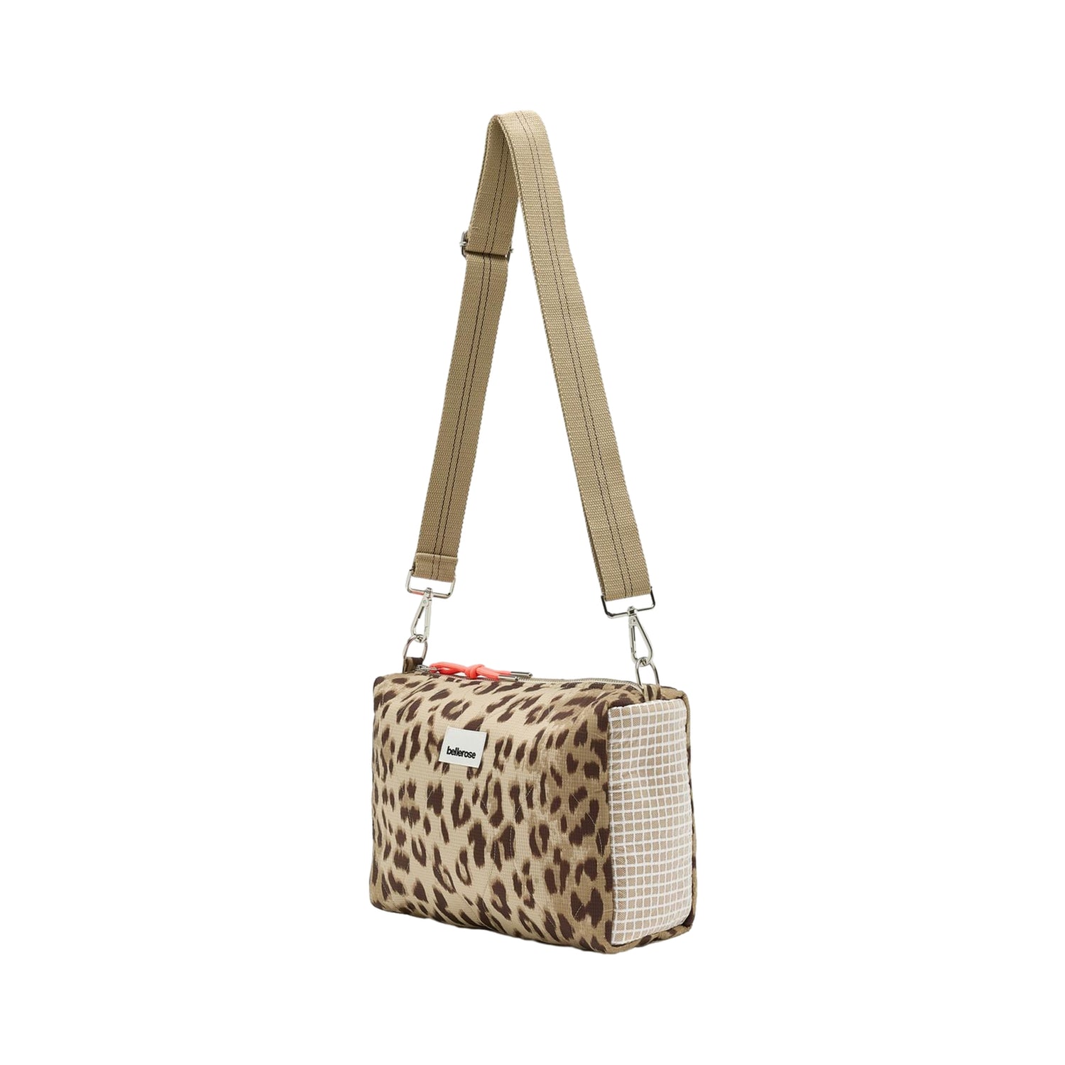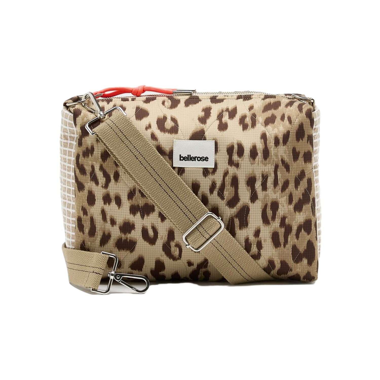 Charming and practical for everyday use, this zip-top crossbody bag features a leopard-print quilted fabric, complemented by a beige strap and a vibrant fluorescent pink lining.