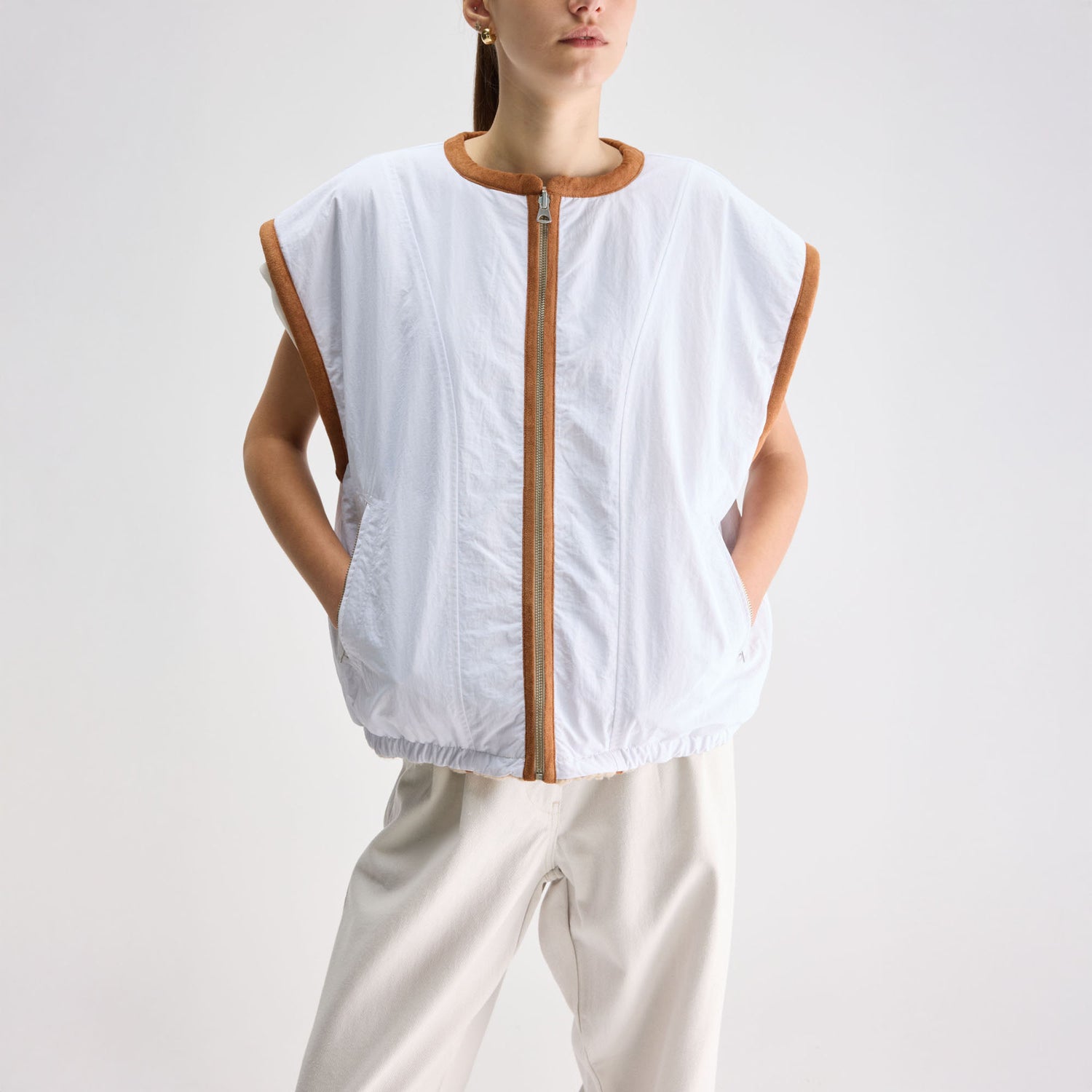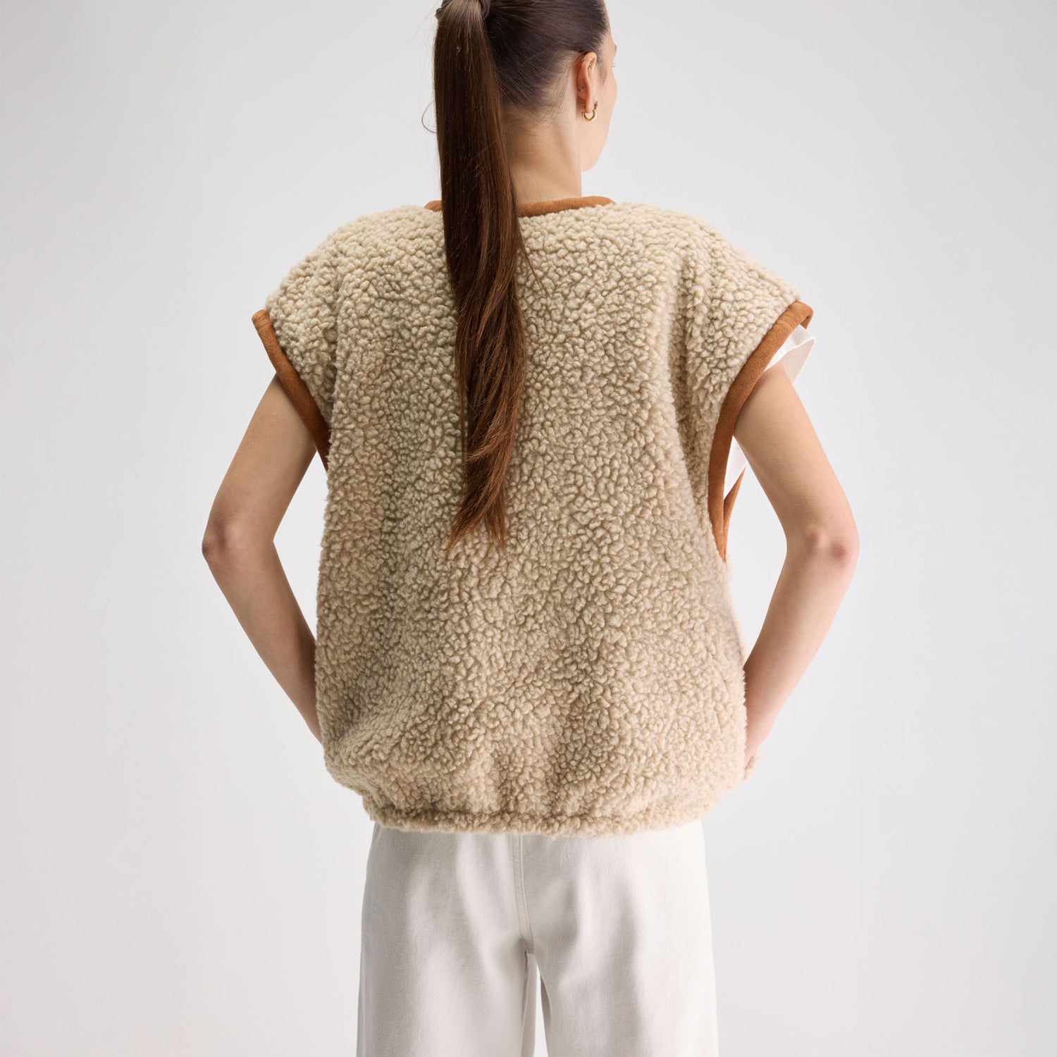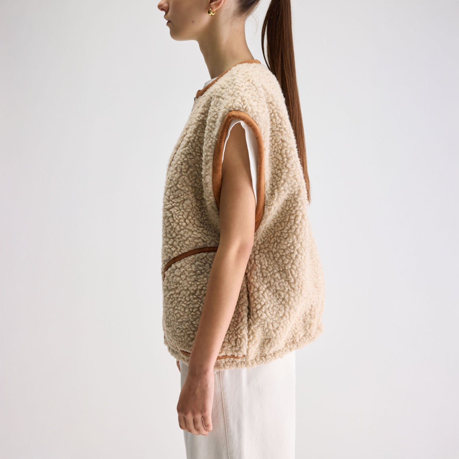 An oversized, reversible sleeveless jacket crafted from soft beige shearling, with contrasting camel piping and a clean off-white inner lining. Featuring functional side pockets on one side and zipped pockets on the other. Zip closure for a secure fit.