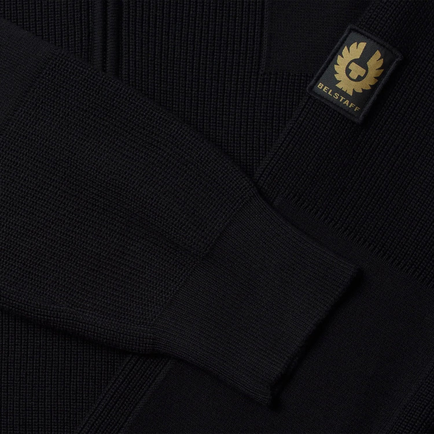 - Embroidered edge yellow gold Belstaff phoenix on black patch on left sleeve