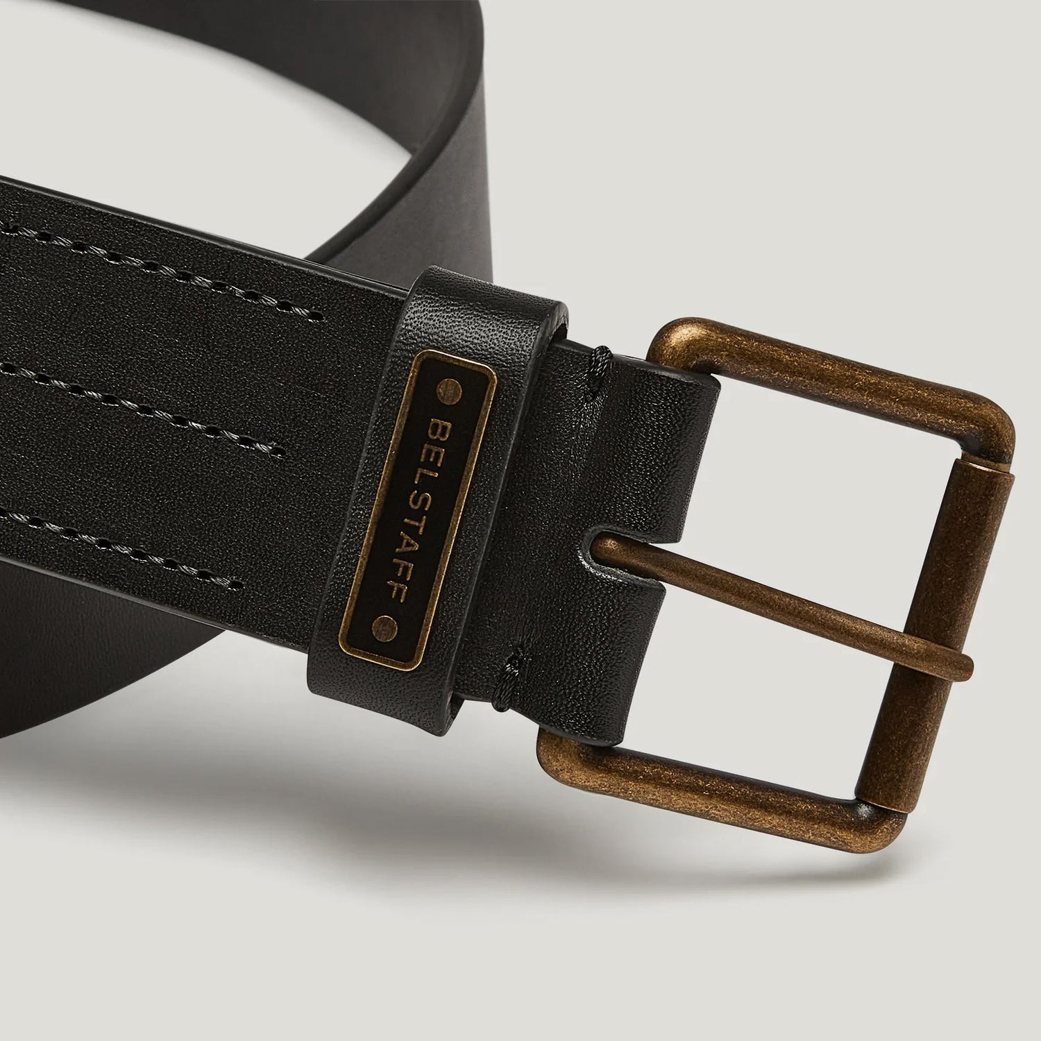 The Ledger Belt in black is a timeless, understated design. The neat square buckle, calf leather strap and enamel plaque branding will bring a quiet confidence to any outfit.