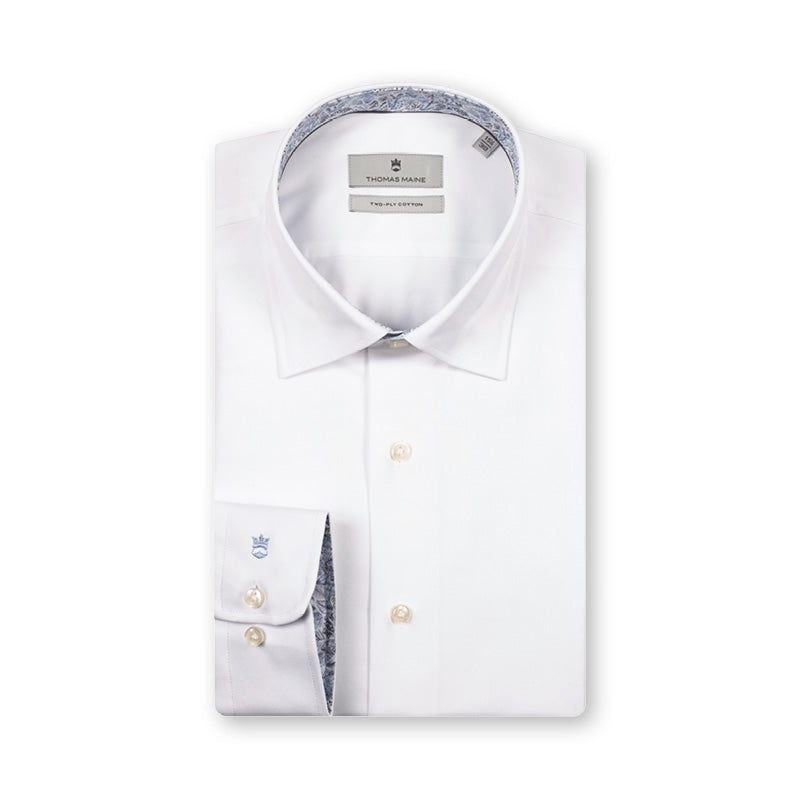 The Bergamo shirt from Thomas Maine features a clean white base accented with a subtle mid-blue detail—and a hidden button placket for a sleek, uninterrupted front.