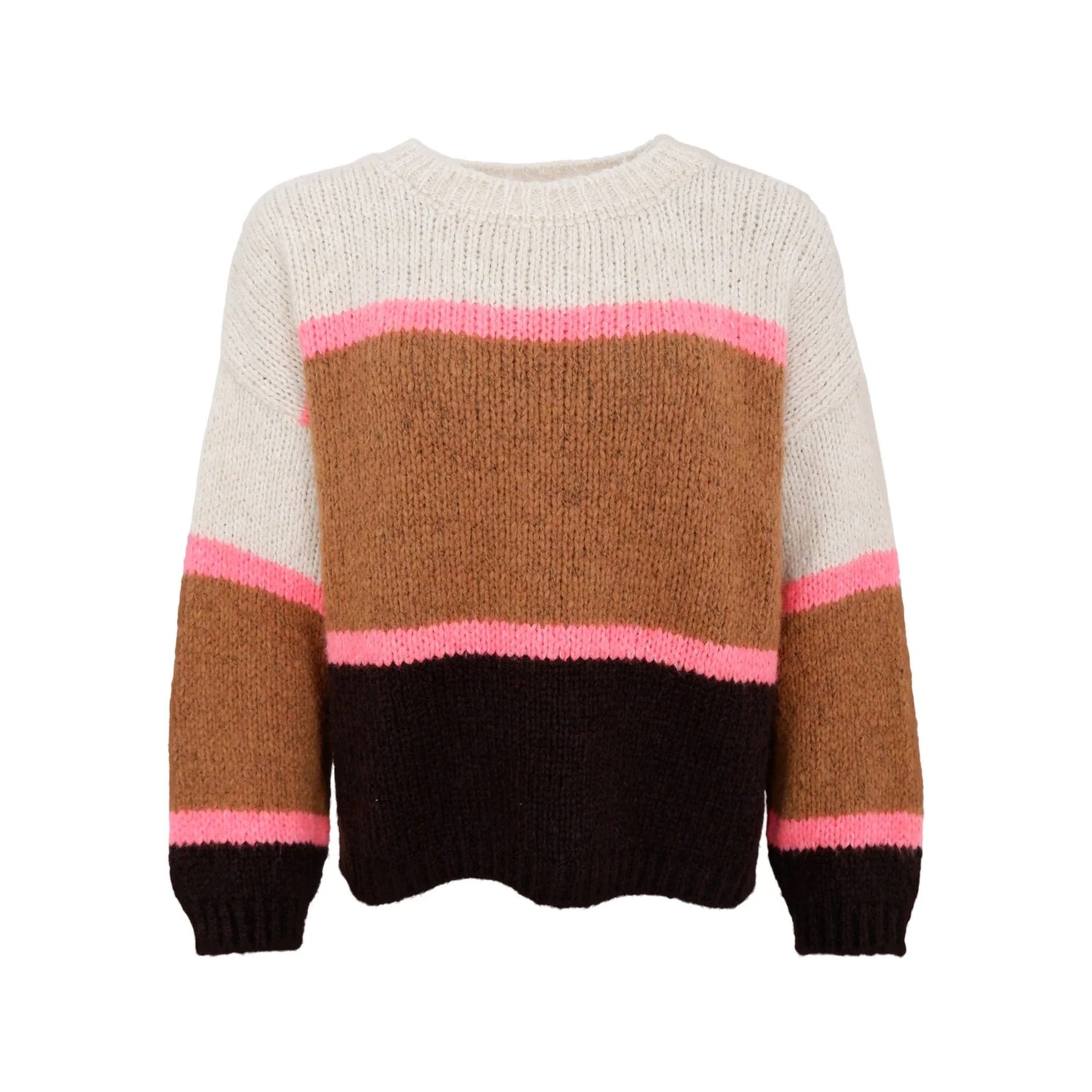 A knitted sweater in a soft, warm quality featuring a colourful striped design. Styled with a round neckline, long sleeves and ribbed edges for a relaxed, comfortable fit. Wide colour blocks paired with neon details create a modern, fresh look, making it perfect for everyday wear and seasonal layering.
