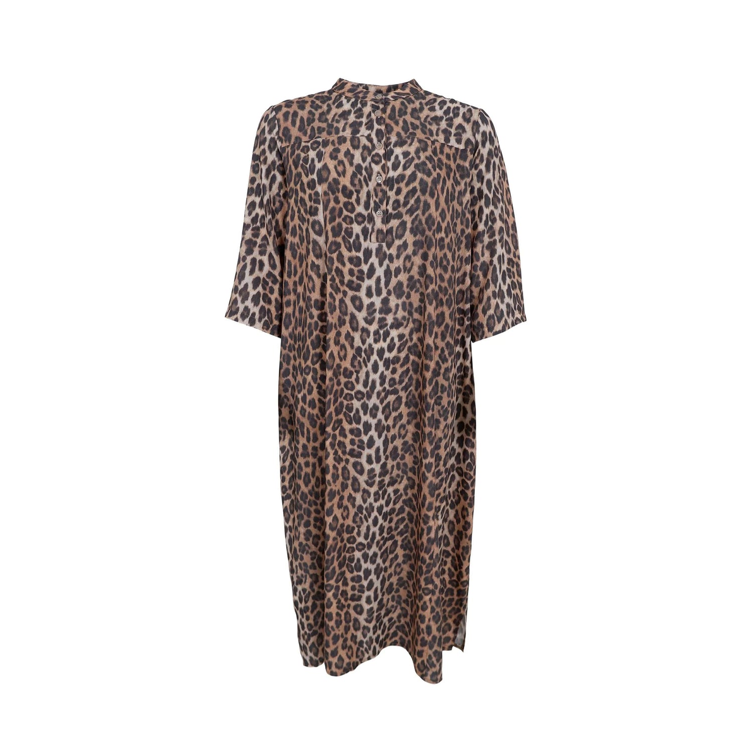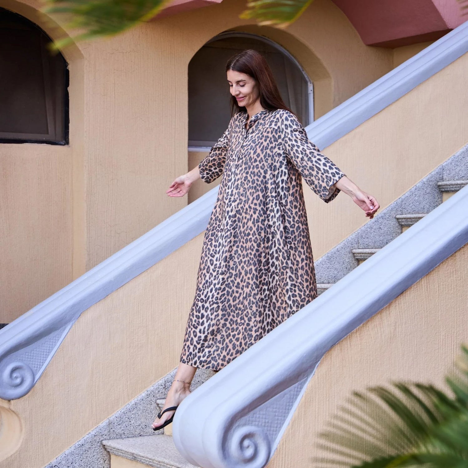 Add a touch of wild elegance to your wardrobe with this statement dress that combines comfort and edge in one design. The loose fit and practical side pockets give a relaxed and effortless look, while the small stand-up collar and front button closure add a sophisticated finish. Short sleeves and a light, flowy fabric make it ideal for both sunny days and layering on cooler days.