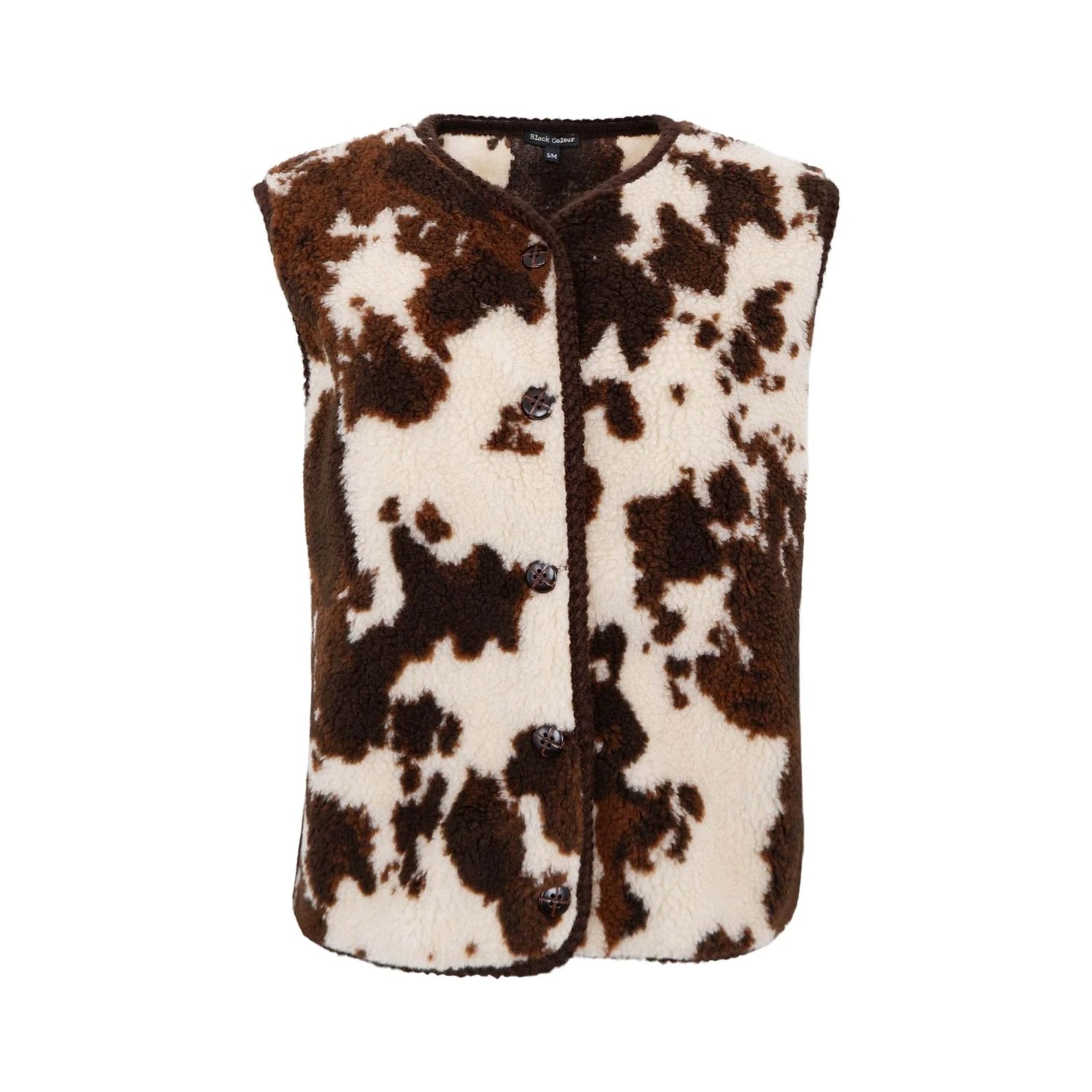 A lovely, soft vest in teddy-quality fabric, offering a warm and cosy feel. Featuring a striking multi-coloured pattern and a button-front closure, it has a sleeveless, slightly boxy fit that makes it perfect for layering over knits, shirts, or long-sleeve tees. A stylish statement piece that adds extra warmth on colder days.