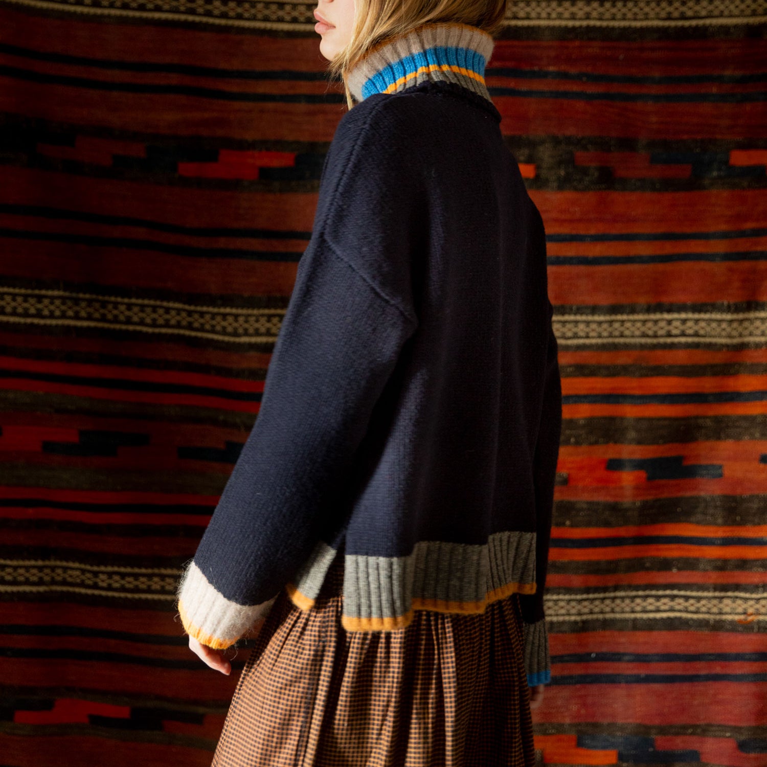 Bonte’s timeless roll neck is reimagined with a modern twist, featuring a bold striped collar in rich navy and vibrant orange hues. Knitted from responsibly sourced yarn, it offers a relaxed silhouette and cosy roll neck, making it an ideal cold-weather staple.