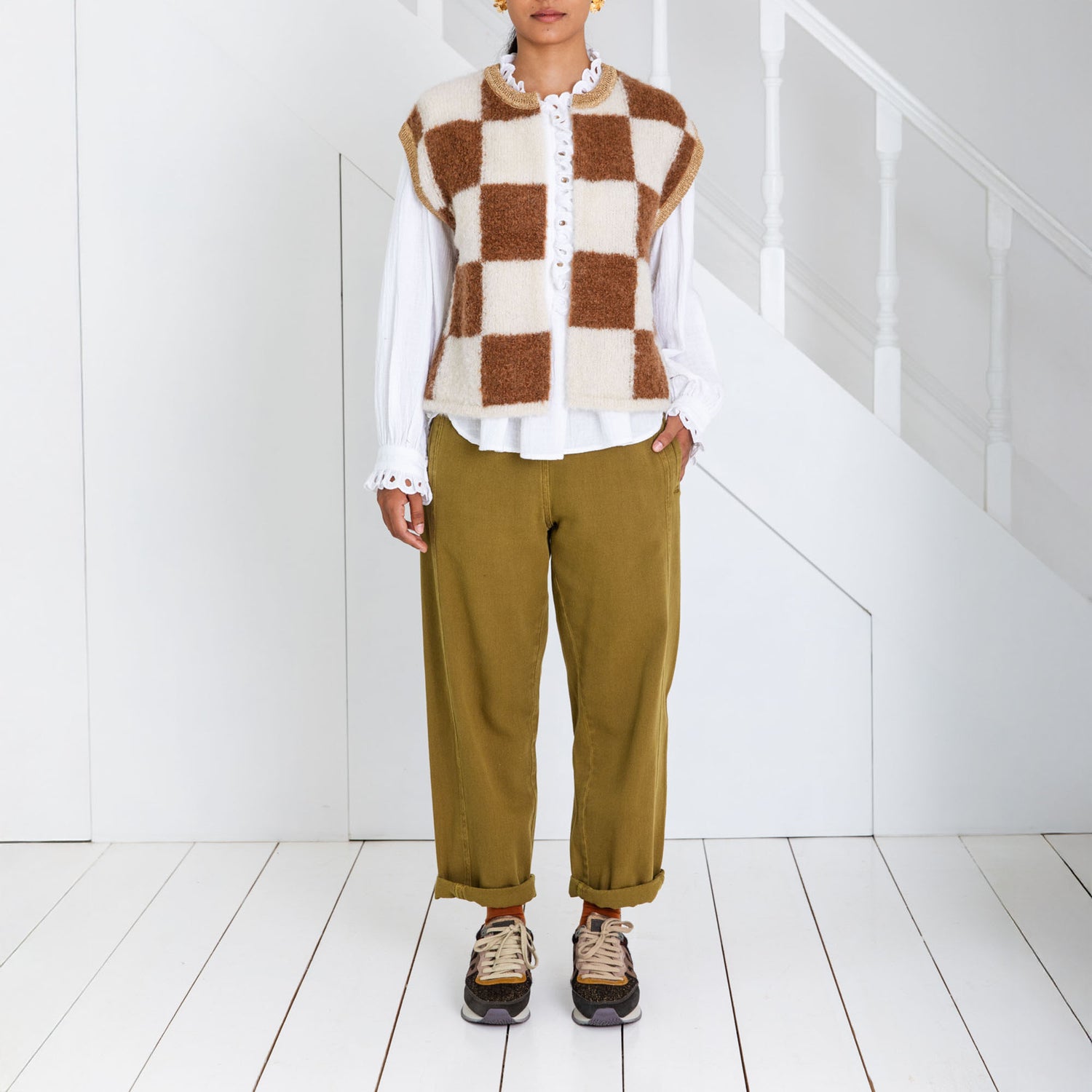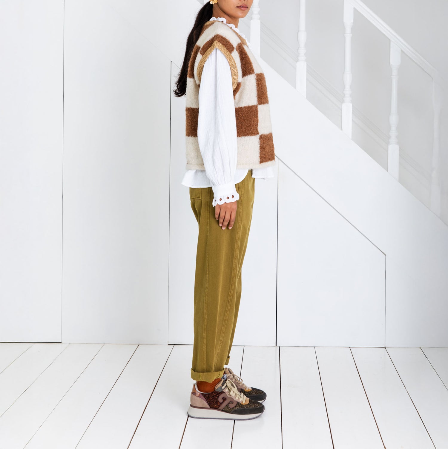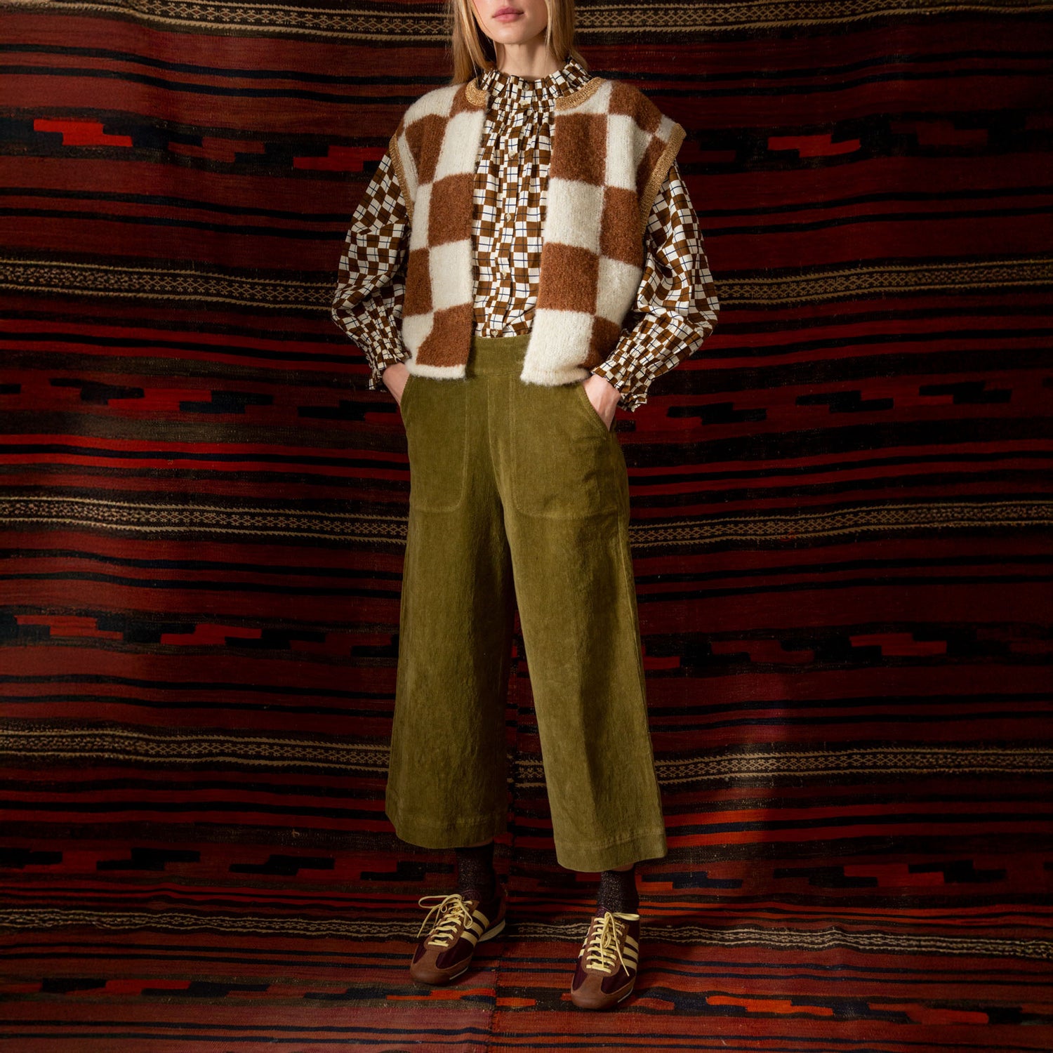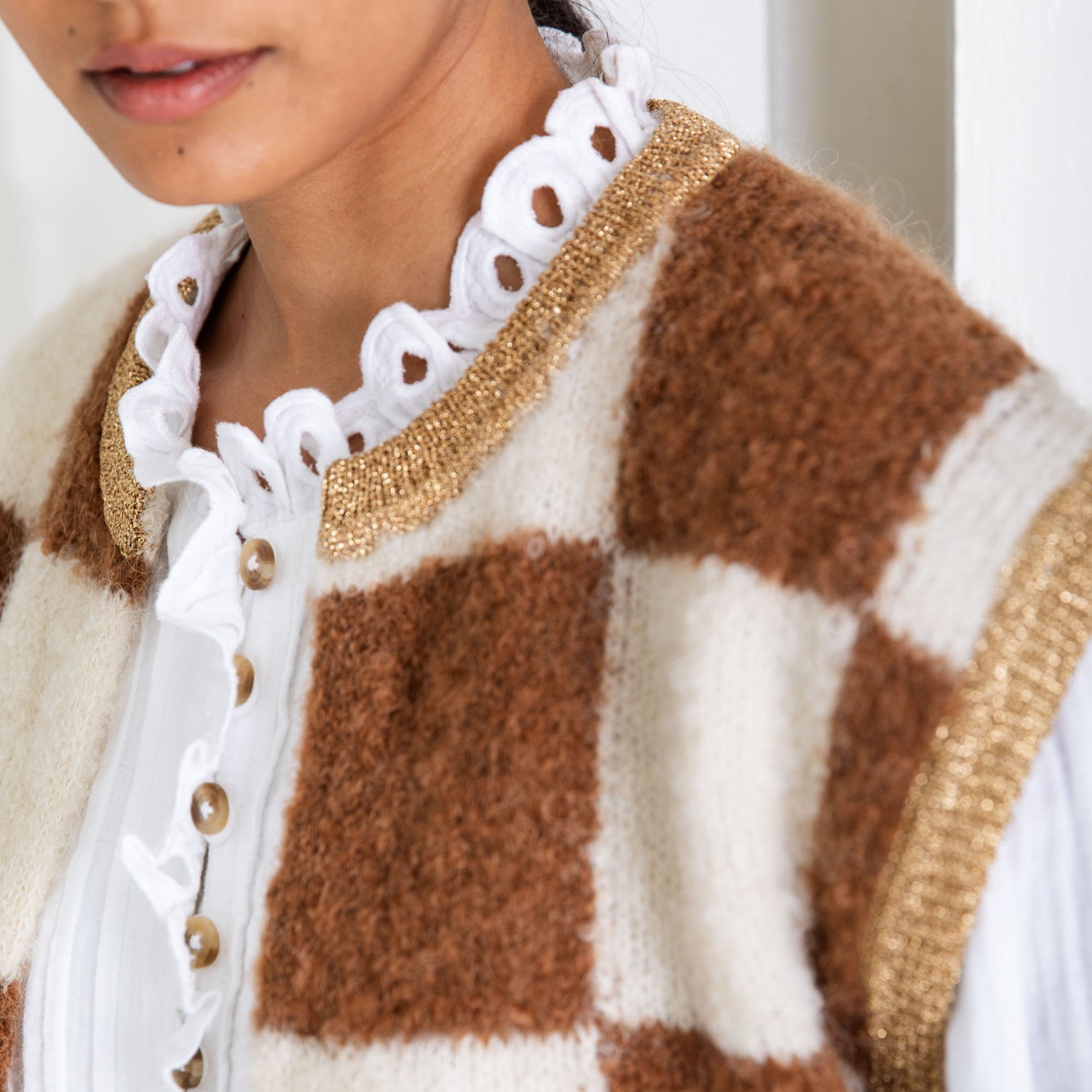 A perfect layering piece, crafted from lofty boucle-style yarn with a modern patchwork design. It features extended shoulders and an open front with a clean, finished placket. The collar and cuffs are accented with a chunky rib knit in shimmering gold lurex for a bold, stylish touch.