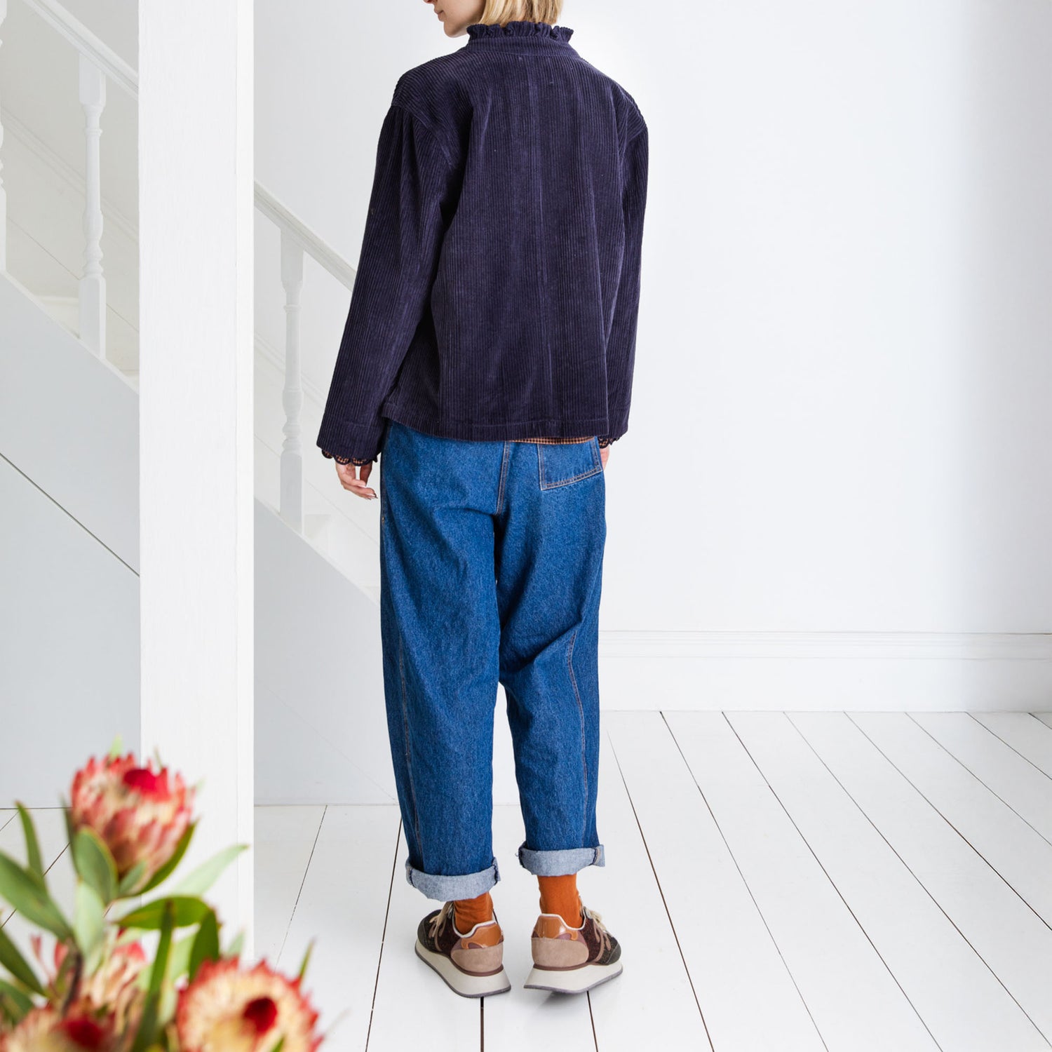 Easy + slightly oversized workwear inspired jacket in a garment washed organic jumbo-cord, with twin-needle stitching.  Frill neck detail with contrast mock-horn buttons.  Feminine ric-rac detail on pockets. Full length sleeves that can be worn rolled up.  Size down for a more fitted look.