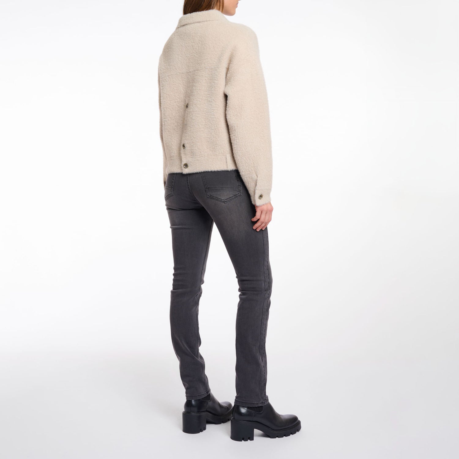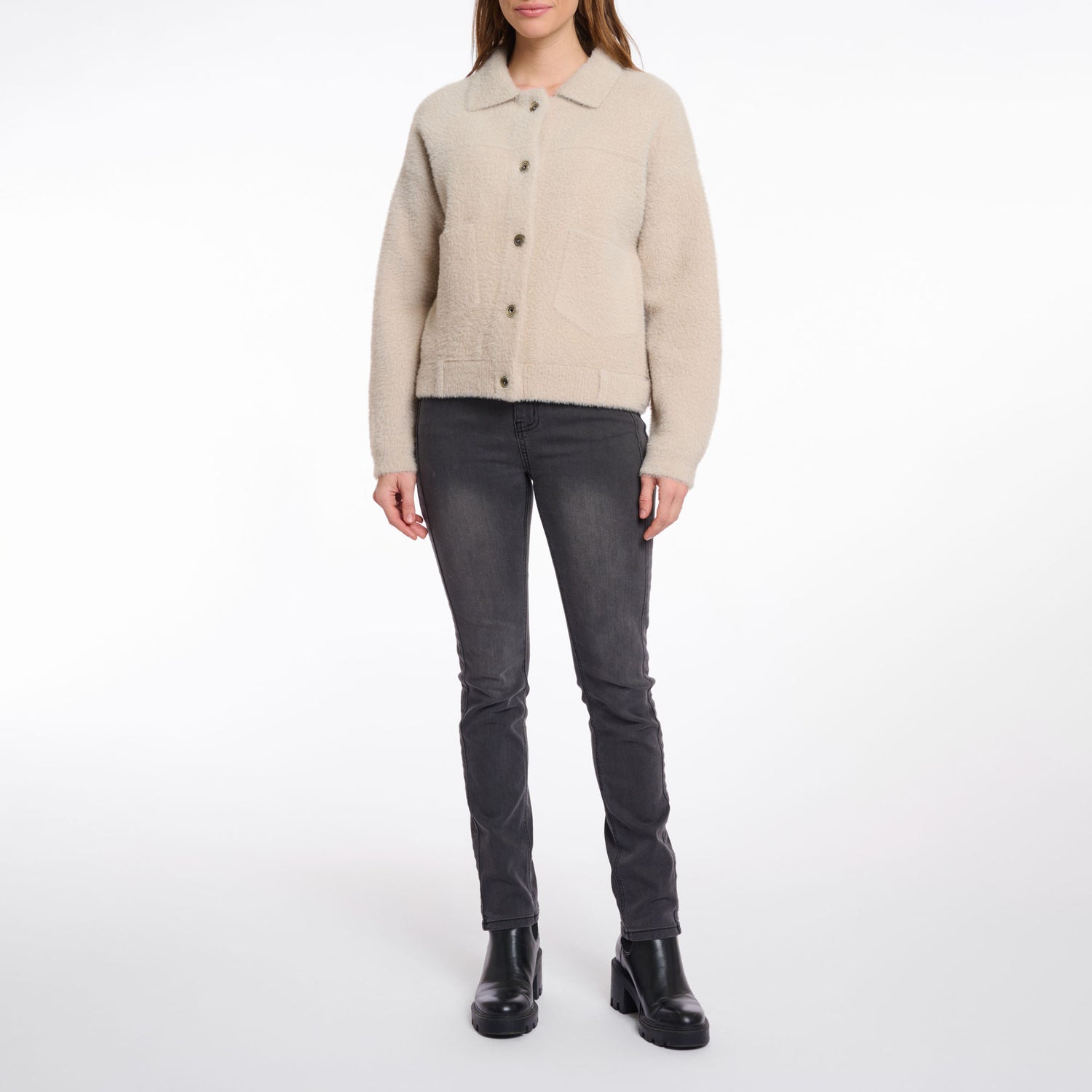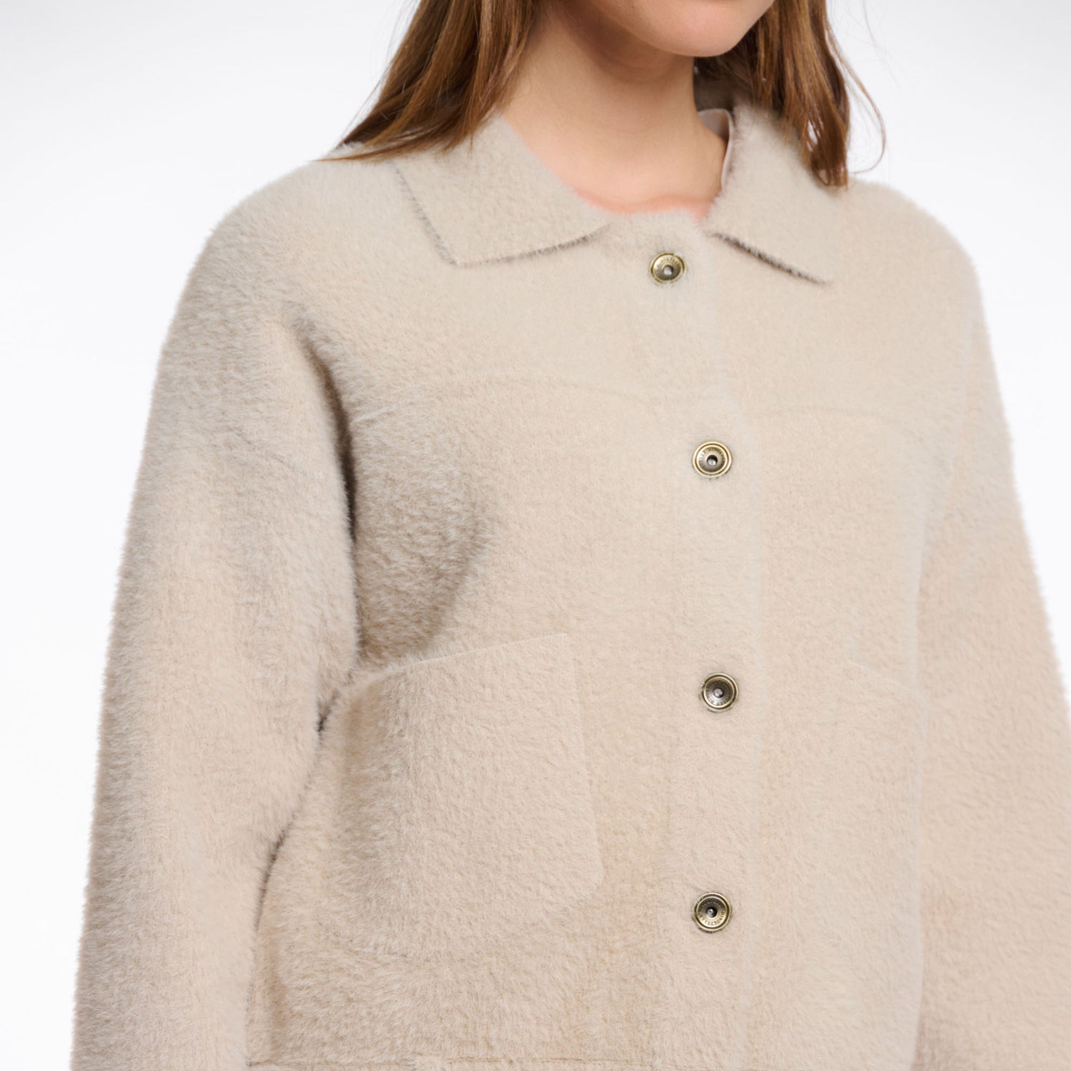 Super soft and short knitted jacket. This cosy jacket features a boxy silhouette, a flat collar, a button closure, two open front pockets, a button closure on each cuff and button details on the back.
