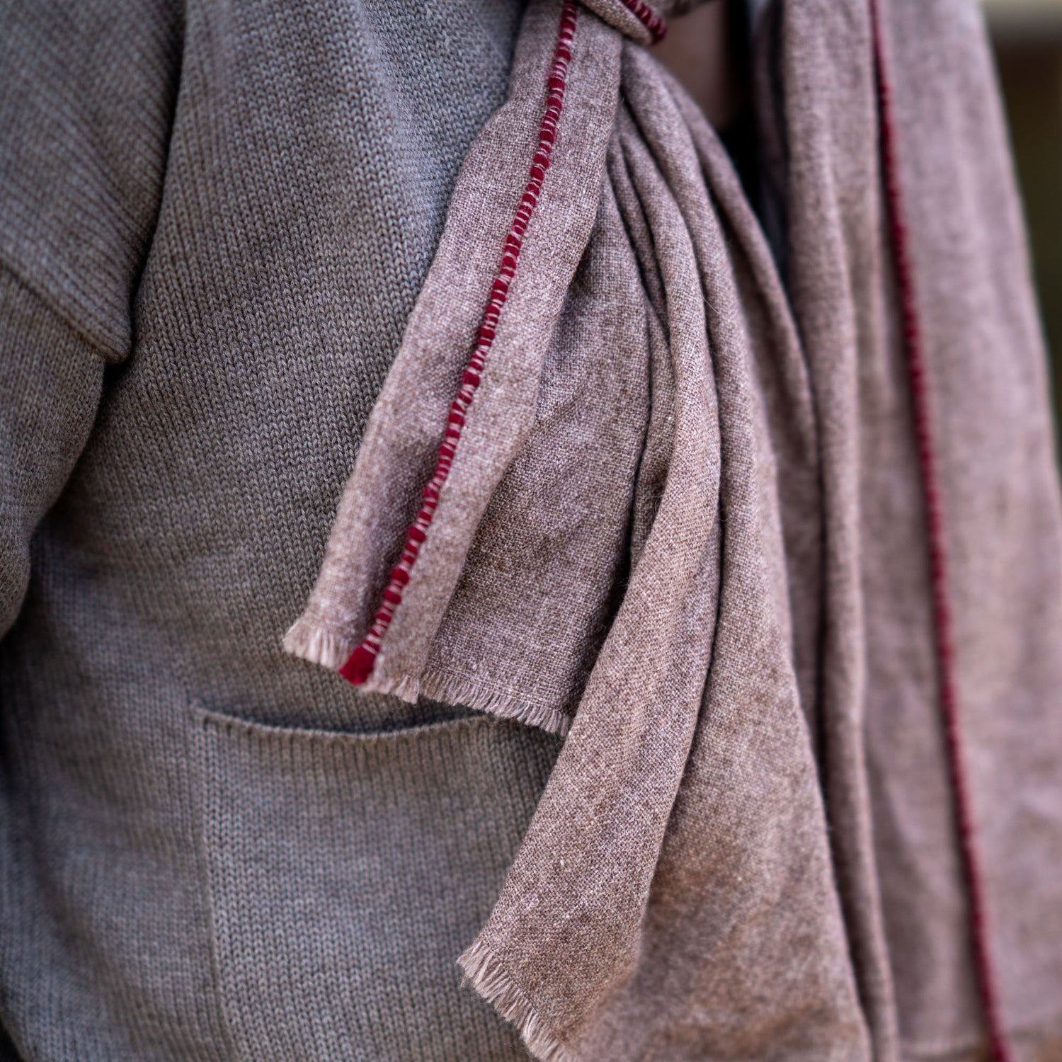 Elevate your wardrobe with this luxurious cashmere and wool blend scarf, featuring a sophisticated mocha base with a striking burgundy contrast edge.