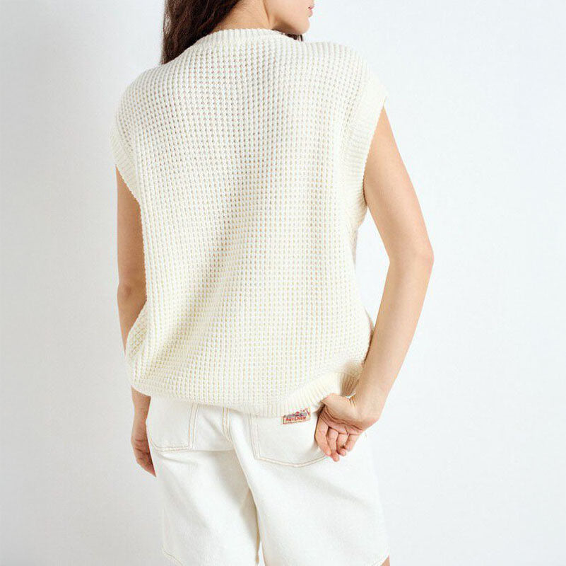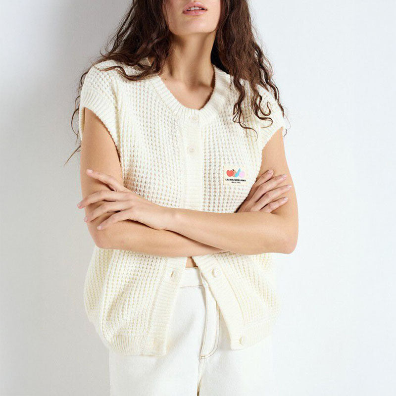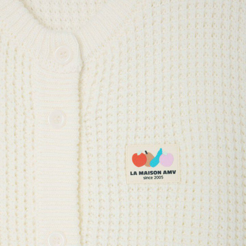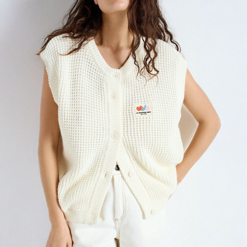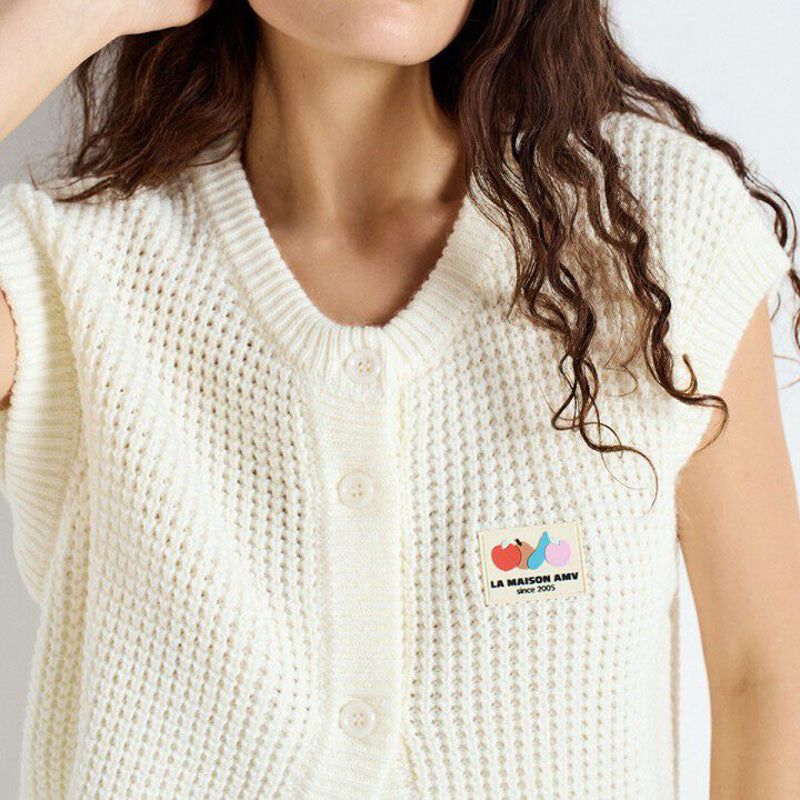 Bursting with personality, this sleeveless, buttoned cardigan features a round neck, a cropped ball-fit silhouette, and an oversized cut for that effortlessly cool vibe. Finished in soft pearl hues with a funky fruit logo, it’s the kind of piece that instantly lifts your mood—and your outfit