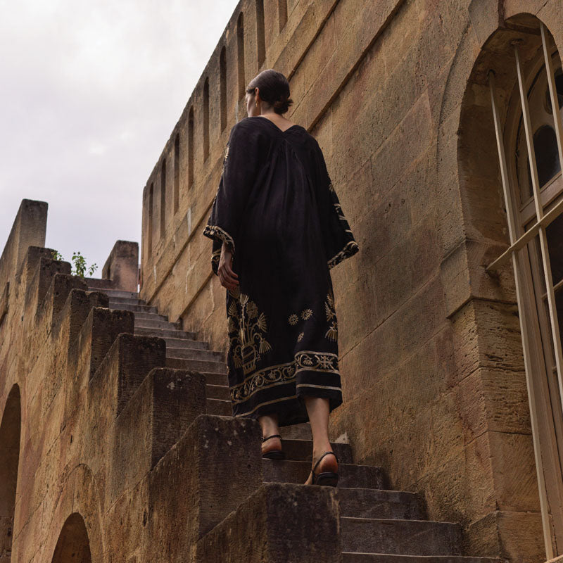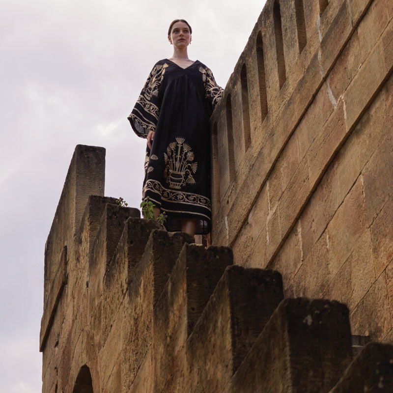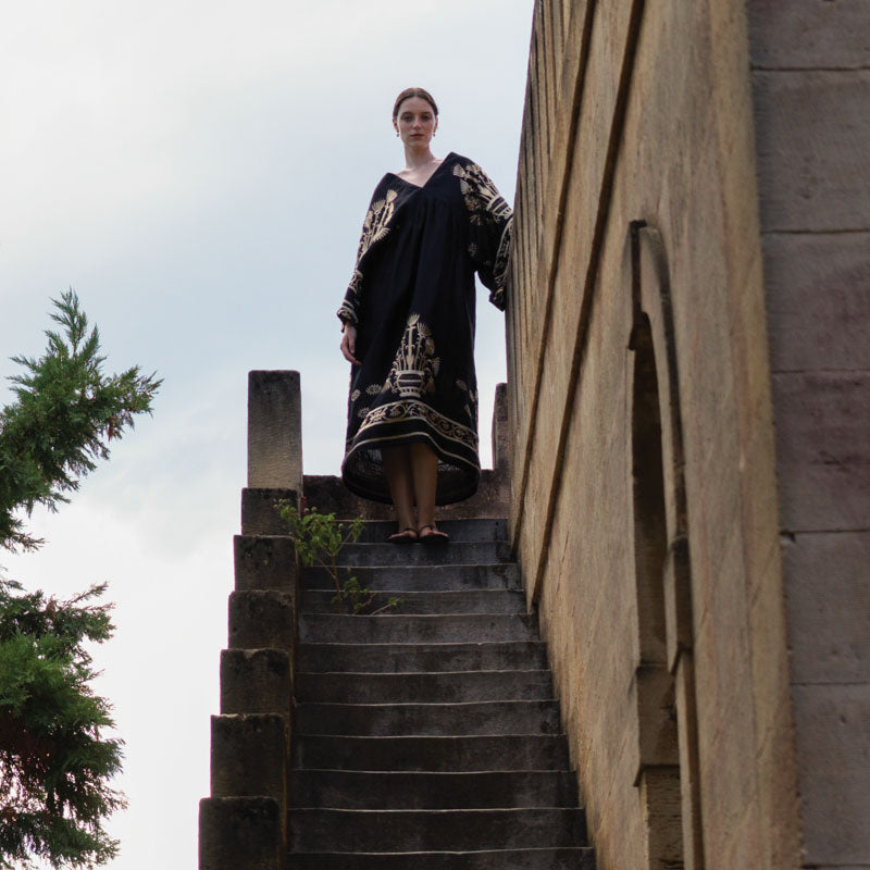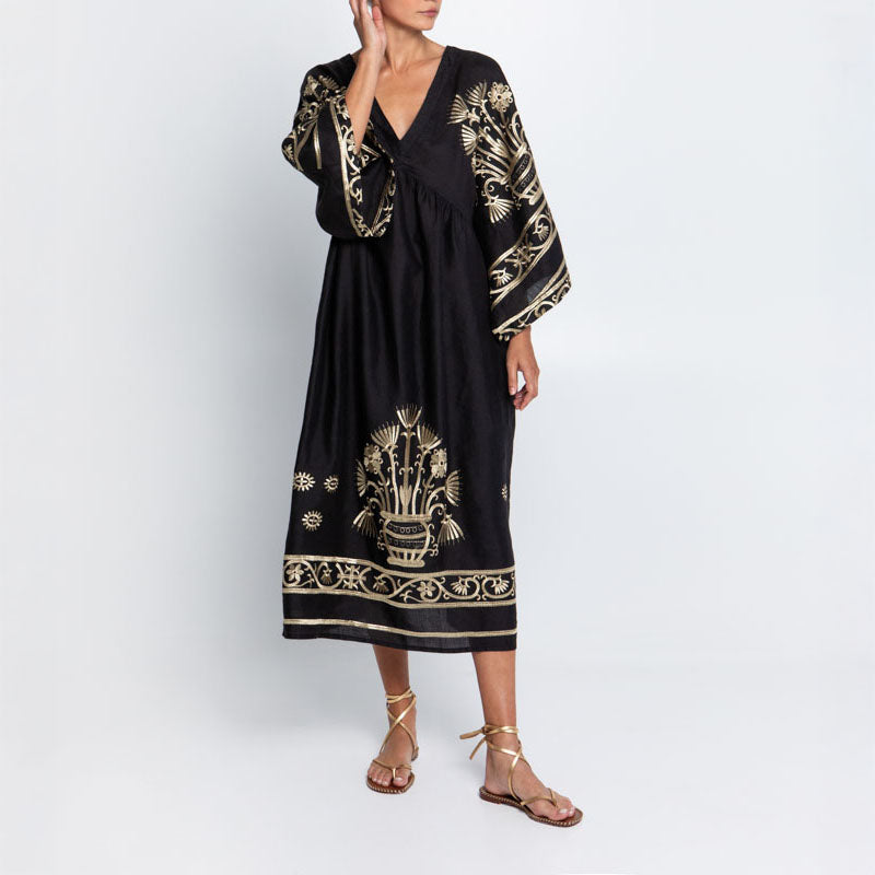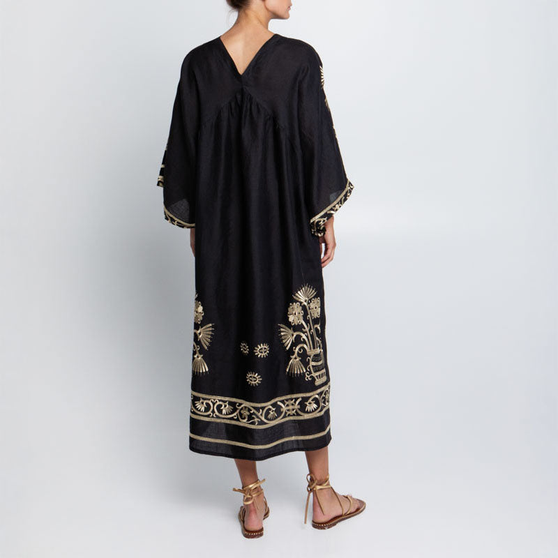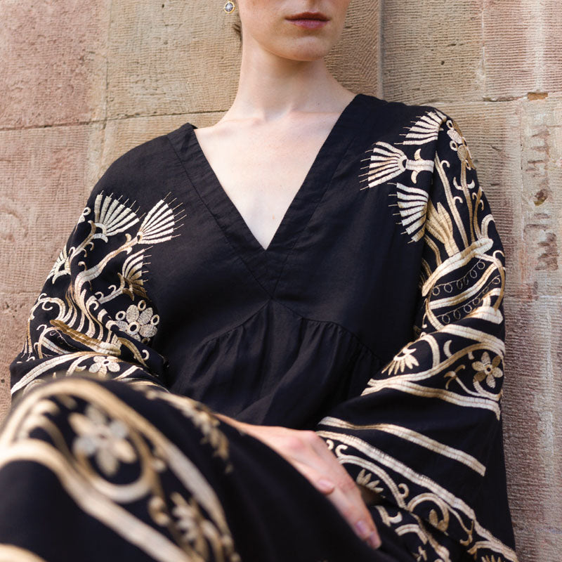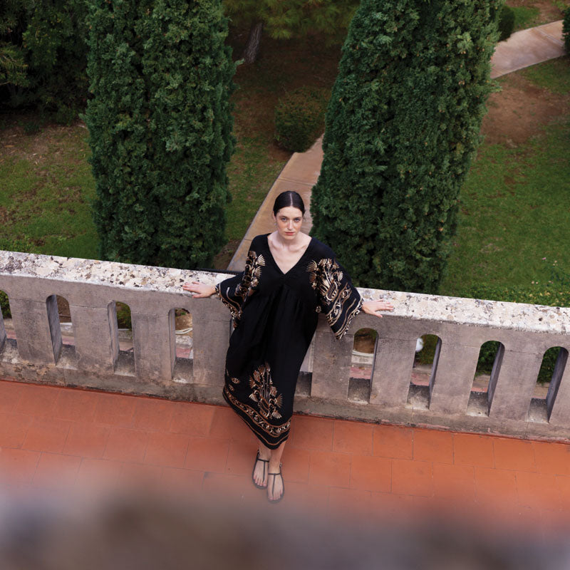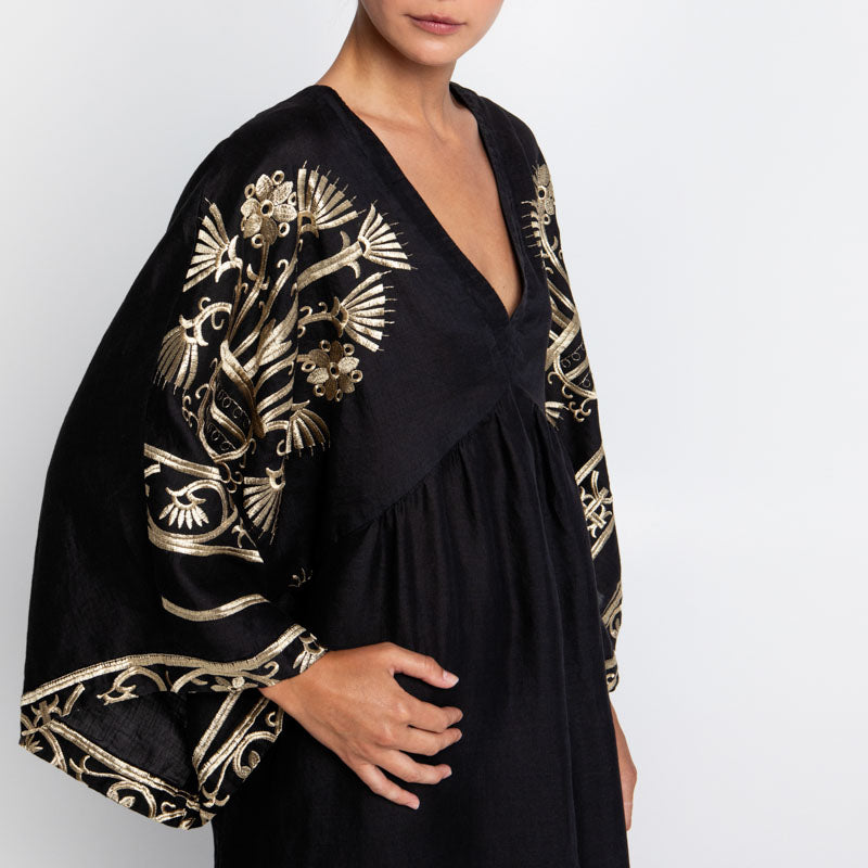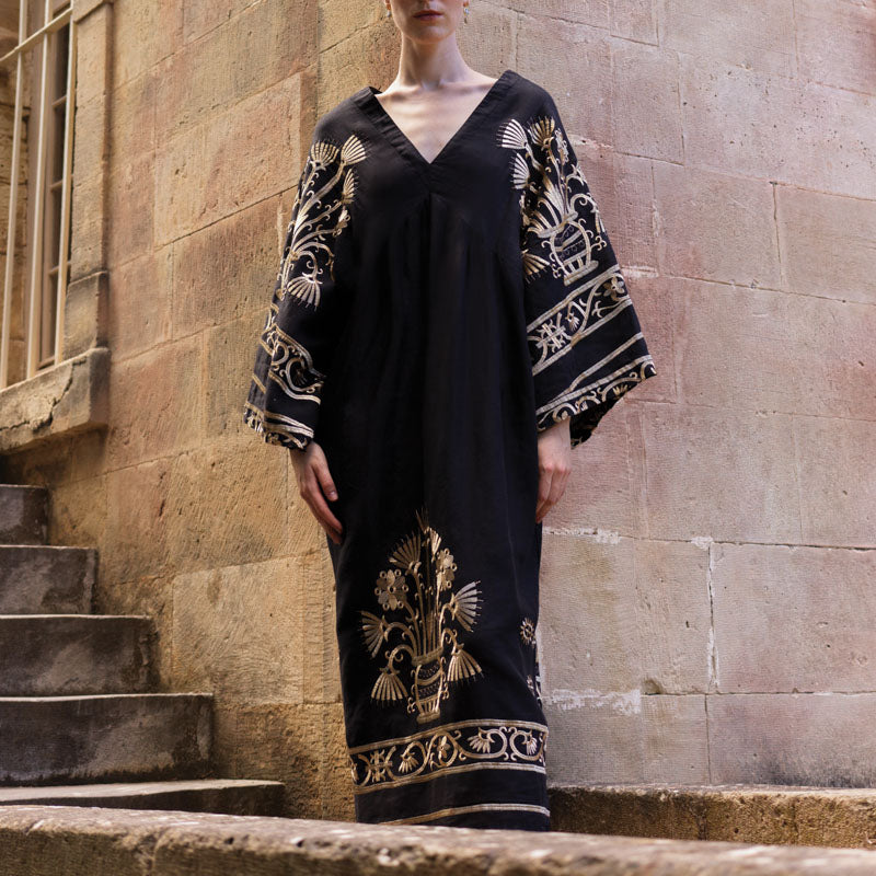 Inspired by the rich heritage of Crete, this bell-sleeve kaftan dress blends tradition with contemporary elegance. The black fabric features delicate gold embroidery with floral and ornamental motifs, inspired by Cretan and Minoan artistry. With flowing bell sleeves, a deep V-neckline, and a relaxed midi-length silhouette, this dress exudes effortless warmth and sophistication