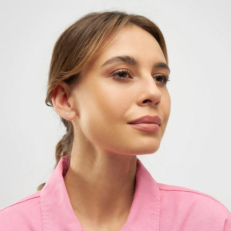 A simple yet elegant single earring featuring a sterling silver cross with rose crystals.