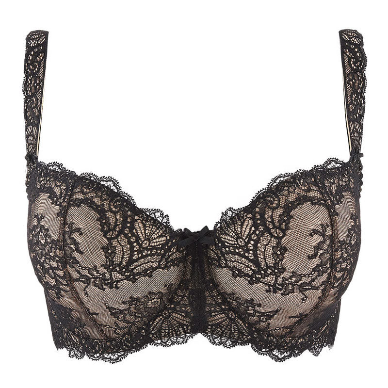 This half-cup bra combines lightness with sensuality and kisses the skin with dreamy scalloped lace that slightly extends over the edge of the piece to delicately highlight the skin.