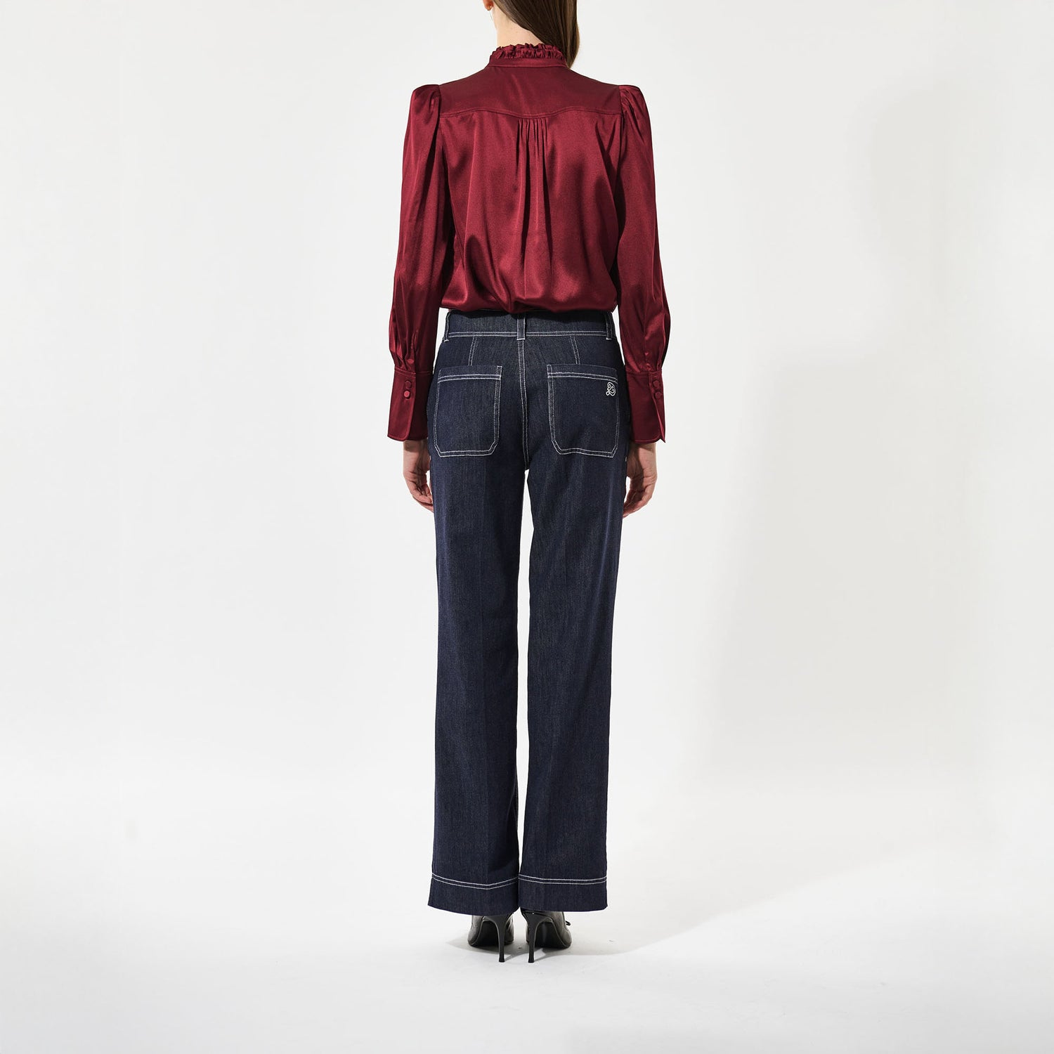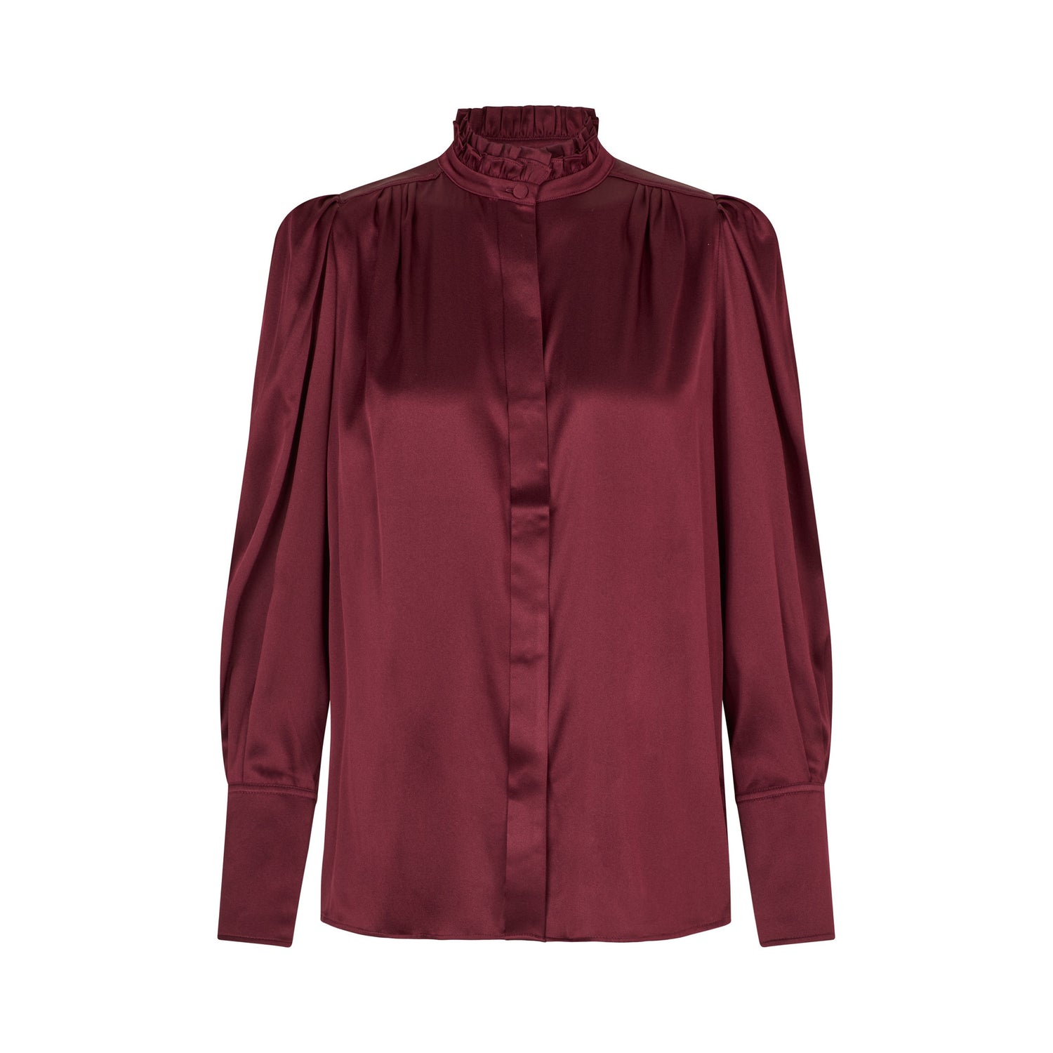 In rich burgundy silk twill, this fly front blouse has a high collar made from two rows of ruffles and shoulders accentuated by gathers and small shoulder pads. Tucks at the back give a little ease and comfort.