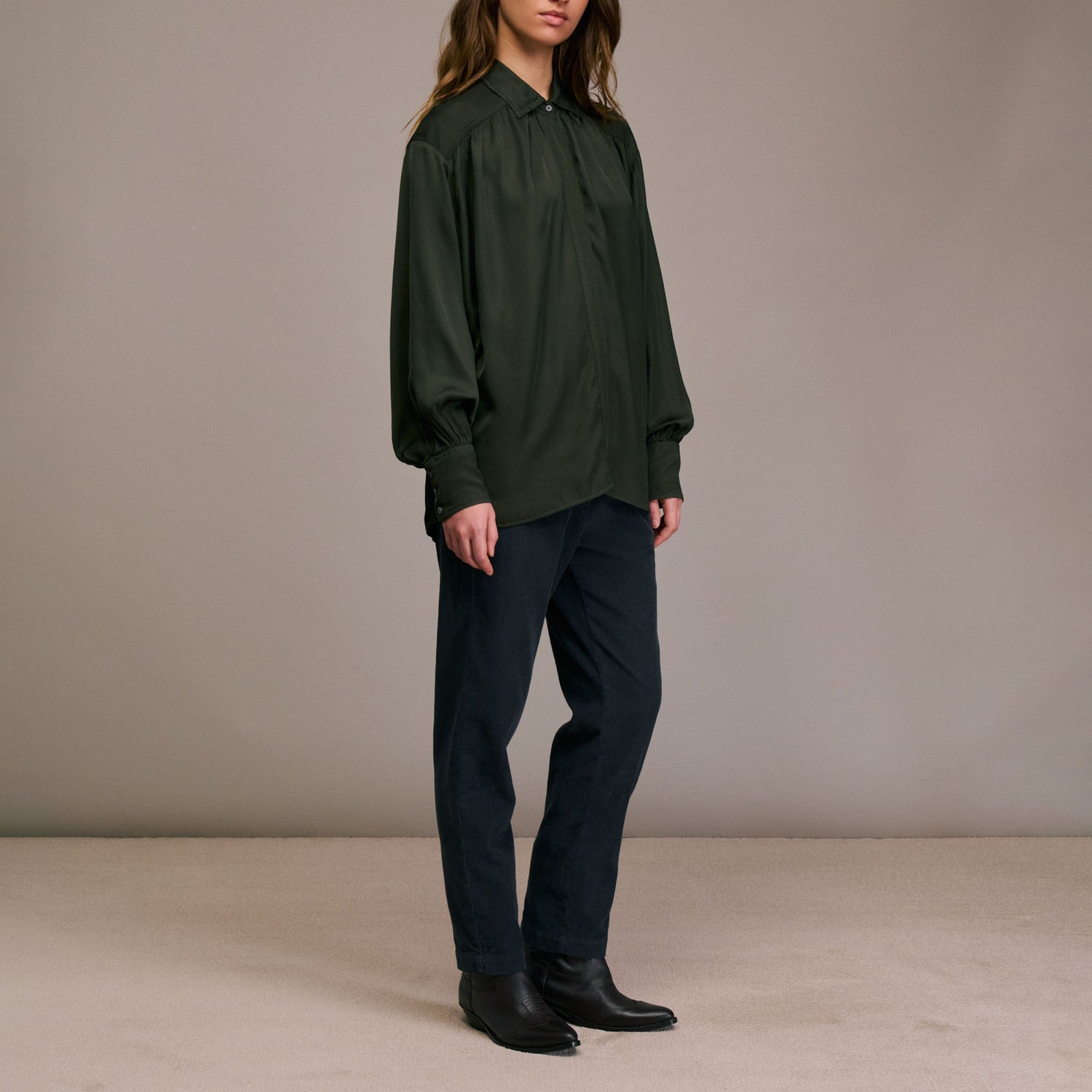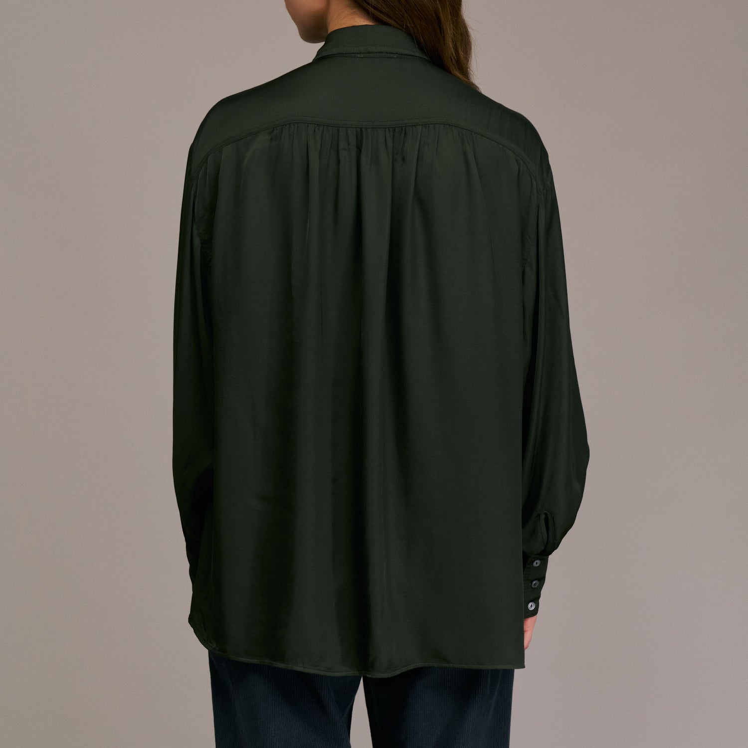 An elegant shirt from Diega, the Carina is made from a viscose and silk blend that drapes beautifully with a gentle sheen. It features a classic shirt collar, button front, long sleeves with buttoned cuffs, and soft gathers across the back yoke, all contributing to its feminine elegance.