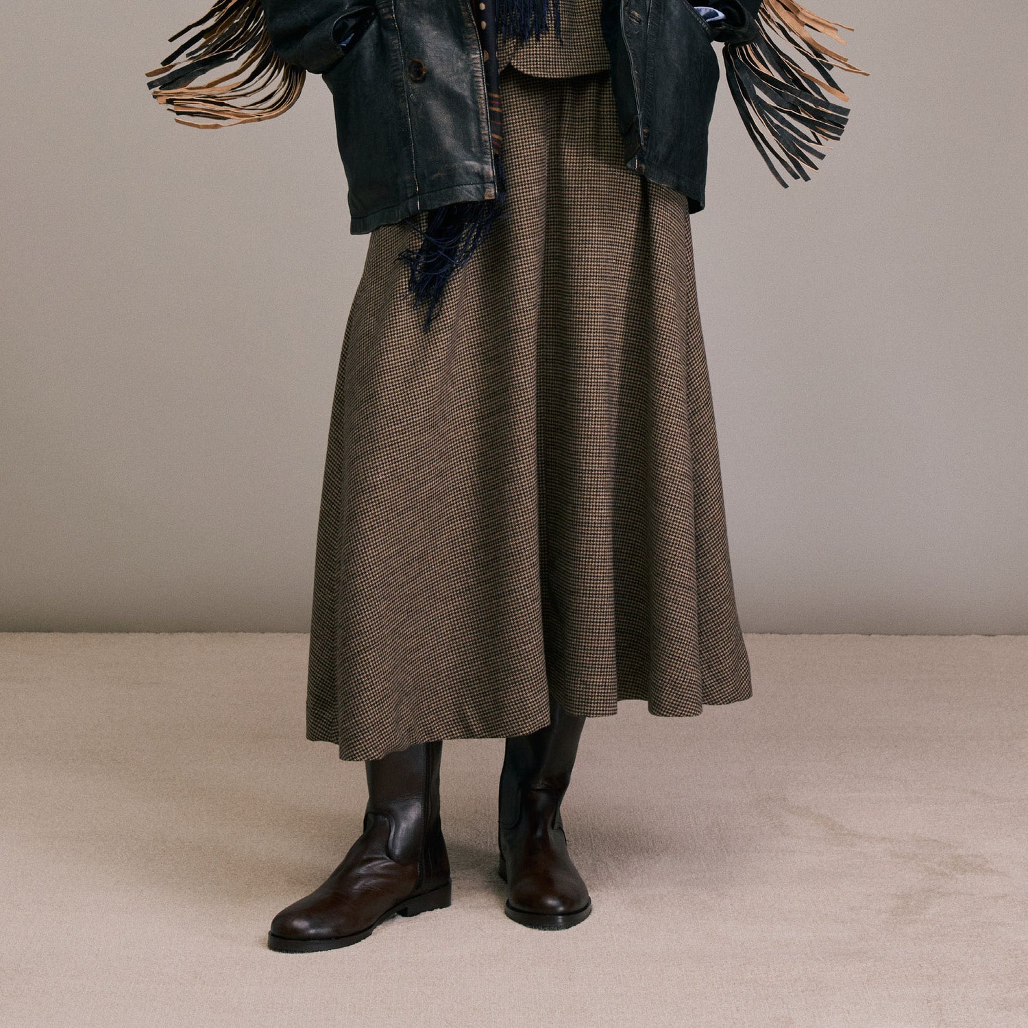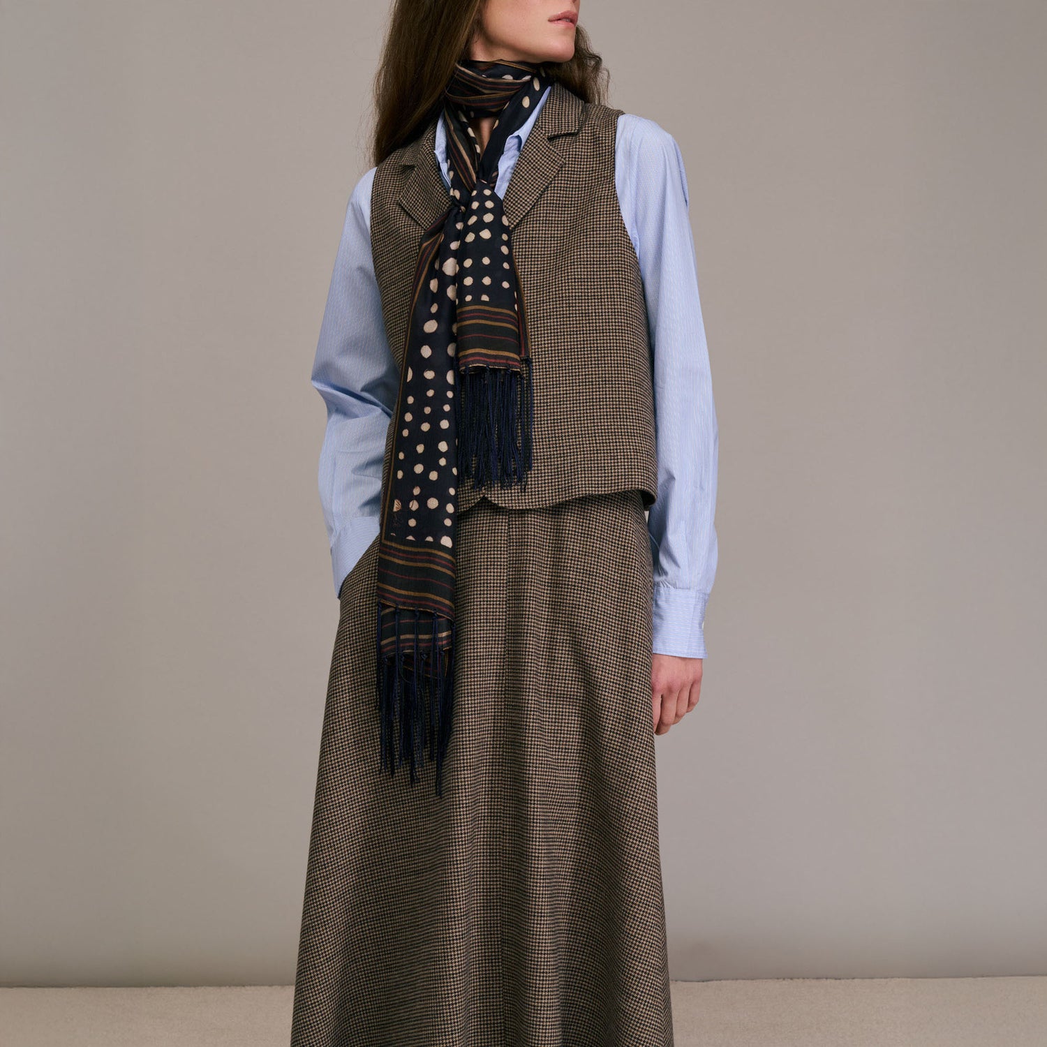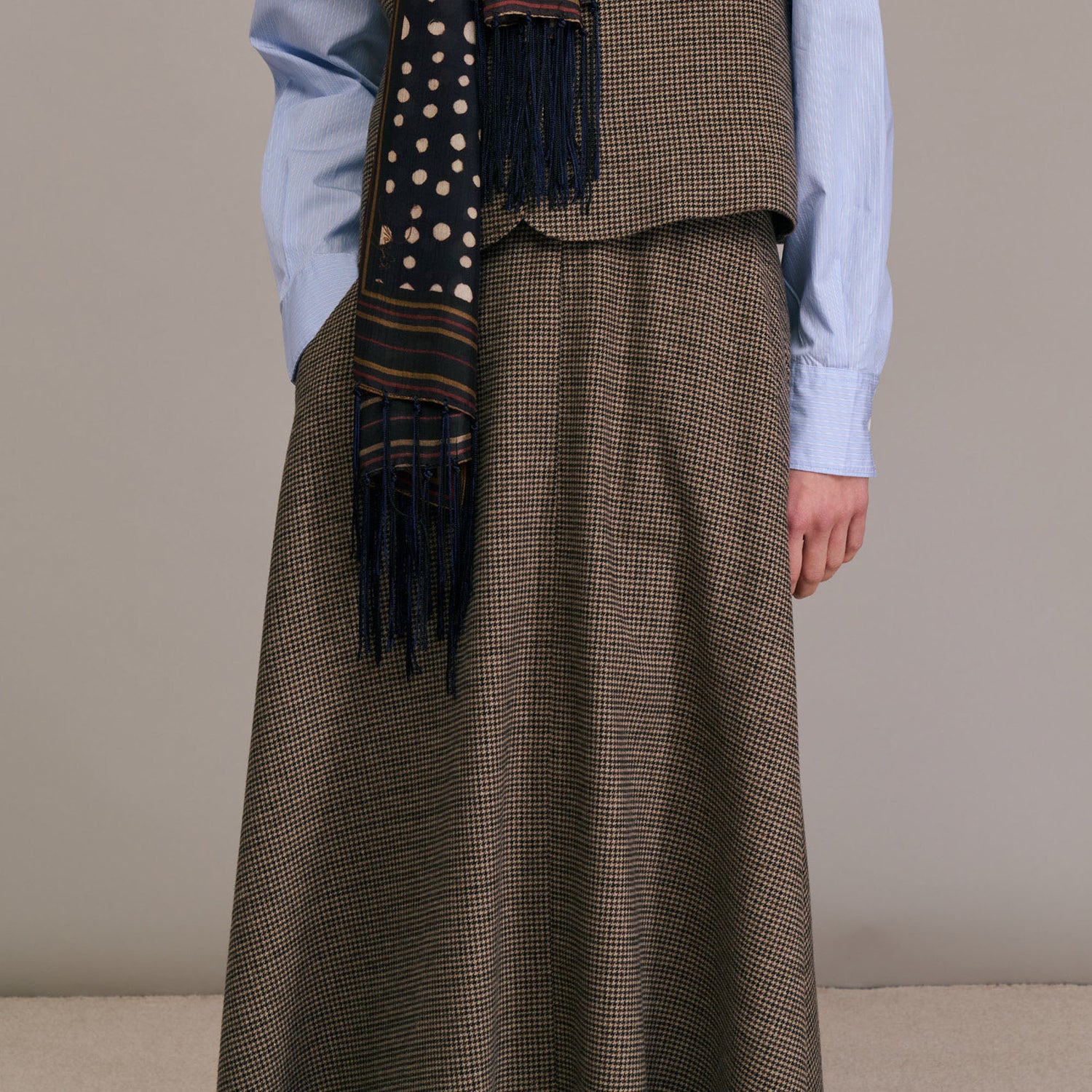 The ultimate cool-girl winter staple. This midi skirt features a rich houndstooth check in deep chocolate and marine tones, bringing texture and warmth to your seasonal wardrobe. With its flattering length and structured silhouette, it pairs perfectly with boots and a high-neck jumper for an effortlessly chic cold-weather look.