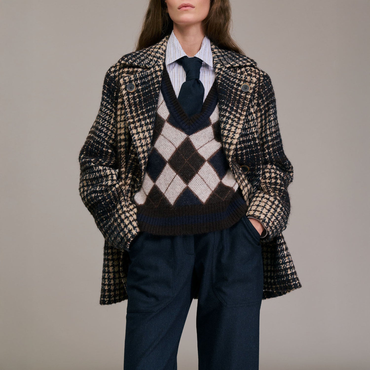 The Maliro Check Wool Coat features a rich check pattern in warm chocolate, deep marine, and soft ecru tones. Designed with a sharp lapel collar, long sleeves, and front piped pockets, this short coat brings a tailored finish to your cold-weather wardrobe.