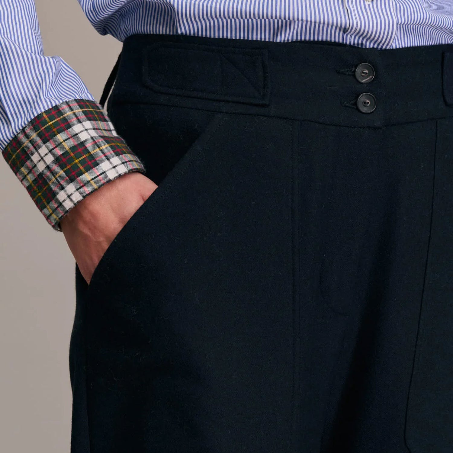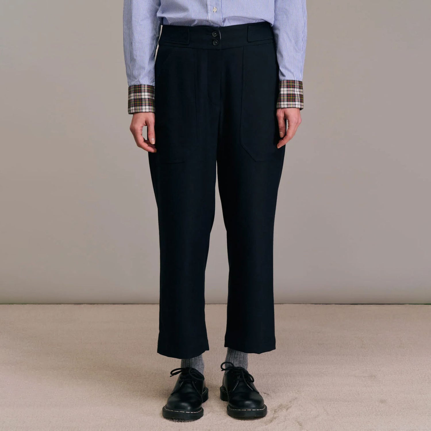 A modern take on classic tailoring, the Ponito Wool Trouser in Marine features a relaxed carrot waist silhouette enhanced by a double-breasted Western-style belt detail. Large patch pockets add a utilitarian edge, while the soft wool fabrication ensures comfort and effortless sophistication. Perfect for pairing with crisp shirts or chunky knits for a polished yet laid-back look