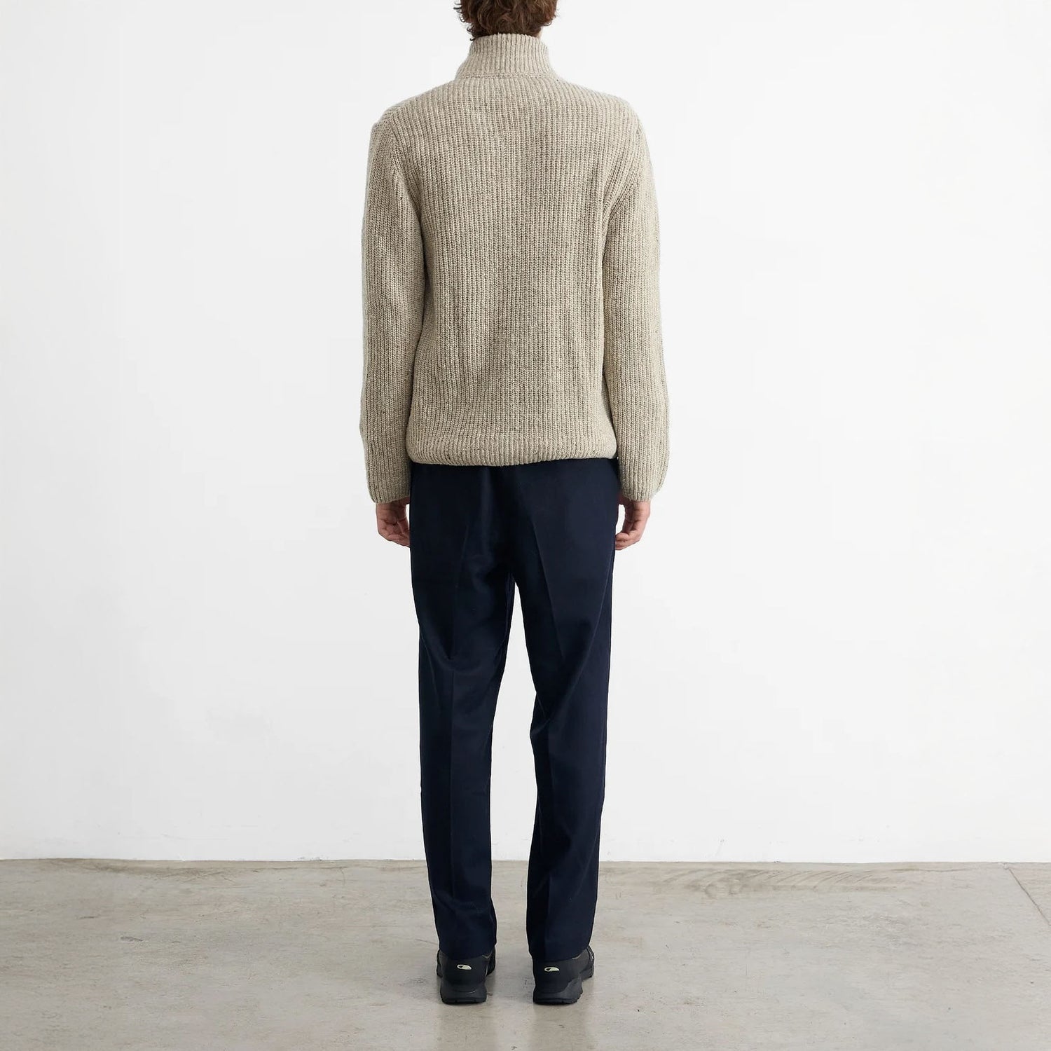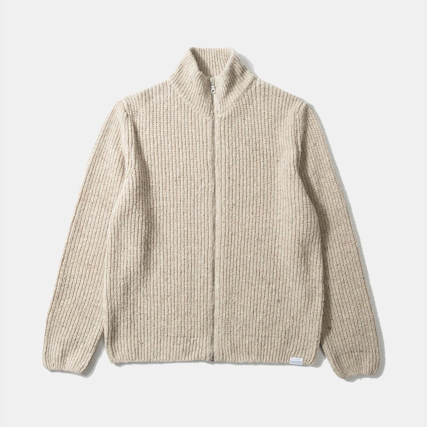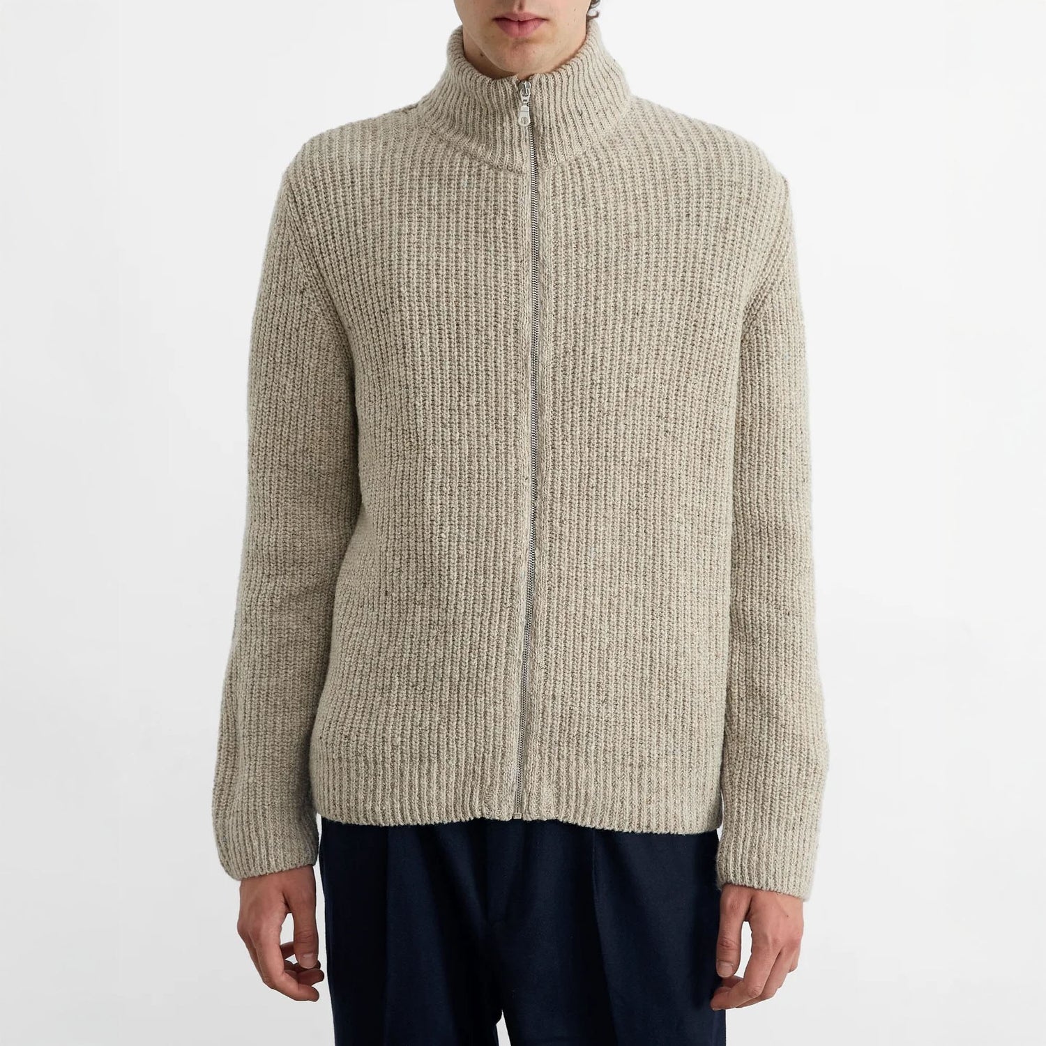 A winter essential with subtle Scandi vibes. This light grey zip-up cardigan is crafted from variegated wool, giving it a rich, textured look with a rustic edge. Finished with ribbed cuffs and hem for a snug fit. Made in Spain, perfect for layering through the colder months.