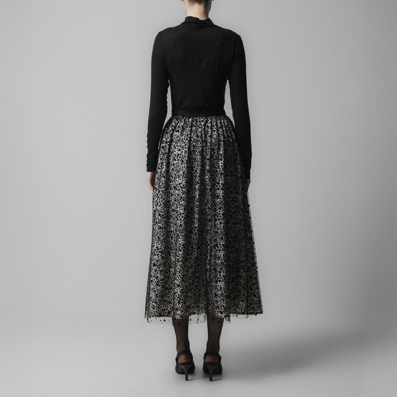 A single layer, twice the charm. This black mesh skirt features a unique fusion of delicate floral and playful polka dot patterns, creating a look that’s both soft and striking.