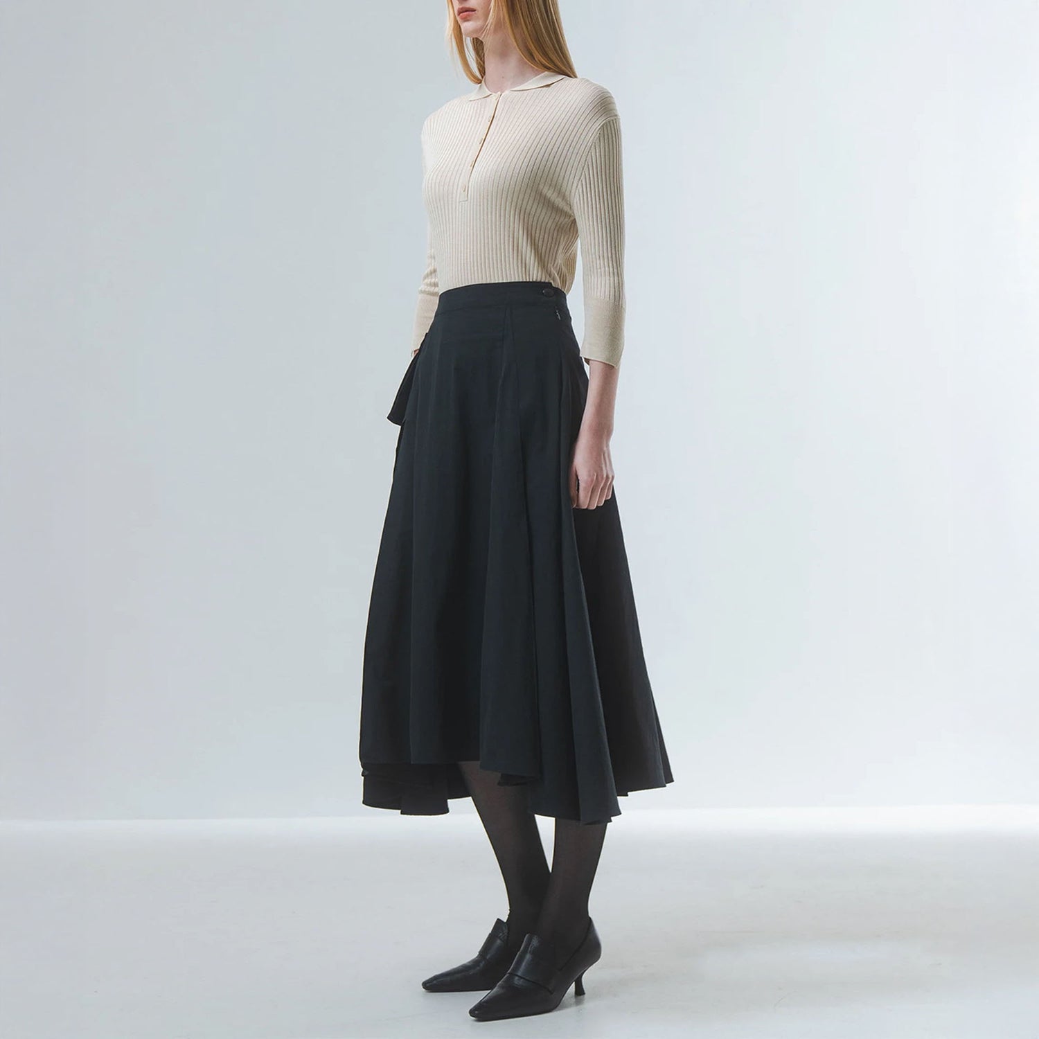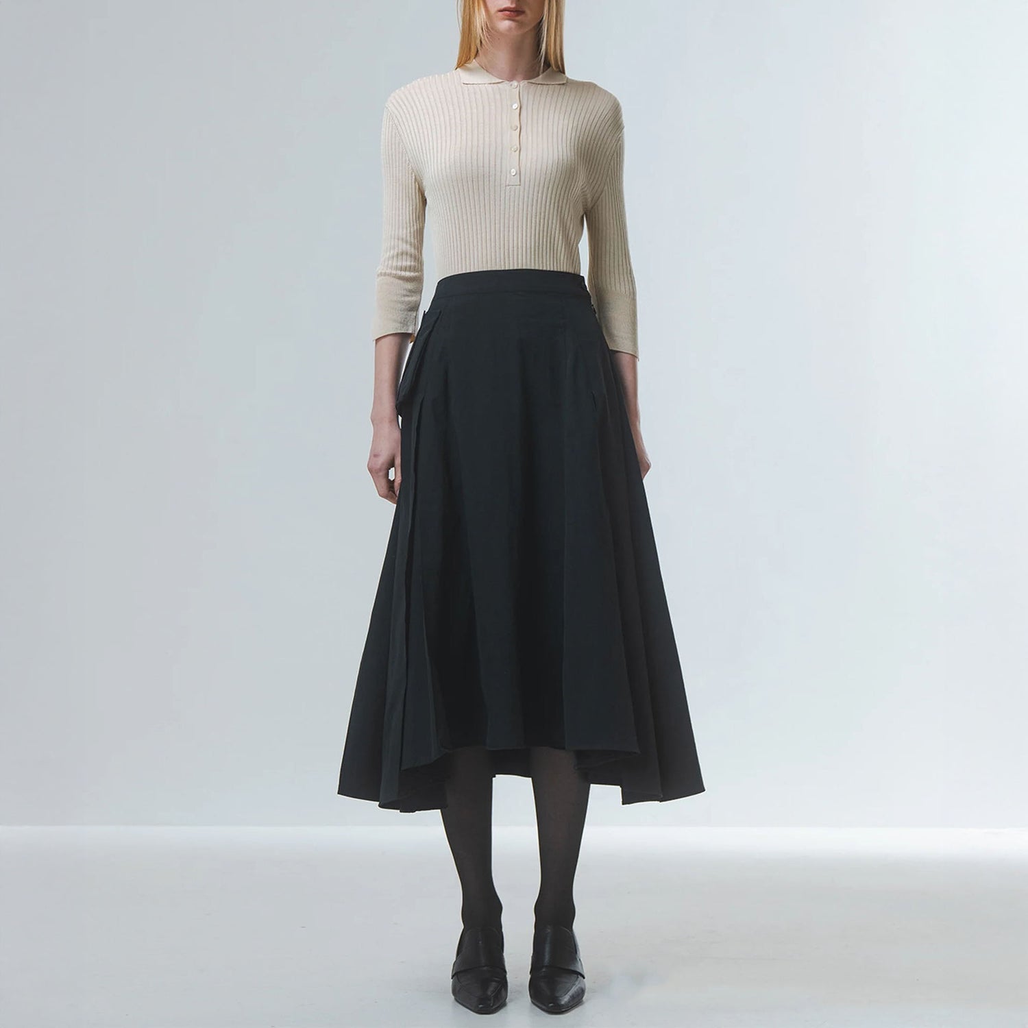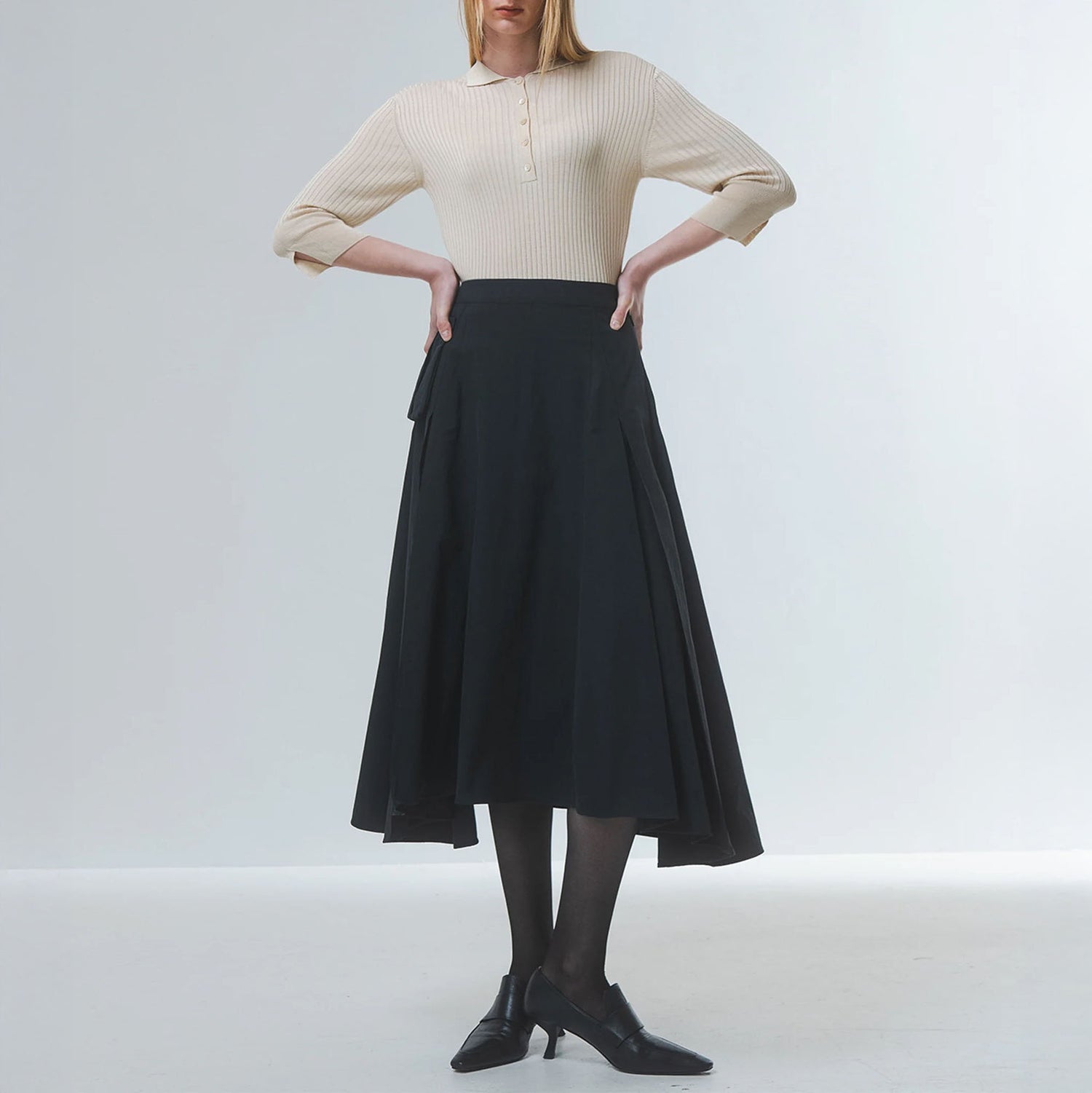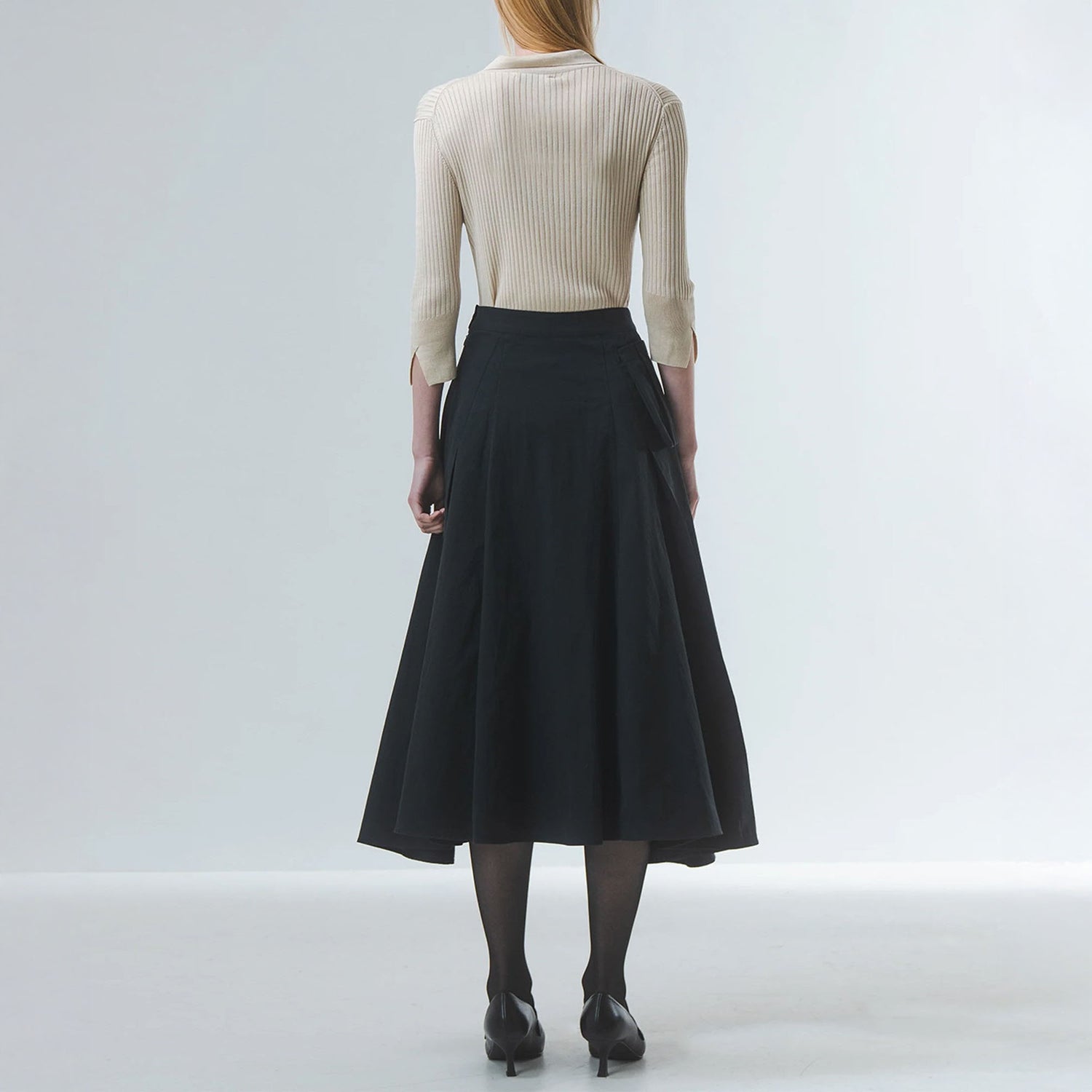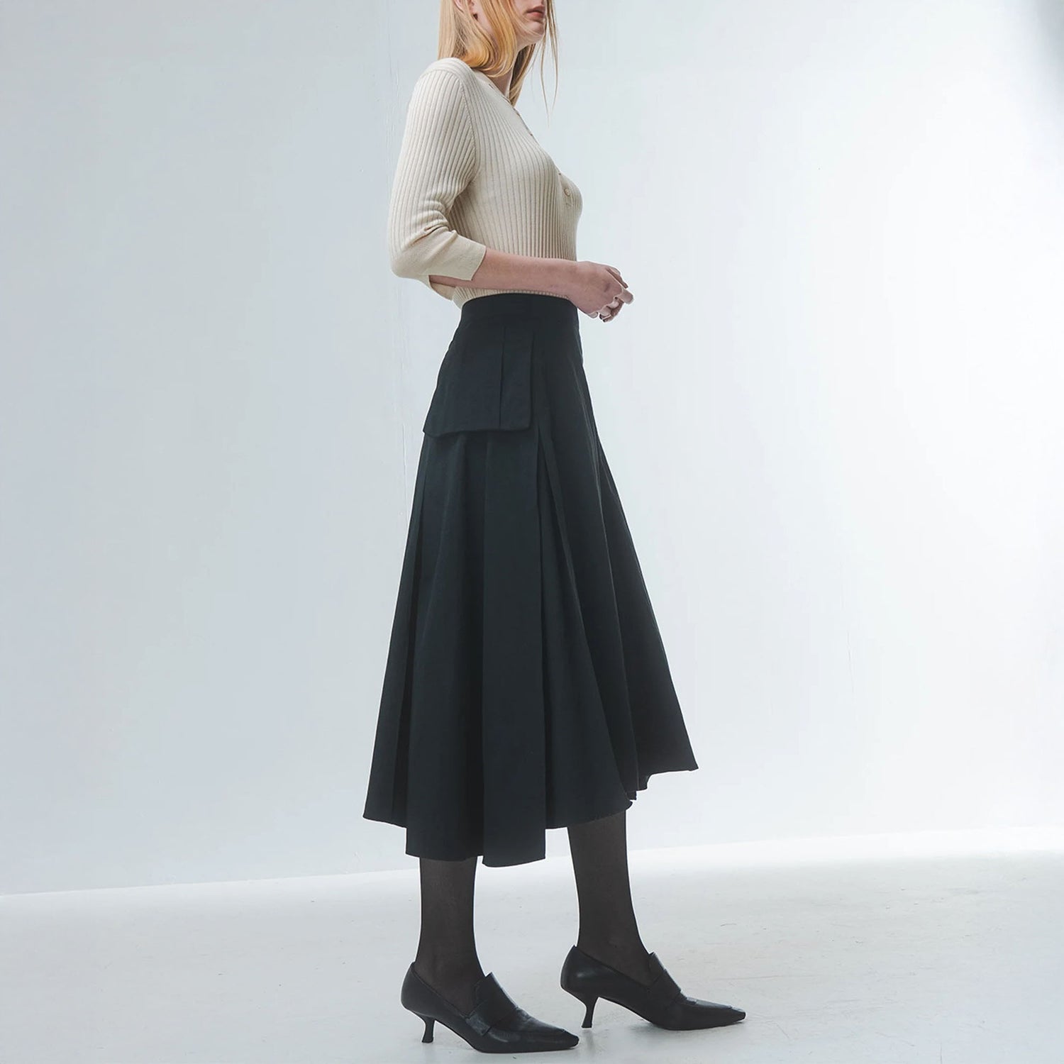 Designed for a cool, structured look with a winter-ready edge, this skirt falls to a midi-length A-line hem that offers movement and modern appeal. Mirrored front darts add sculptural volume, while functional cargo pockets bring a utilitarian twist. A contemporary staple that pairs effortlessly with knits or tailored outerwear.