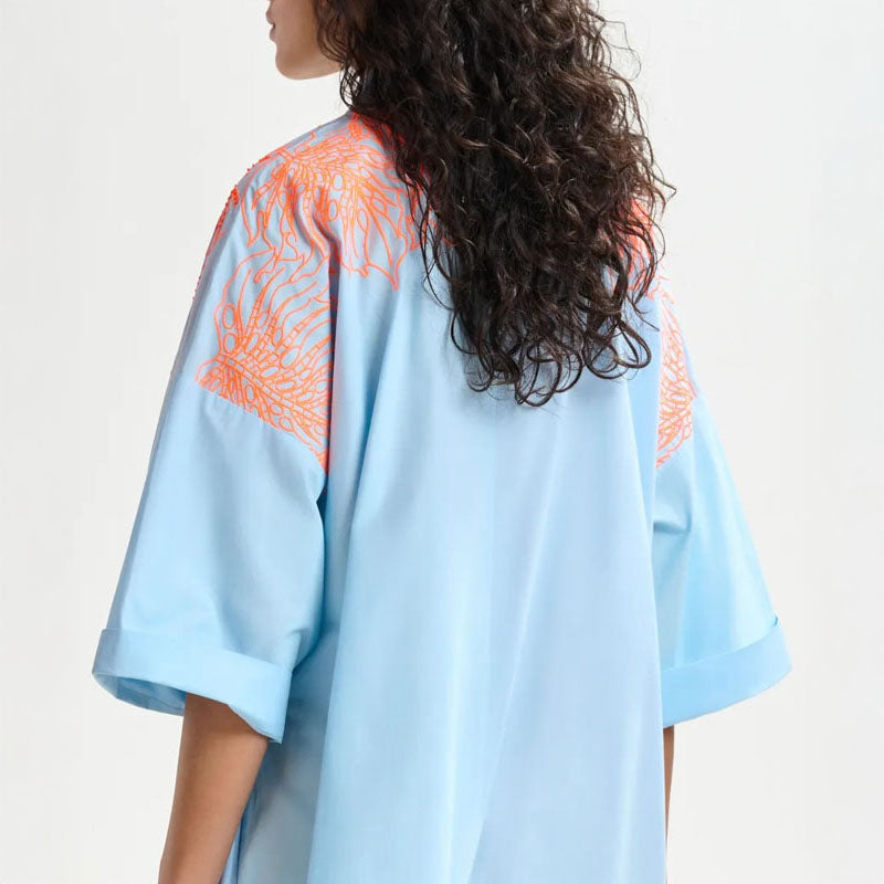 100% Cotton this midi shirt dress features an effortlessly oversized fit with elegant 3/4 trumpet sleeves and a classic button fastening. Delicate floral embroidery, accented with sequin embellishments, adorns the front and back. Finished with a self-tie fabric belt, it offers a customizable silhouette that blends comfort with refined detail.