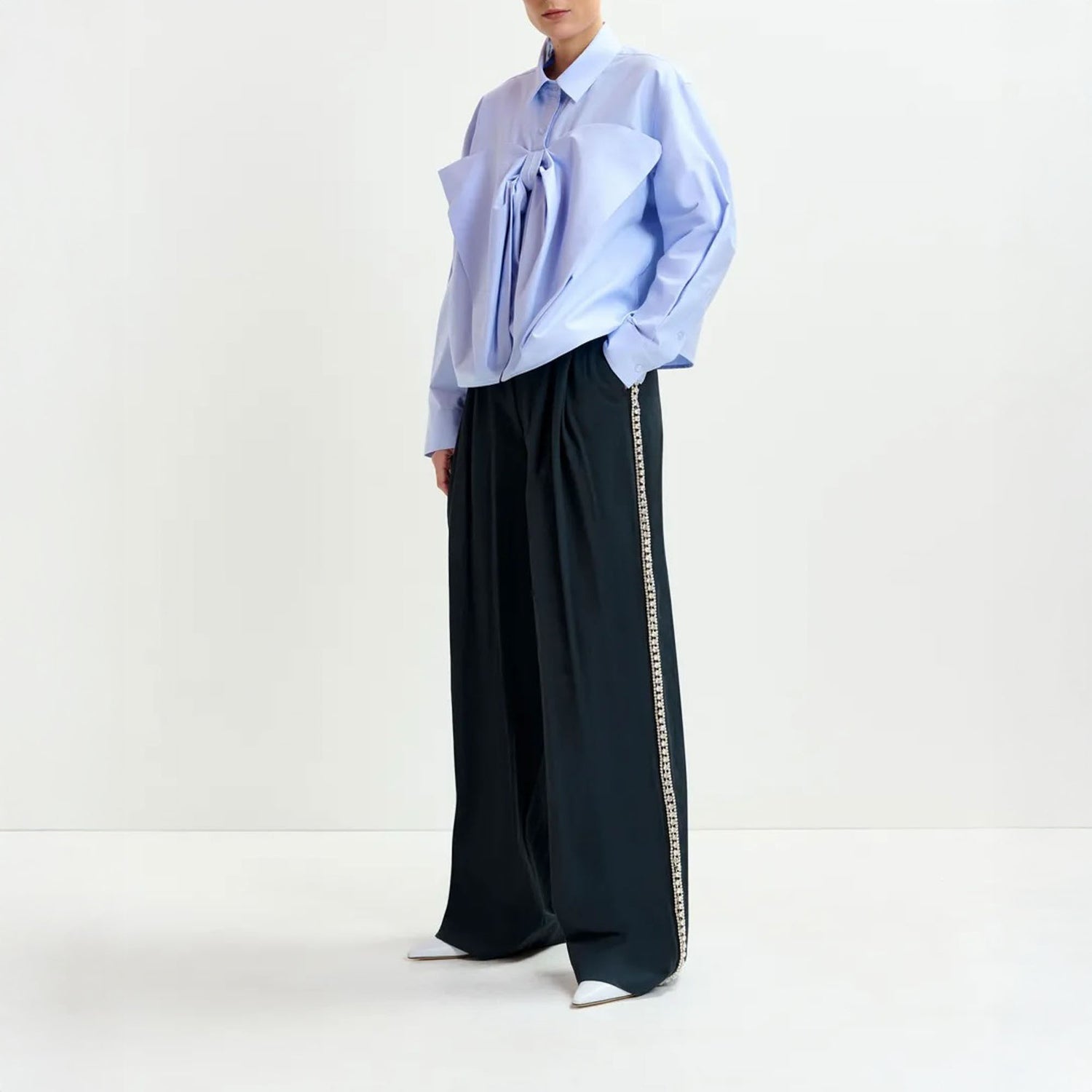 Cotton-blend shirt reimagines classic tailoring with a bold twist. It features a sharp collar and button fastening through the front. The defining detail is a dramatic self-fabric bow at the chest, adding playful elegance.