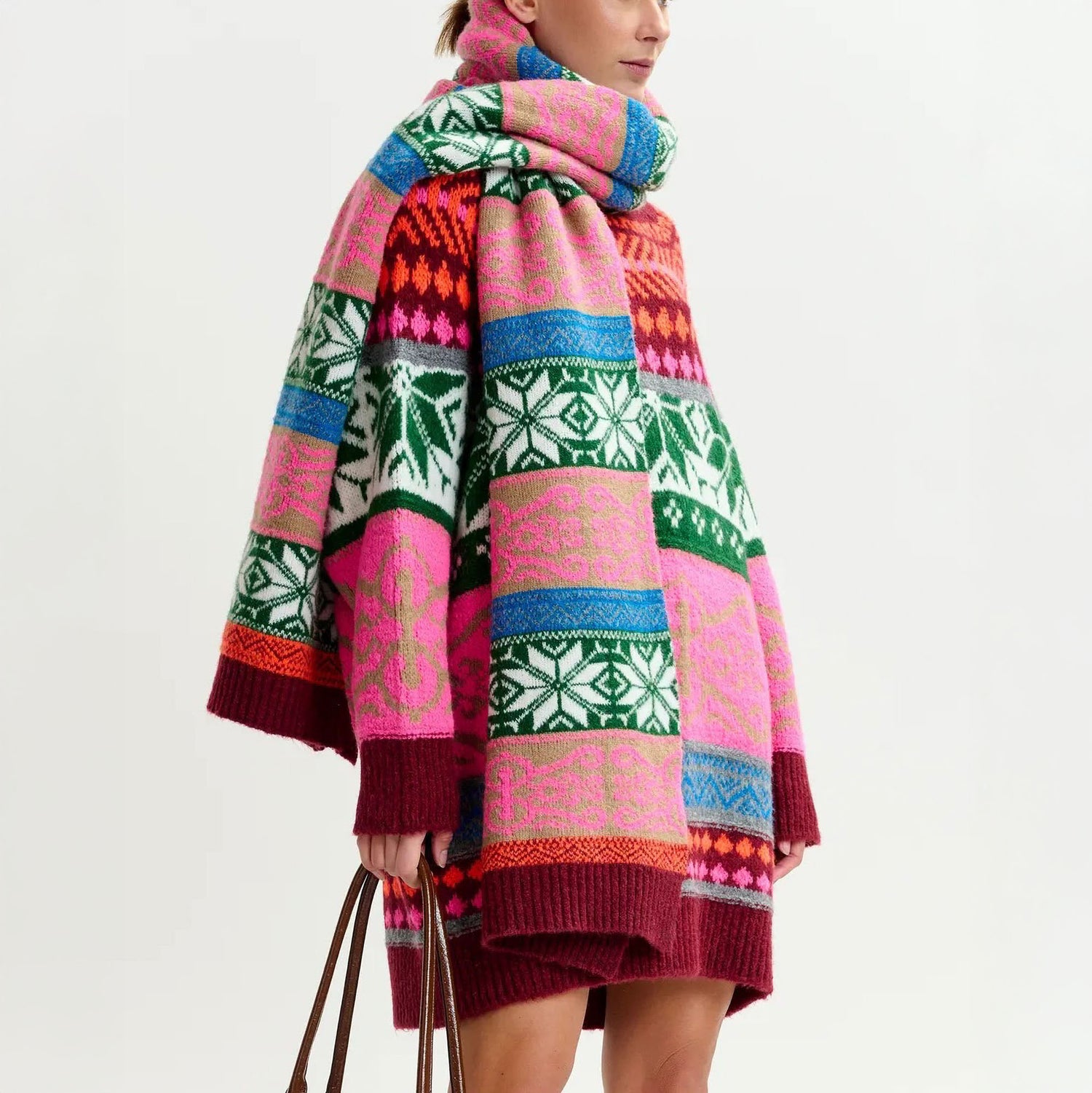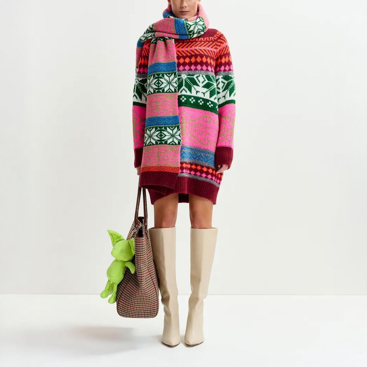Wrap yourself in colour and comfort with this jacquard knit scarf, featuring a bold multicolour pattern and intricate detailing throughout. Measuring 230 x 38.5 cm, it offers generous coverage for chilly days without feeling bulky. Ribbed trims at the ends add a refined touch, making it the perfect finishing piece.