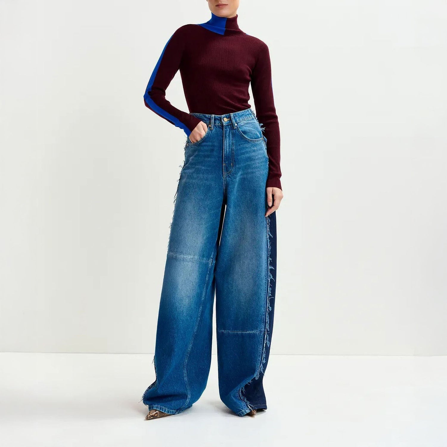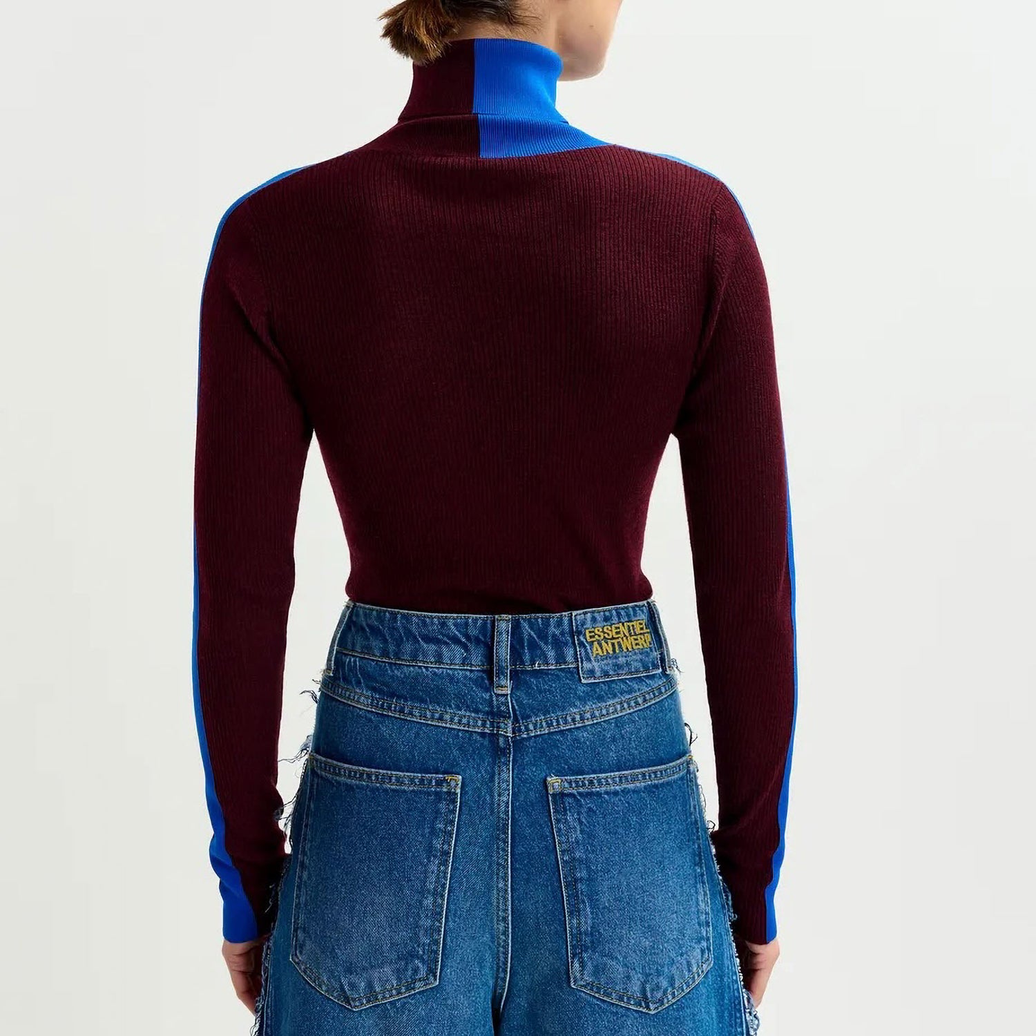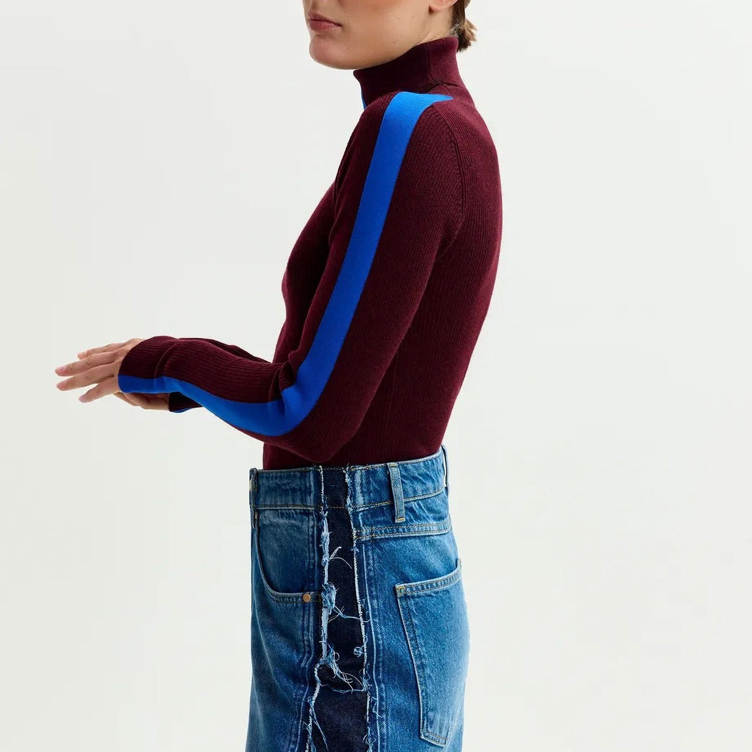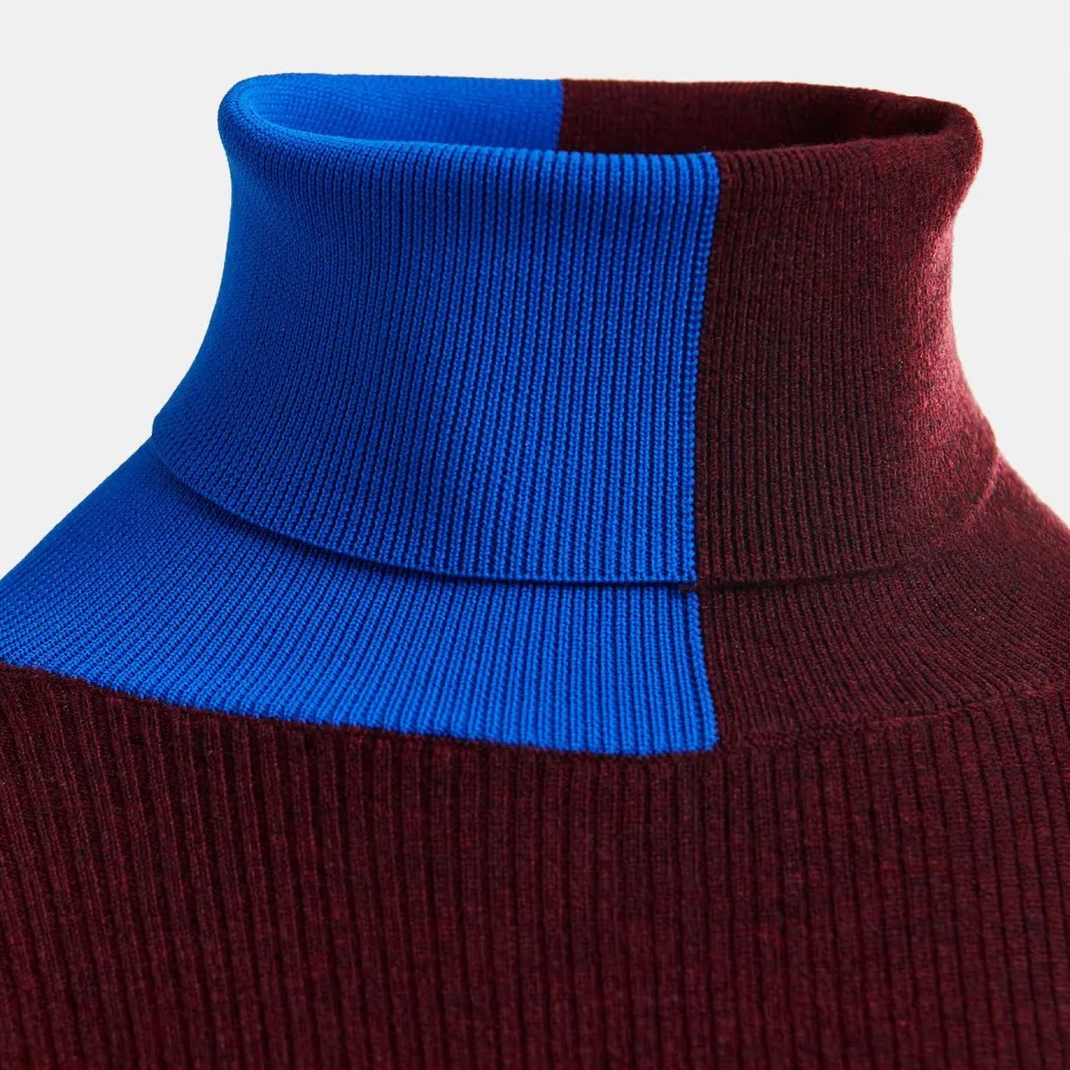 This close-fitting sweater is made from a wool blend with recycled polyester and features an all-over ribbed texture. Its striking two-tone design contrasts the front and back panels, while an asymmetric turtleneck adds a modern twist. Finished with ribbed edges, it’s a sophisticated piece with standout appeal.