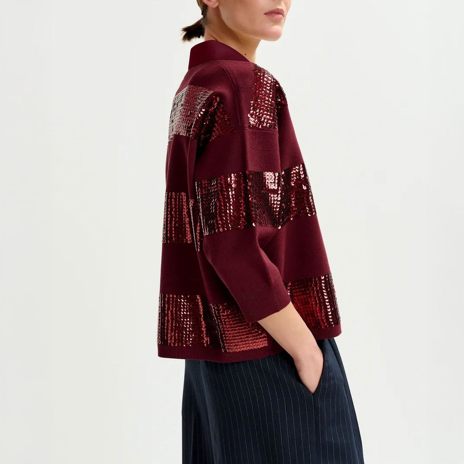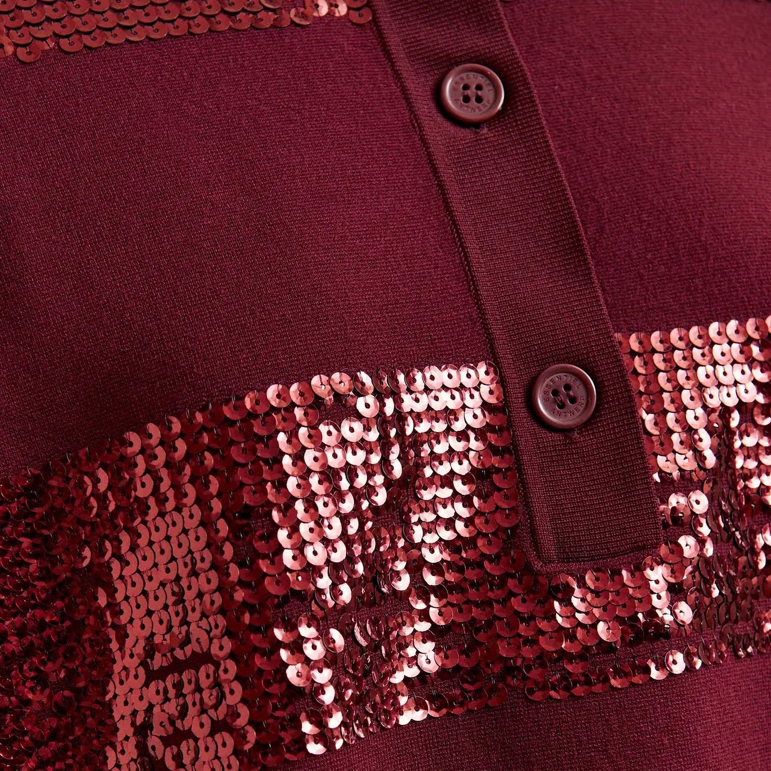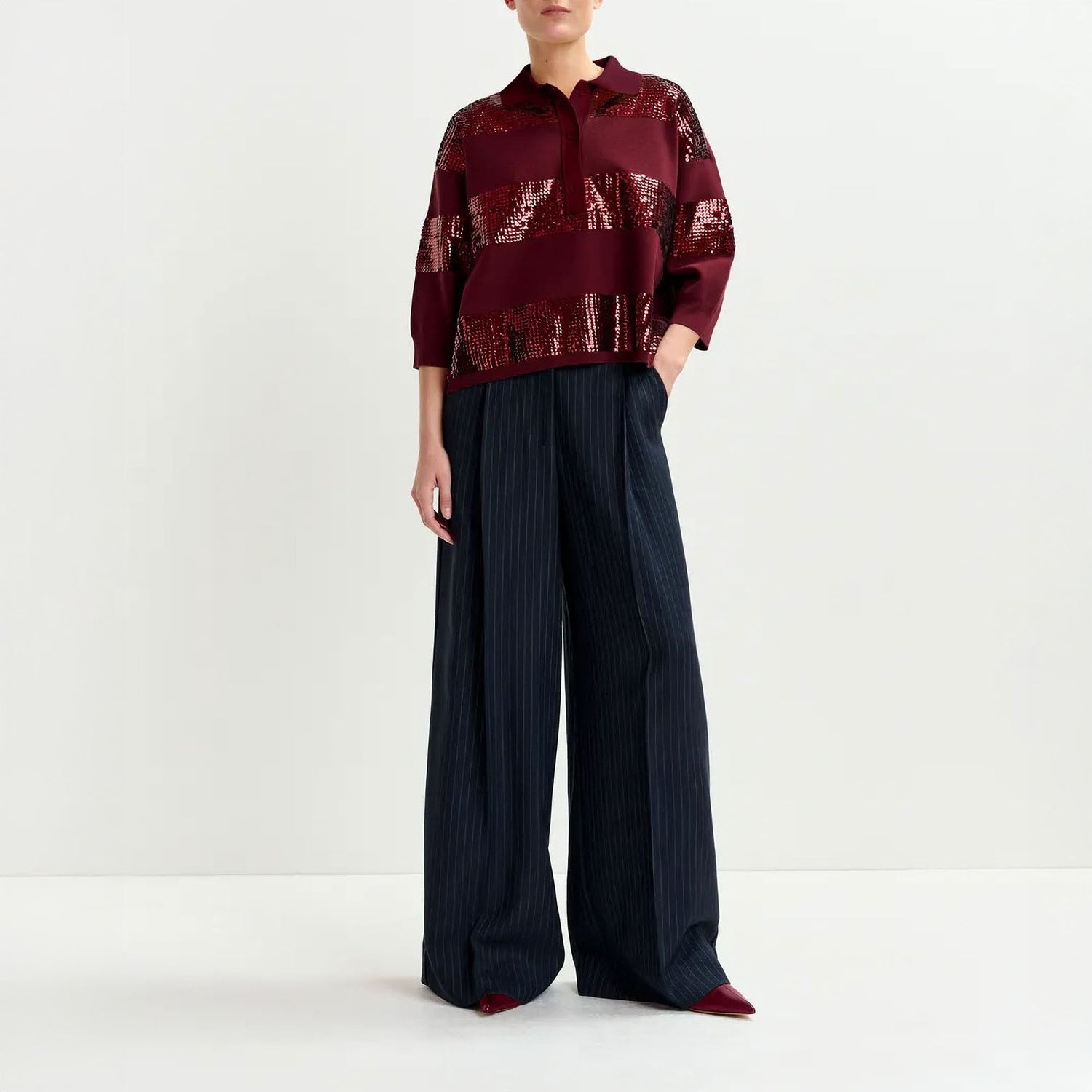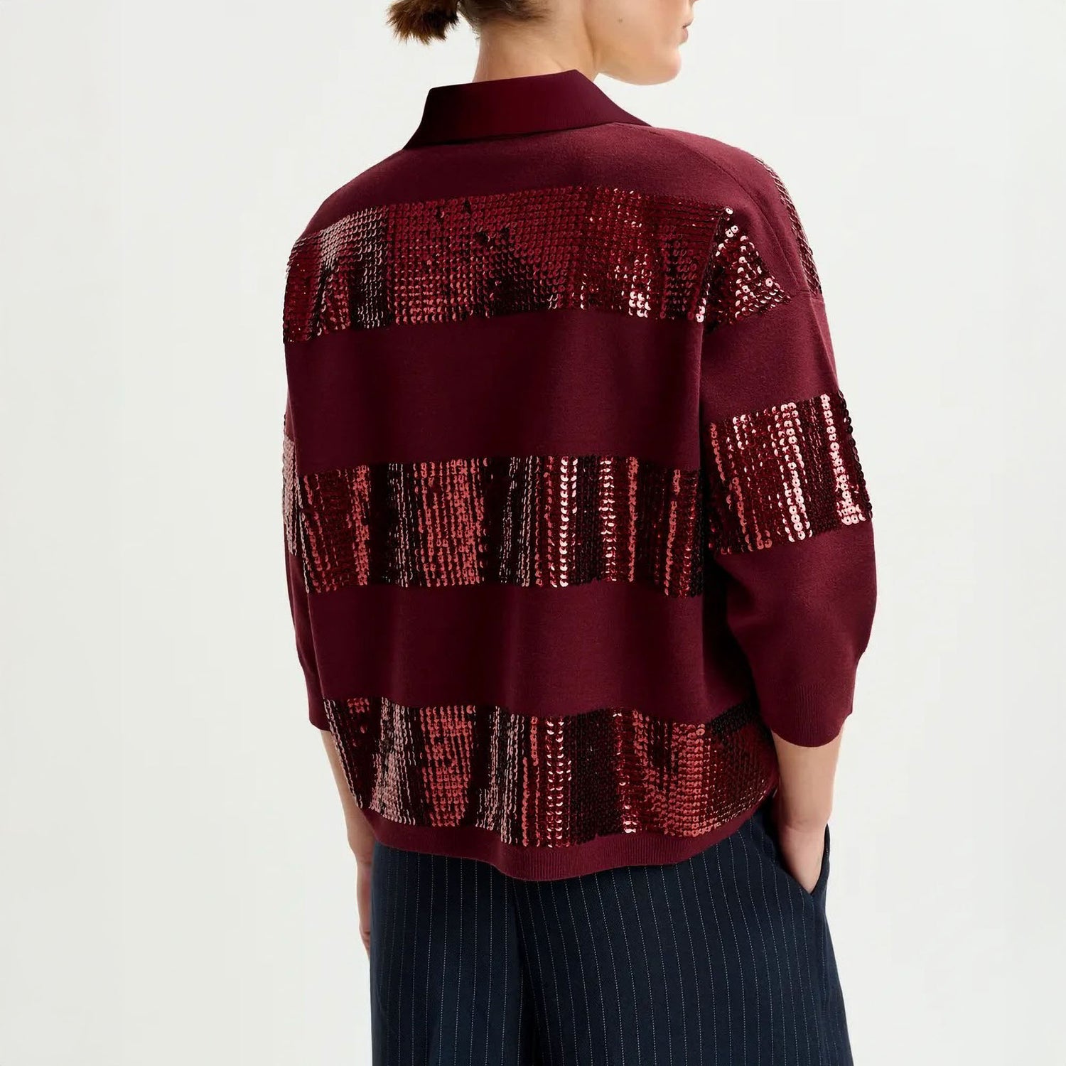 This fine-knit polo combines sporty structure with eye-catching sparkle. Cut for a relaxed fit, it showcases sequin-embellished stripes across the body and sleeves, offset by a striking collar and placket. Dropped shoulders, three-quarter sleeves, and a gently curved hem enhance the laid-back silhouette, while ribbed trims offer a polished finish.