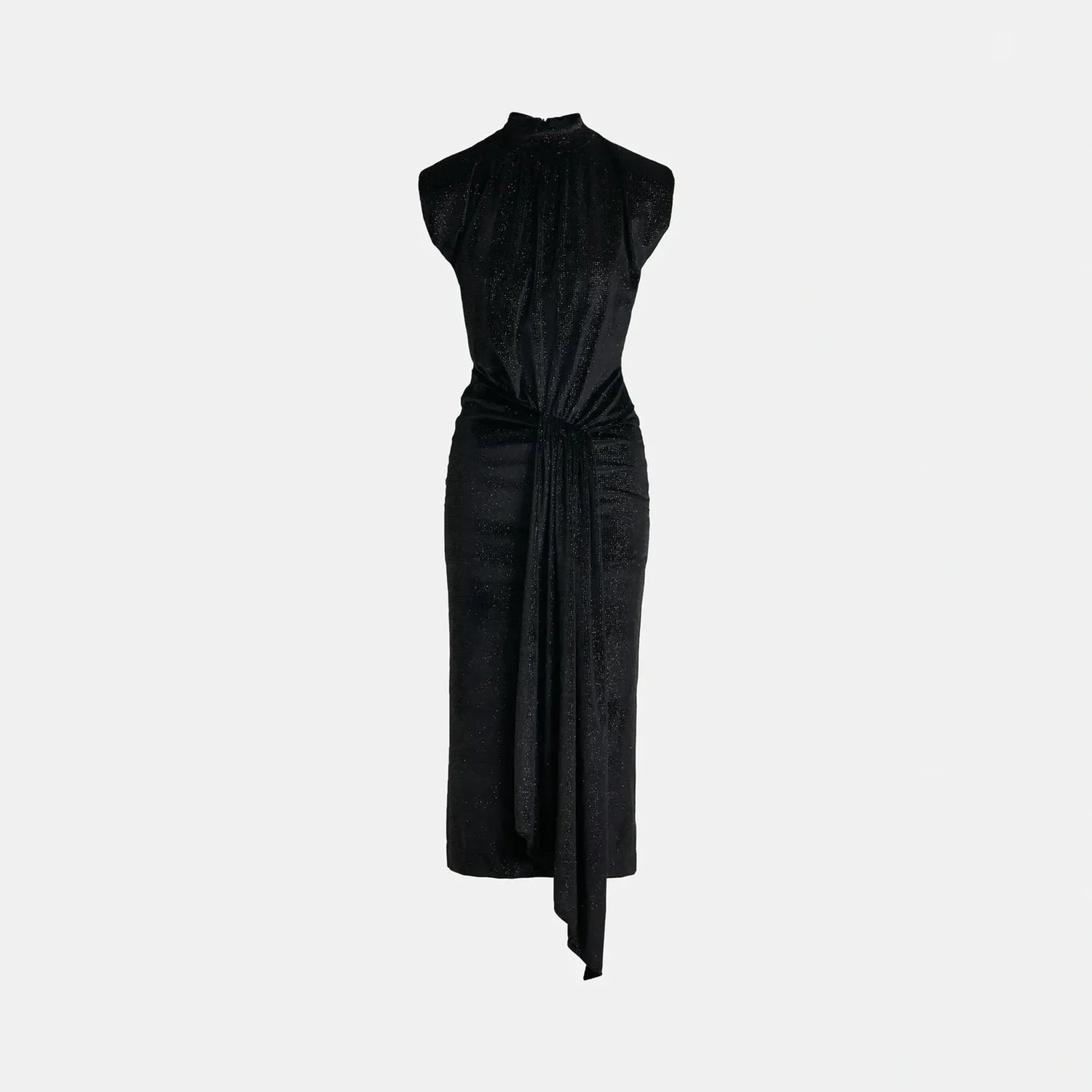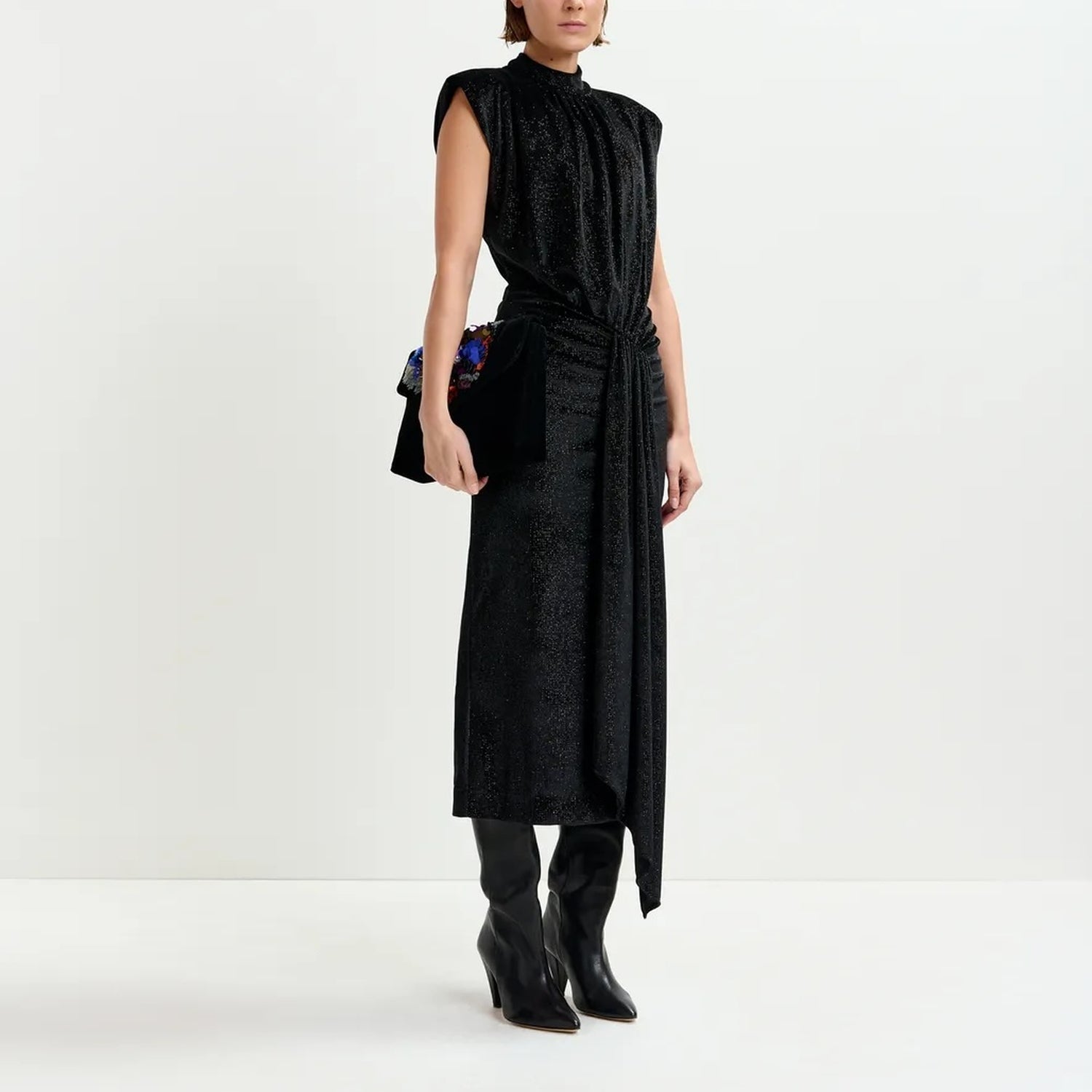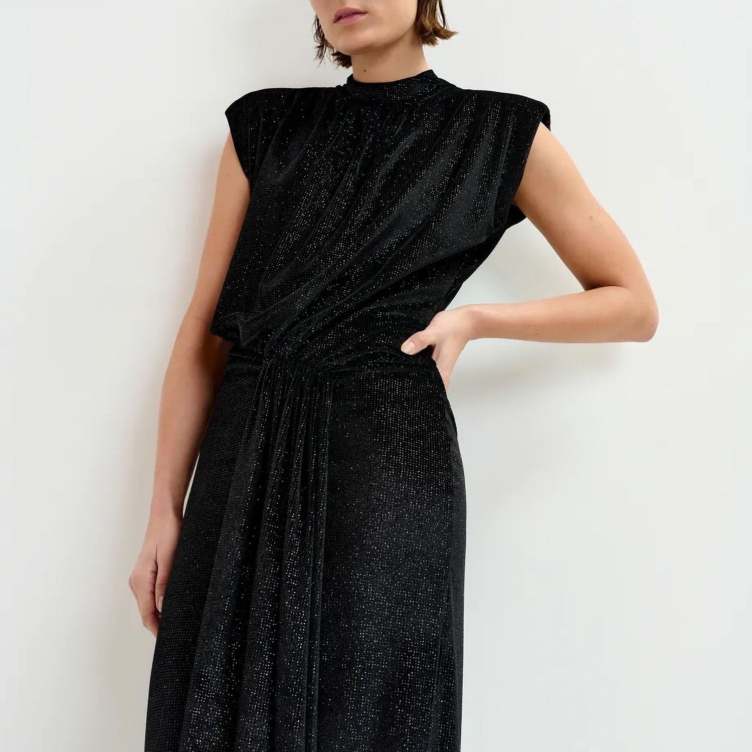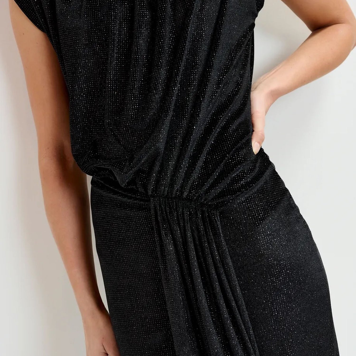 Midi dress, cut from a comfortable stretch-jersey fabric embellished with black-tone dots for a glitter-like finish. It features a figure-hugging silhouette at the waist and falls into a wrap-inspired skirt with box pleat gathering at the front and generous split. Lightly padded shoulders and a flattering mock neck complete the design.
