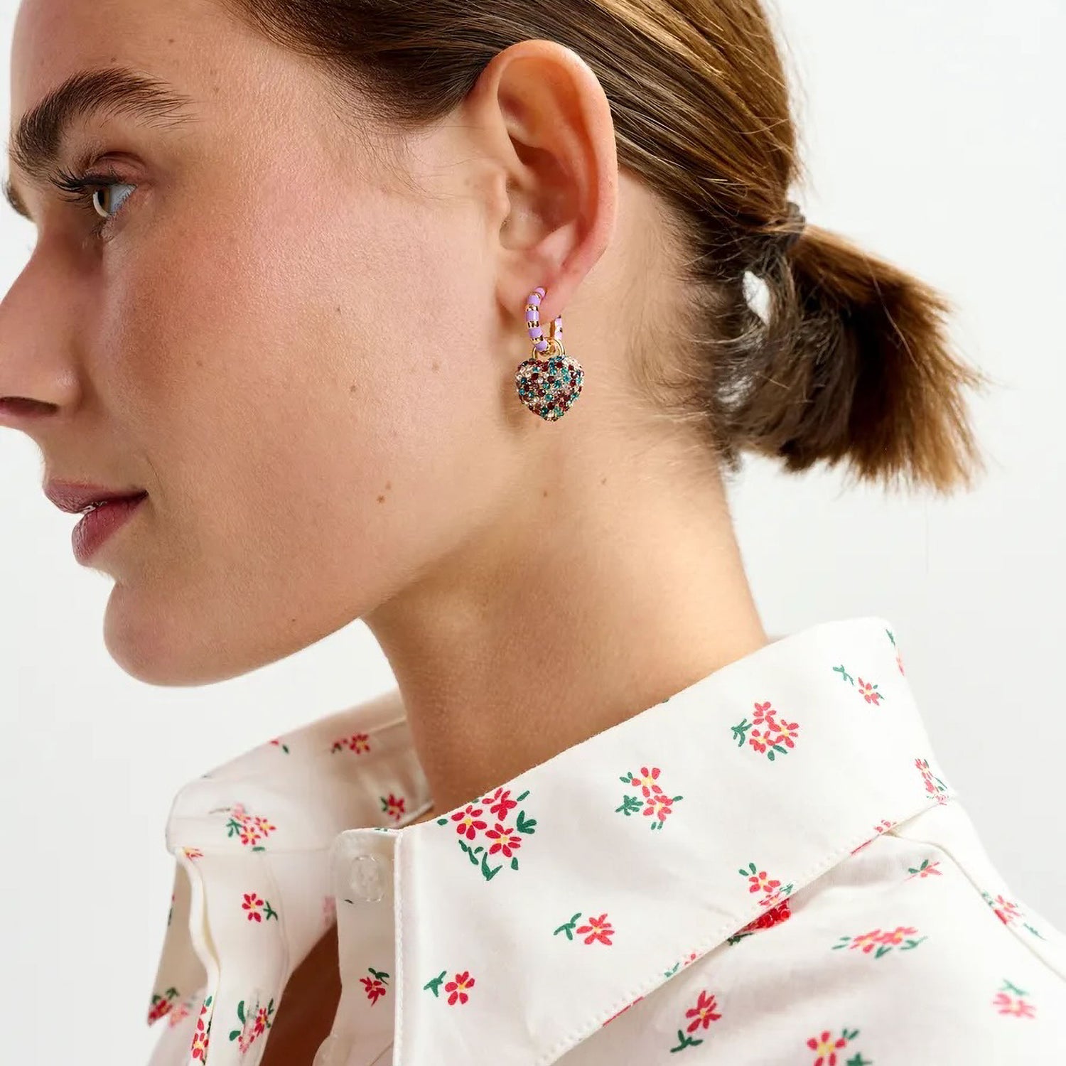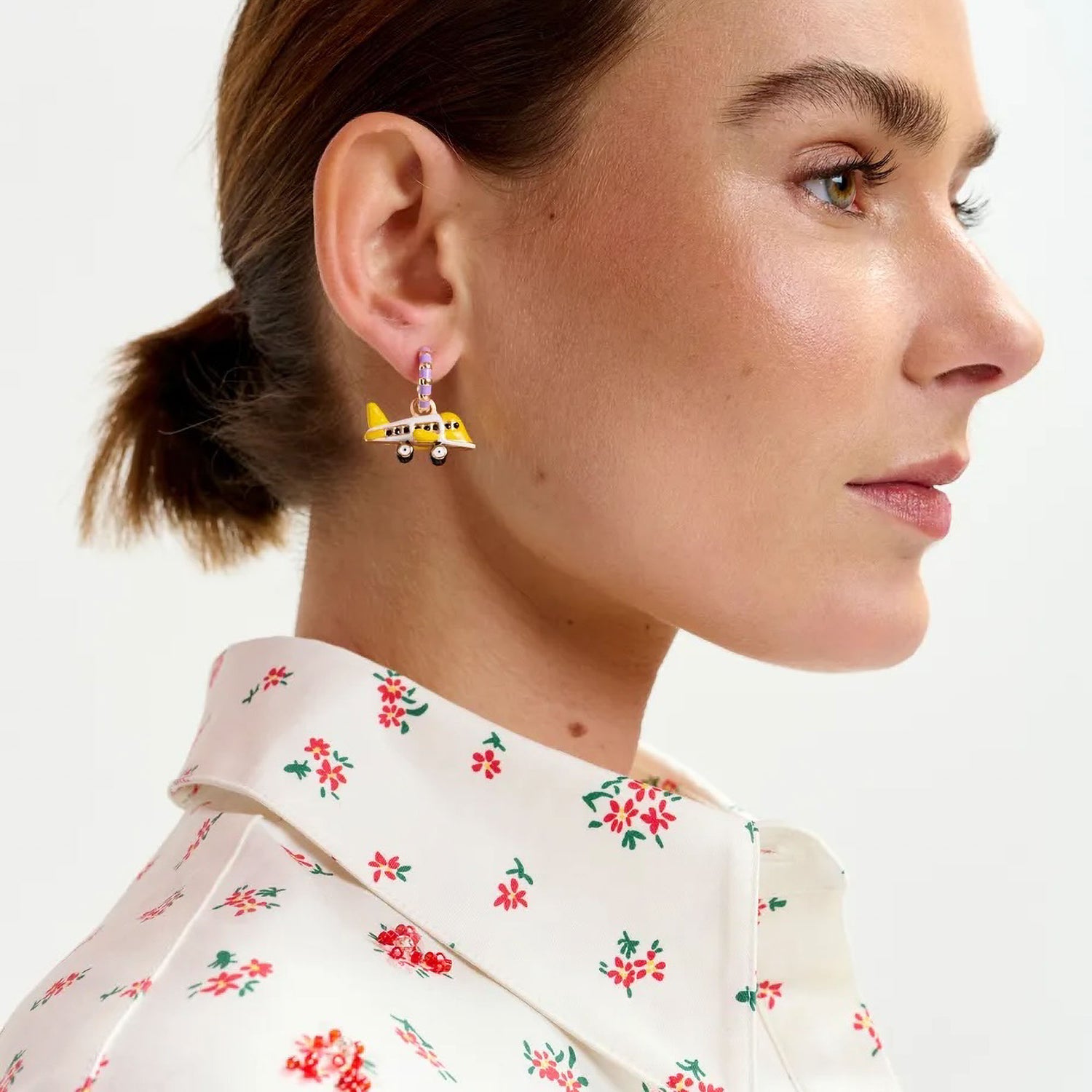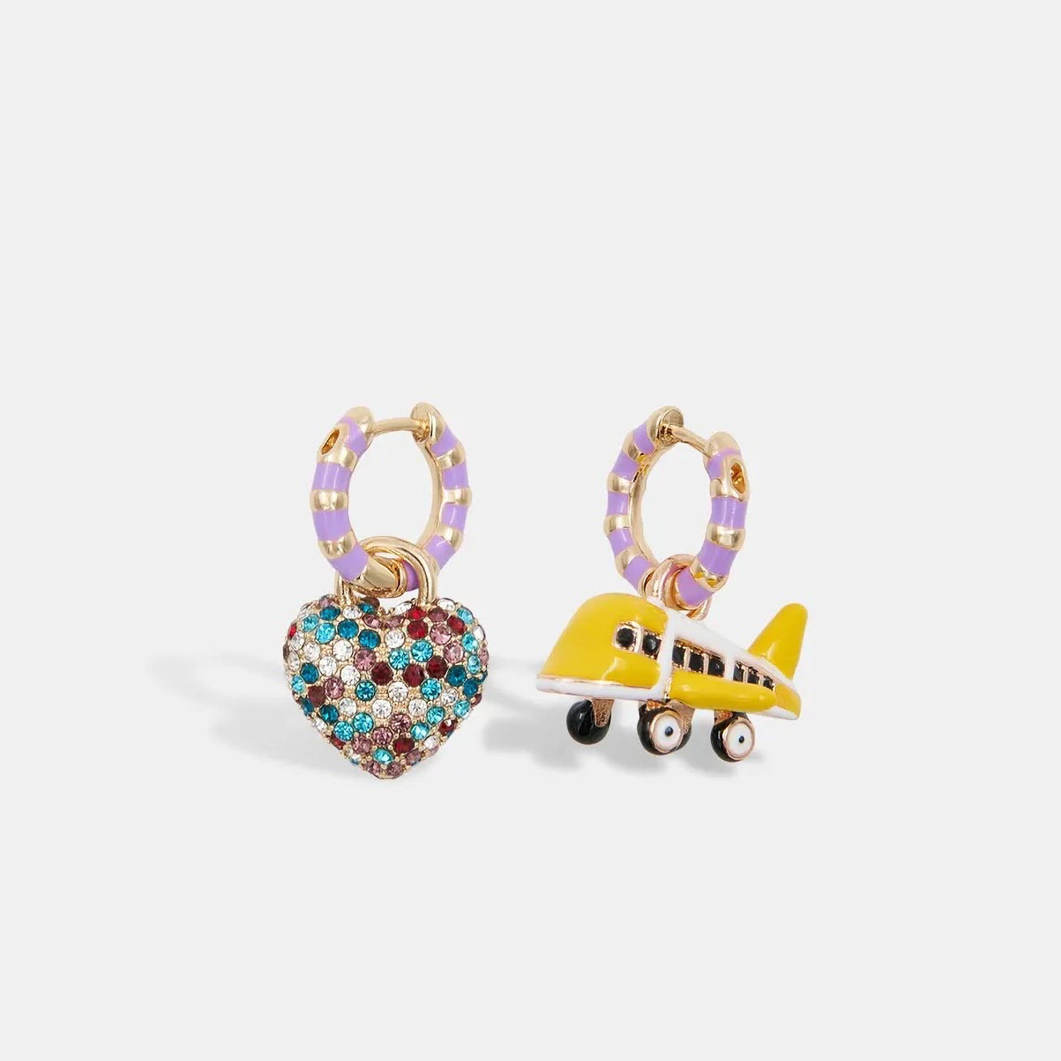 Flying straight to your heart! These small hoops are strung with an enamel plane pendant and an rhinestone-encrusted heart pendant