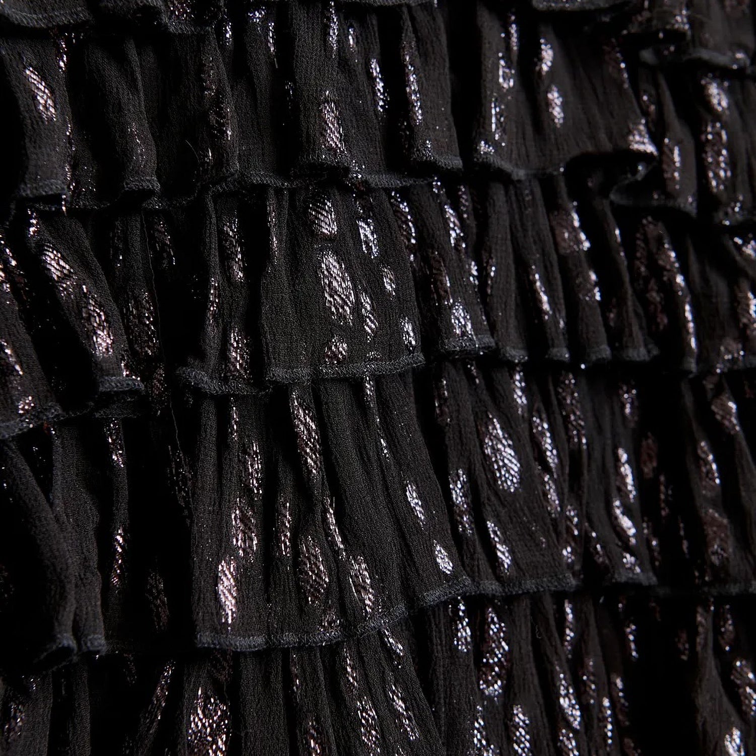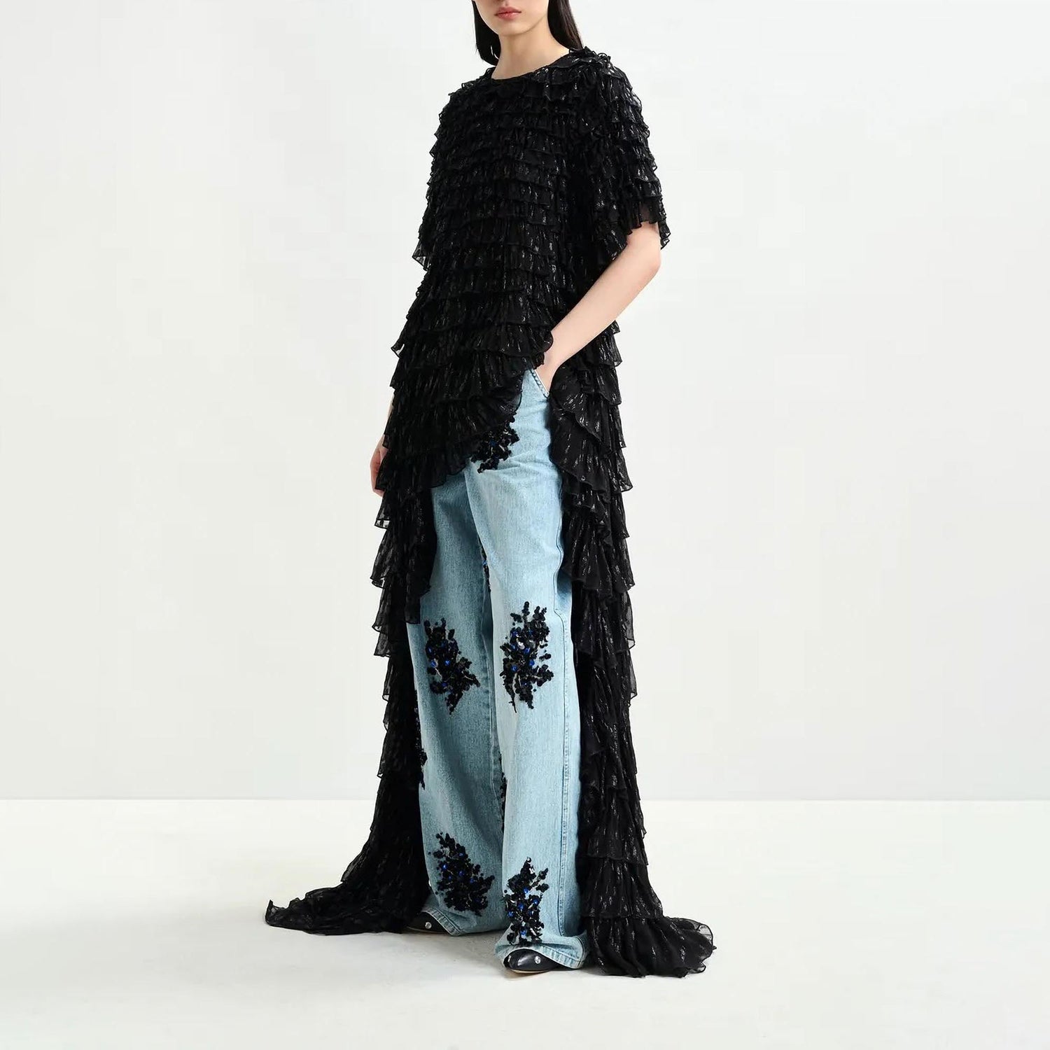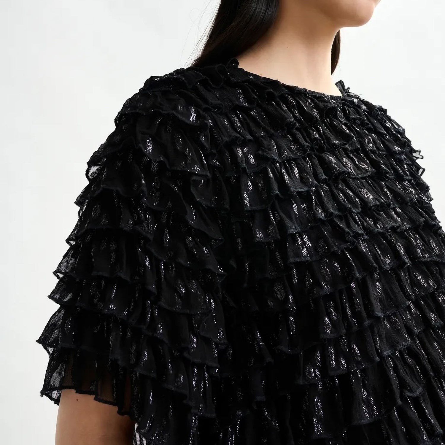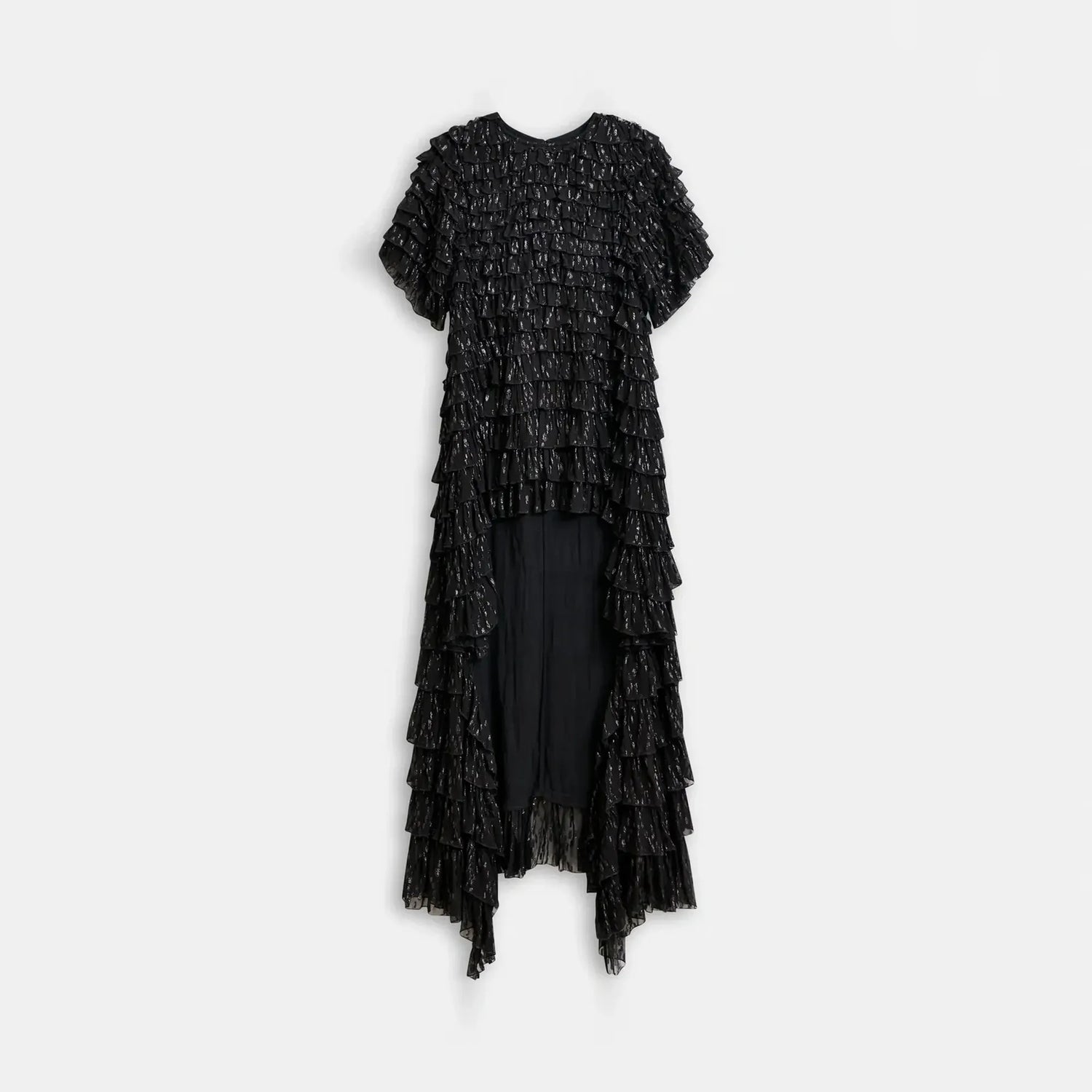 This floor-length maxi dress is crafted from layered tiers of tonal ruffled tulle, delivering stunning texture and striking volume. With its easy, relaxed silhouette, it features a round neckline, T-shirt sleeves, and an asymmetric cascading hem that flows gracefully to the floor. Partially open sides and a fluid drape add a sense of movement and depth... making it a cool, standout piece that's perfect for the upcoming season.