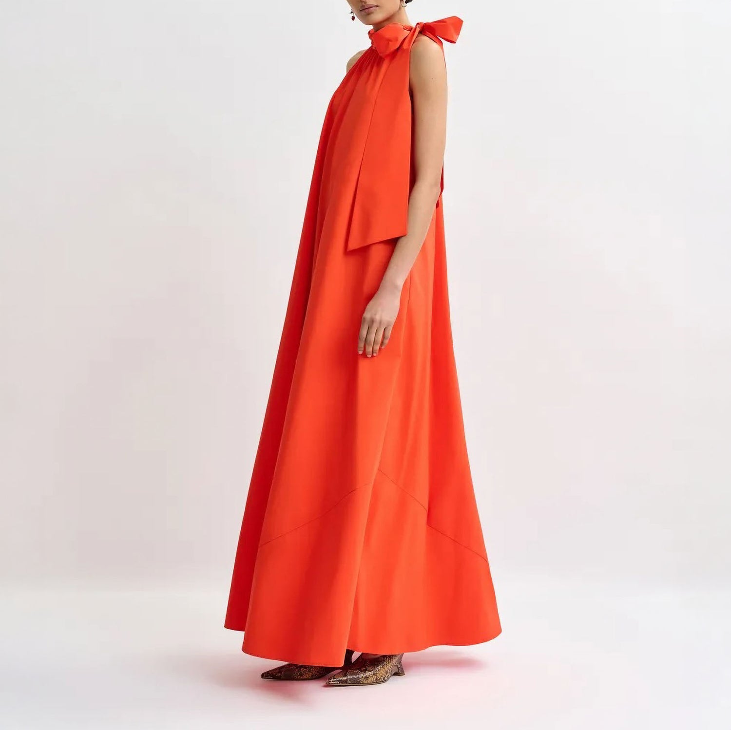 This dress flows gracefully over the figure, falling to a striking floor-length silhouette. Crafted from recycled polyester, it is cut in an elegant A-line shape and features a high neckline with a refined knot detail at the front. Discreet slit pockets add a practical touch while maintaining a clean, polished look.