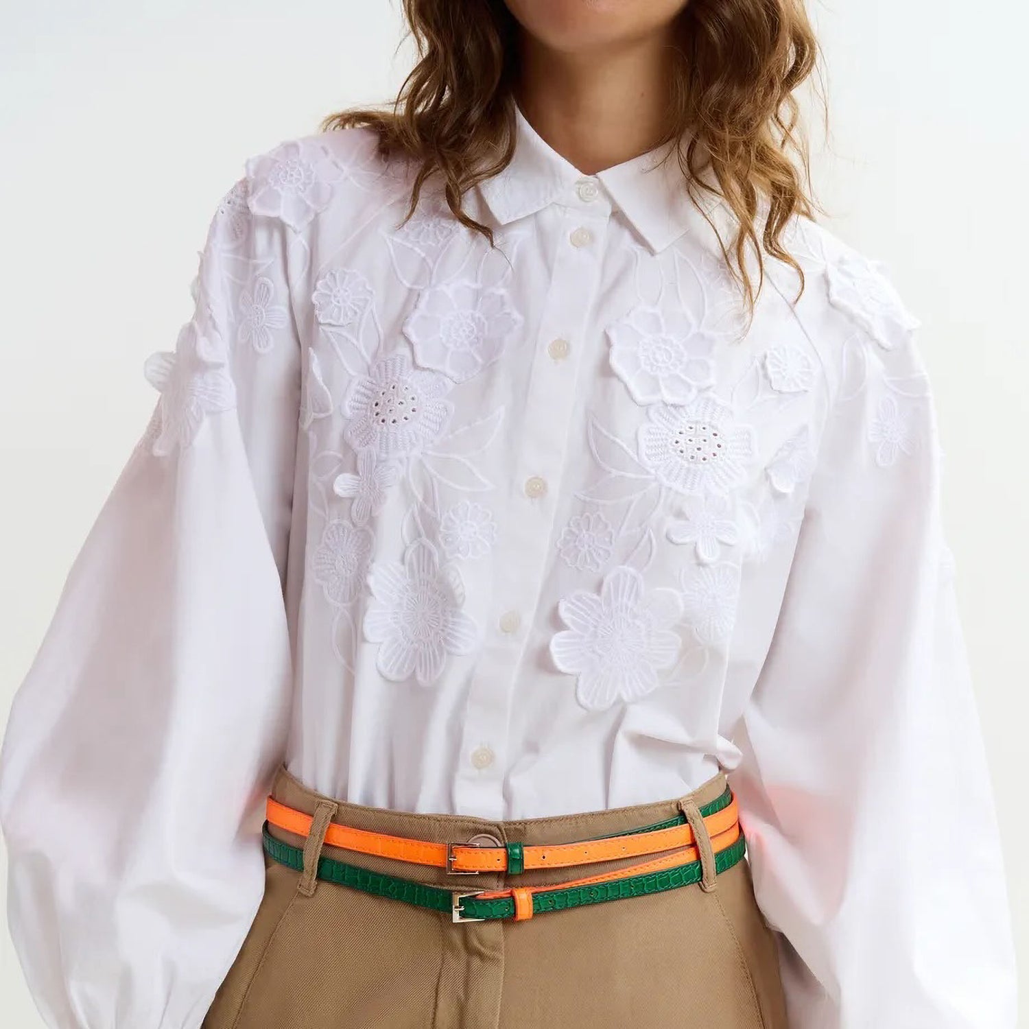 This 100% cotton shirt is crafted from crisp cotton poplin and adorned with embroidered appliqué flowers throughout. It features voluminous balloon sleeves with raglan shoulders, gathering neatly at elasticated cuffs, and a refined collar for a polished finish.