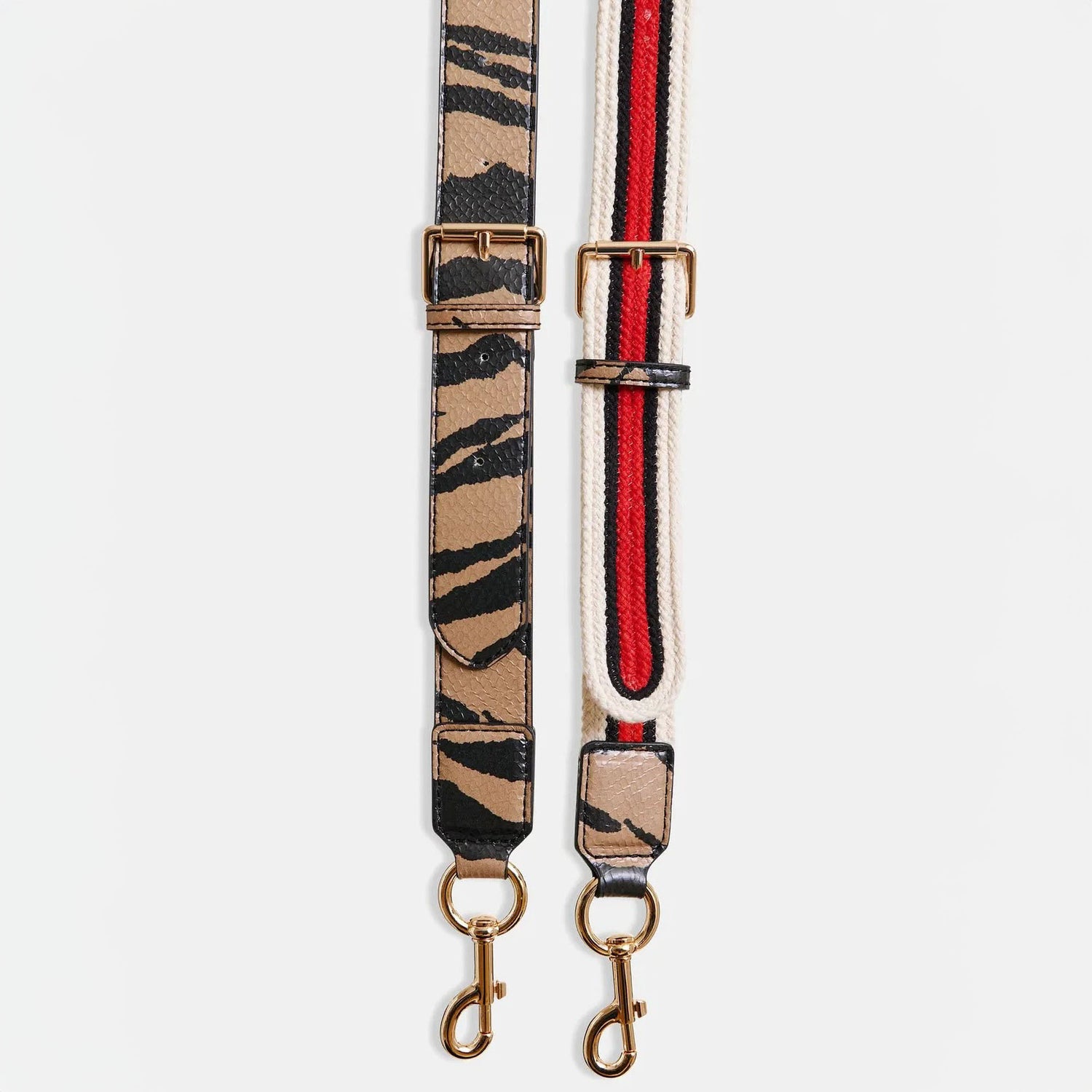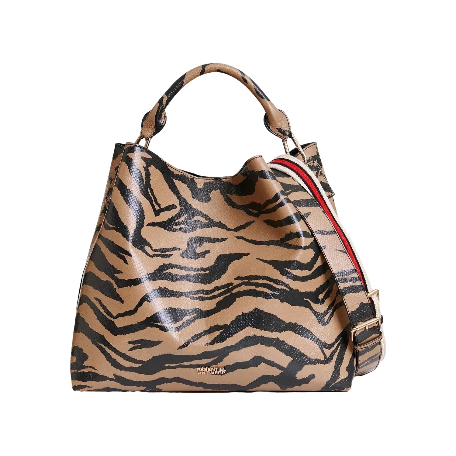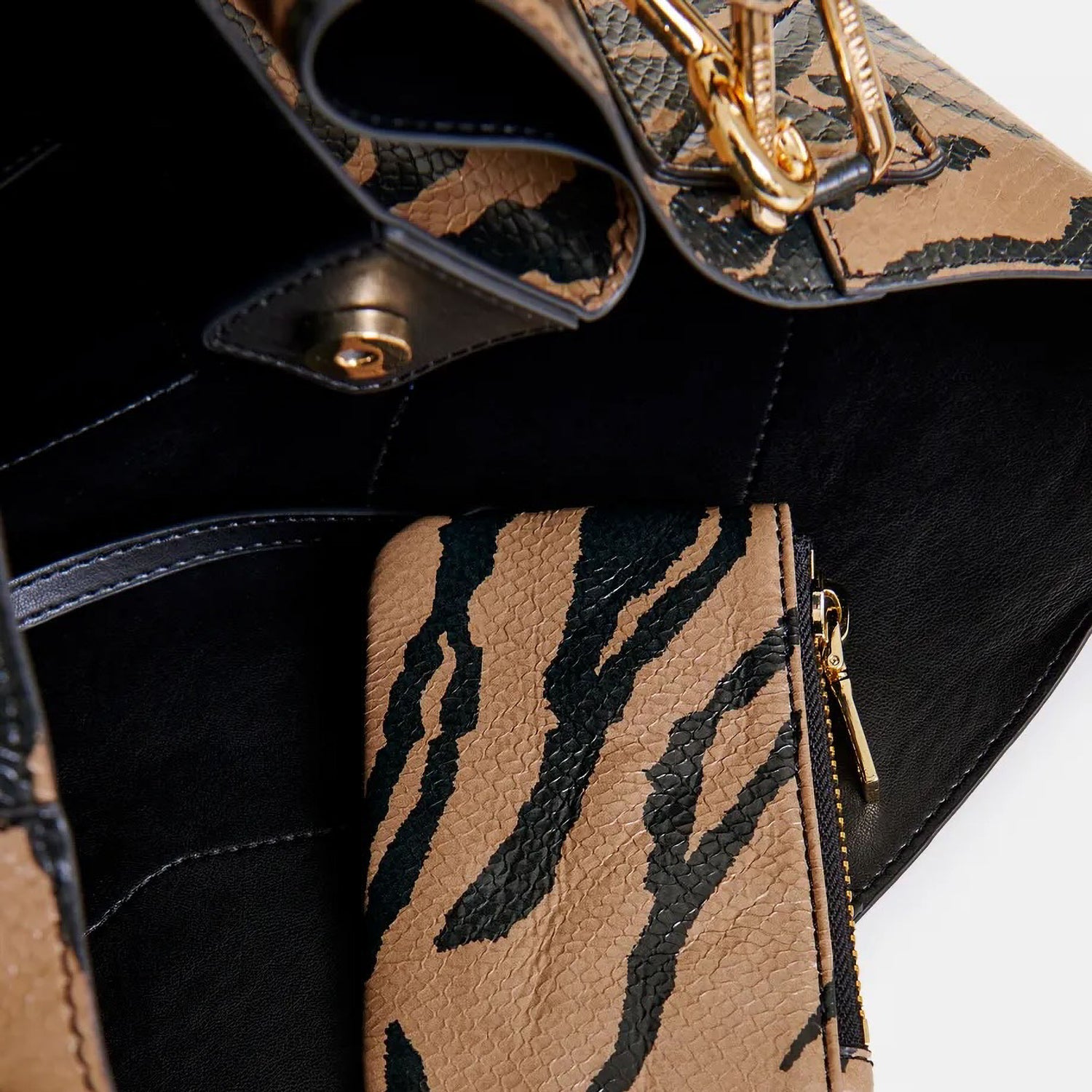 Made from glossy faux leather, this rectangular shopper bag features a bold tiger print and playful patch details. It comes with two detachable shoulder straps, one that matches the bag and another styled like a belt, so you can carry it by hand or wear it hands-free. The lined interior has a zipped pouch and card slot to keep your essentials safe, while gold hardware and logo accents give it a stylish finishing touch.