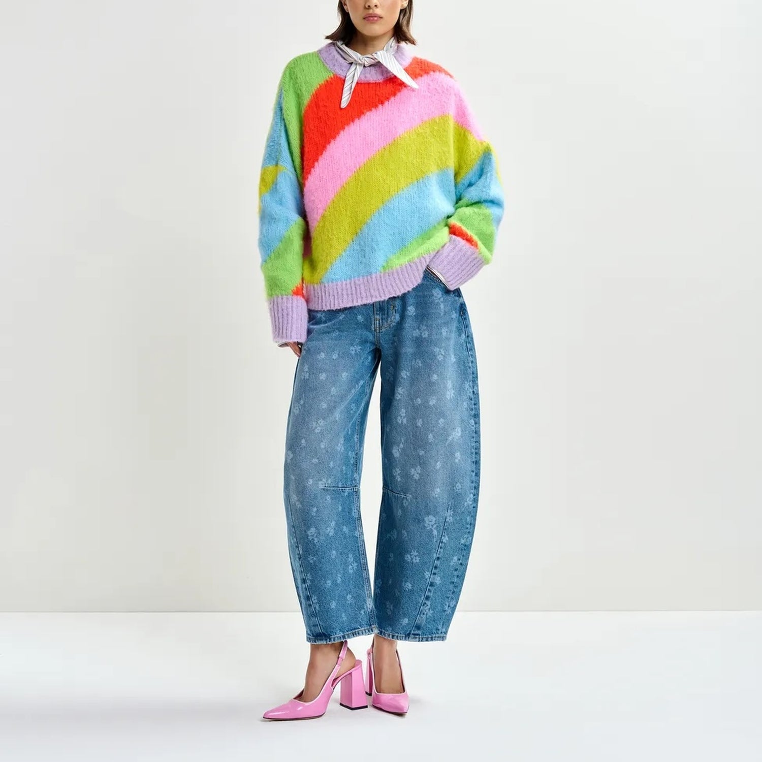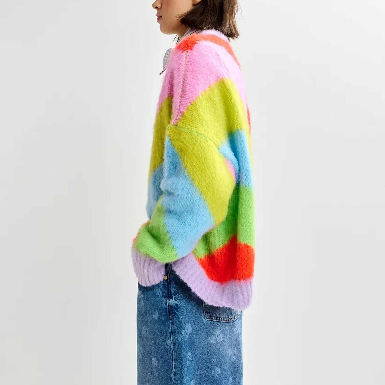 If you’re after a pop of colour, this is the jumper for you. Intarsia knitted with a touch of alpaca wool, it showcases a playful striped pattern accented with vibrant pops of bright colour. The relaxed silhouette is complemented by dropped shoulders, while ribbed trims add a neat, polished finish. Cosy, cheerful and full of personality.