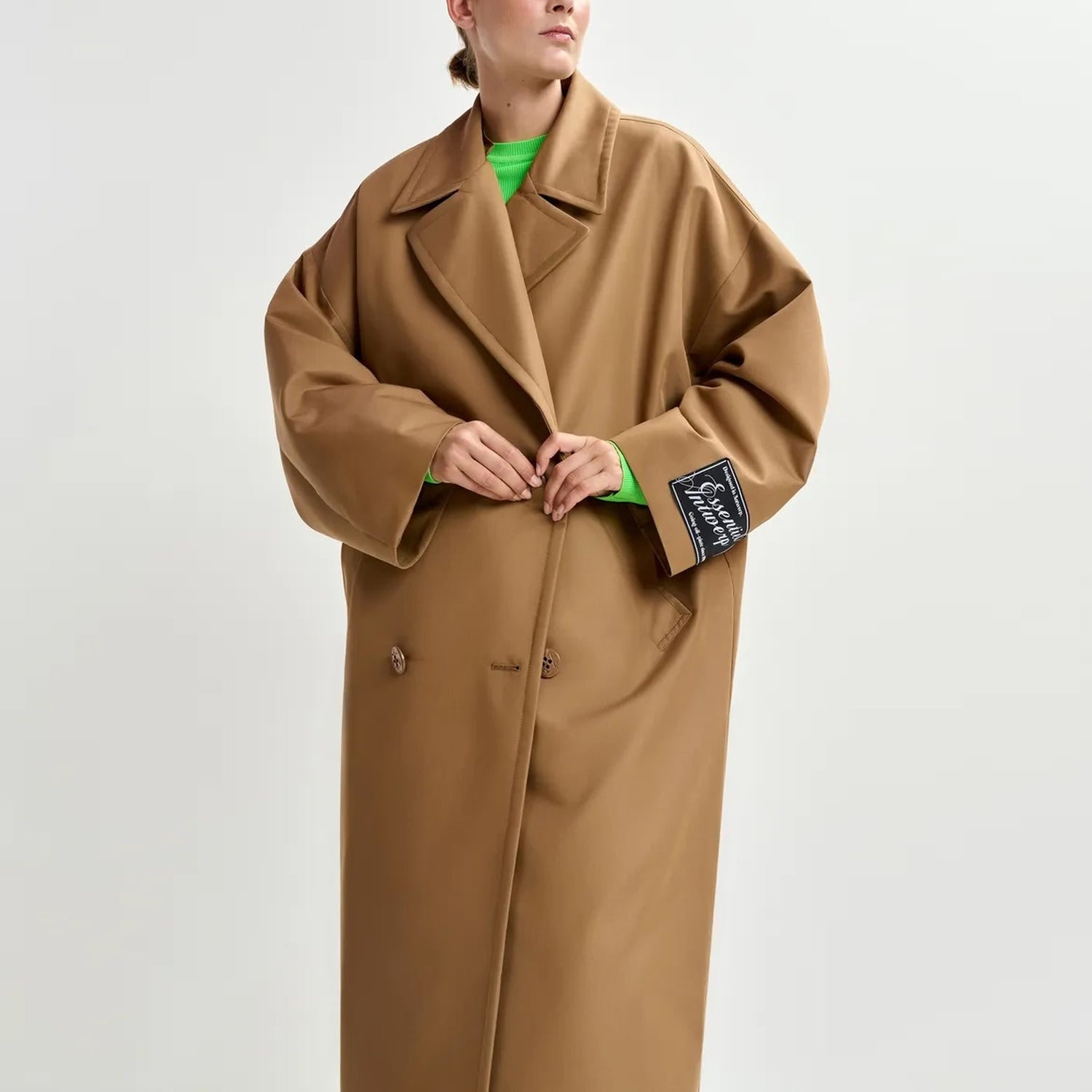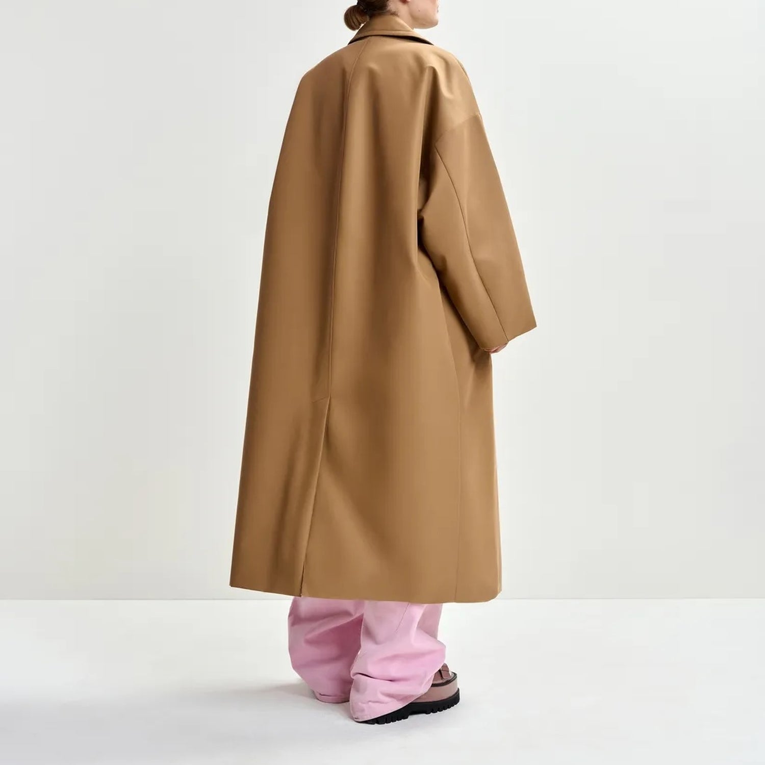 This double-breasted trench coat is designed with an oversized silhouette, dropped shoulders, and slanted pockets for a relaxed yet stylish look. A back slit ensures ease of movement, while a branded label on the sleeve cuff adds a signature detail. Fully padded for extra warmth and comfort, it’s both practical and effortlessly chic.